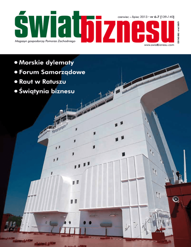czerwiec – lipiec 2013 . nr 6-7 [139-140] Magazyn gospodarczy Pomorza Zachodniego www.swiatbiznesu.com czerwiec - lipiec 2013 1 czer wiec - lipiec 2013 · nr 6-7 [139-140] Członek Północnej Izby Gospodarczej Adres redakcji Świat Biznesu pl. Hołdu Pruskiego 8 70-550 Szczecin tel. 91/4429275 fax 91/8854803 [email protected] Redaktor naczelny Włodzimierz Abkowicz tel. 91/4429275 Zespół redakcyjny Michał Abkowicz Mieczysław Manik Łucja Pawłowska Paweł Stężała Magdalena Szczepkowska Stanisław Flejterski Wojciech Olejniczak Aneta Zelek Skład kolumn tel. 603557311 [email protected] Druk i naświetlanie „Rex-Druk”, ul. Dębogórska 34 71-717 Szczecin tel. 91/4281111 Redakcja nie zwraca materiałów niezamówionych oraz zastrzega sobie prawo opracowania redakcyjnego tekstów przyjętych do druku Redakcja nie odpowiada za merytoryczną treść reklam, ogłoszeń i tekstów sponsorowanych „Świat Biznesu” w Internecie: www.swiatbiznesu.com 2 czerwiec - lipiec 2013 czerwiec - lipiec 2013 forum s. 6 Tegorocznej wymianie poglądów na dziewiątym Forum Samorządowym, organizowanym w dniach 3-4 czerwca w Kołobrzegu, towarzyszyć będzie hasłoprzewodnie - Wzrost i rozwój potencjału Europy poprzez inwestycje w innowacyjną i konkurencyjną gospodarkę regionów. W przededniu forum rozmawiamy o niektórych tematach, które zostaną poruszone w Kołobrzegu, z prof. Krystyną Brzozowską, prodziekan, kierownik Katedry Finansów Publicznych Wydziału Zarządzania i Ekonomiki Usług Uniwersytetu Szczecińskiego, Olgierdem Geblewiczem, marszałkiem województwa zachodniopomorskiego, Sławomirem Pajorem, prezydentem Stargardu Szczecińskiego i Andrzejem Wyganowskim, wójtem Stepnicy. ZPSB: świątynia biznesu s. 10 „Świat Biznesu” rozmawia z prof. dr hab. Anetą Zelek, prorektorem ds. rozwoju Zachodniopomorskiej Szkoły Biznesu o 20-leciu uczelni. Koktajl biznesowy s. 30 Składnikami koktajlu są w tym wydaniu: Złote Lunety - nagrody Obserwatora Morskiego, Raut Europejski Business Clubu Szczecin, Piknik nad Odrą, Polsko-Niemieckie Targi Gospodarcze w Policach, pierwsi najemcy w North-West Logistics Park i rozbudowa szczecińskiego zakładu firmy kk-electronic. Wydarzy się jutro s. 36 28. Międzynarodowy memoriał szachowy im. Tadeusza Gniota rozegrany zostanie w lipcu w Klubie Nauczyciela w Policach. Druga edycja Mistrzostw Polski w dwuboju golfowo-brydżowym s. 37 przyciągnie miłośników tych dyscyplin na pole golfowe w Binowie. Radość Karola Marksa Biznes bez iluzji Anety Zelek. s. 38 Polska to taka dziwna kraj Na przekór Wojciecha Olejniczaka. Stali felietoniści Monika Gerlicka Na okładce: W Szczecinie w dniach 13-15 czerwca odbędzie się I Kongres Morski – spotkanie świata biznesu, nauki i polityki ze sfery szeroko rozumianej gospodarki morskiej fot. Dariusz Gorajski Samorządowe portfele region i gospodarka ul. Cukrowa 45-5 71-004 Szczecin tel. 91/8854804 fax 91/8854803 felieton Wydawca ABKOWICZ PRESS s. 4 „W dwa ognie” z Pawłem Szynkarukiem, dyrektorem naczelnym Polskiej Żeglugi Morskiej oraz Dariuszem Więcaszkiem, prezesem Północnej Izby Gospodarczej, pomysłodawcami i organizatorami I Kongresu Morskiego grają Magdalena Szczepkowska i Włodzimierz Abkowicz. Quo vadis, praco? s. 39 Rozważania na czasie Stanisława Flejterskiego. Menadżerowie od A do Z Lektury „Świata Biznesu”: „Klub 100 - Monografia Zachodniopomorskich Menadżerów”. Twarze biznesu s. 40 Na pytania z naszego kwestionariusza odpowiadają Agnieszka Łabucka, dyrektor I Oddziału GBS Banku w Szczecinie i Janusz Motyliński, prezes Zarządu Morskiego Portu Police. Karuzela kadrowa Namiętność wytańczona s. 41 s. 42 Pierwszy od wielu lat spektakl baletowy przygotowany przez zespół Opery na Zamku spotkał się z gorącym przyjęciem publiczności. Następczynie Żakliny i Ilony poszukiwane s. 43 18 finalistek zaprezentuje się jurorom i publiczności podczas czerwcowej kulminacji konkursu Miss Polonia Ziemi Zachodniopomorskiej. Rejs z biznesem s. 44 Imprezy firmowe dla pracowników i spotkania z kontrahentami na pokładzie statku Odra Queen - to sposób na dobry klimat w biznesie. Jakub Ossowski wygrywa Floating Garden Szczecin Open Presented by Grupa Azoty to najstarsze w Polsce zmagania profesjonalnych golfistów. W Reczu na dwóch kółkach s. 46 Na początku roku ruszyła kolejna edycja Grand Prix Pomorza Zachodniego w brydżu sportowym. Cykl, który już w maju osiągnął półmetek, obejmuje 12 ważniejszych turniejów rozgrywanych na terenie naszego województwa. Jak doktor z doktorem W gościnnych salach hotelu Novotel Szczecin Centrum rozegrano po raz drugi wielomecz branżowy w brydżu sportowym. 3 personalia Tym razem nasz magazyn ukazuje się w przededniu dwóch istotnych wydarzeń gospodarczych organizowanych na Pomorzu Zachodnim. W dniach 3-4 czerwca w Kołobrzegu odbędzie się 9. Forum Samorządowe organizowane przez Urząd Marszałkowski przy współudziale Uniwersytetu Szczecińskiego. W dyskusji redakcyjnej pt. „Samorządowe portfele” poprzedzającej Forum rozmawialiśmy z reprezentantami samorządu i świata nauki m.in. o finansach i zdolnościach inwestycyjnych samorządów w sytuacji spowolnienia gospodarczego. Drugim znaczącym wydarzeniem będzie I Kongres Morski, który organizuje od 13 do 15 czerwca Północna Izba Gospodarcza wraz z Polską Żeglugą Morską. Na naszych łamach rozmawiamy z Pawłem Szynkarukiem, dyrektorem PŻM i Dariuszem Więcaszkiem, prezesem Północnej Izby Gospodarczej. Zacytujmy tylko dwie wypowiedzi naszych rozmówców. - Chcemy, by rządzący traktowali nas jako swoisty think tank szerszej myśli ekonomicznej szeroko pojętej gospodarki morskiej – mówi Dariusz Więcaszek. - Zamierzamy uzmysłowić politykom efekty powiązań między różnymi sektorami gospodarki – uważa Paweł Szynkaruk. - To, jaki wpływ na inne sektory gospodarki mają porty i żegluga. W najnowszym wydaniu naszego magazynu piszemy te