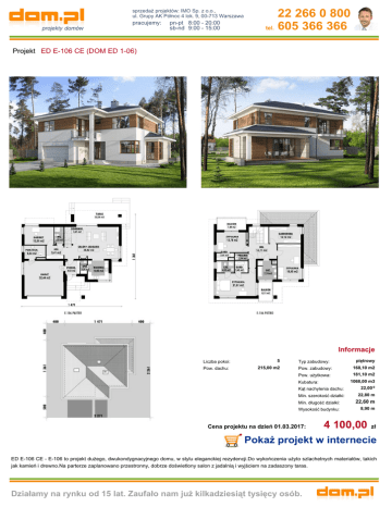 sprzedaż projektów: IMO Sp. z o.o., ul. Grupy AK Północ 4 lok. 9, 00-713 Warszawa pracujemy: pn-pt 8:00 - 20:00 sb-nd 9:00 - 15:00 22 266 0 800 tel. 605 366 366 Projekt ED E-106 CE (DOM ED 1-06) Informacje Liczba pokoi: Pow. dachu: 5 215,00 m2 Typ zabudowy: Pow. zabudowy: Pow. użytkowa: piętrowy 168,10 m2 181,10 m2 1068,00 m3 Kubatura: Kąt nachylenia dachu: 22,00 0 Min. szerokość działki: 22,80 m Min. długość działki: 22,60 m Wysokość budynku: 8,90 m Cena projektu na dzień 01.03.2017: 4 100,00 zł Pokaż projekt w internecie ED E-106 CE - E-106 to projekt dużego, dwukondygnacyjnego domu, w stylu eleganckiej rezydencji.Do wykończenia użyto szlachetnych materiałów, takich jak kamień i drewno.Na parterze zaplanowano przestronny, dobrze doświetlony salon z jadalnią i wyjściem na zadaszony taras. Działamy na rynku od 15 lat. Zaufało nam już kilkadziesiąt tysięcy osób.
