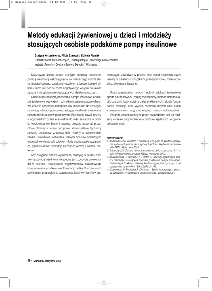 17 Grazyna Korzeniewska 04-12-2006 12:45 Page 48 Metody edukacji ˝ywieniowej u dzieci i m∏odzie˝y stosujàcych osobiste podskórne pompy insulinowe Gra˝yna Korzeniewska, Alicja Szewczyk, El˝bieta Piontek Oddzia∏ Chorób Metabolicznych, Endokrynologii i Diabetologii Kliniki Pediatrii Instytut „Pomnik – Centrum Zdrowia Dziecka“, Warszawa Kluczowym celem terapii cukrzycy osobistà podskórnà pompà insulinowà jest osiàgni´cie jak najbli˝szego normie stanu metabolicznego, uzyskanie mo˝liwie najlepszej kontroli glikemii, która nie b´dzie mia∏a negatywnego wp∏ywu na jakoÊç ˝ycia ani nie spowoduje niepo˝àdanych dzia∏aƒ ubocznych. Obok terapii osobistà podskórnà pompà insulinowà edukacja ˝ywieniowa jest wa˝nym czynnikiem zapewniajàcym w∏aÊciwe leczenie i popraw´ samopoczucia pacjentów. Na szczególnà uwag´ w terapii pompowej zas∏uguje mo˝liwoÊç stosowania ró˝norodnych bolusów posi∏kowych. Roz∏o˝enie dawki insuliny w odpowiednim czasie adekwatnie do iloÊci zawartych w posi∏ku w´glowodanów, bia∏ek i t∏uszczy, pozwala utrzymaç prawid∏owà glikemi´ w terapii pompowej. Wykorzystanie tej funkcji pozwala dostarczyç w∏aÊciwà iloÊç insuliny w odpowiednim czasie. Prawid∏owe stosowanie ró˝nych bolusów posi∏kowych jest mo˝liwe wtedy, gdy dziecko, m∏oda osoba u˝ytkujàca pomp´, jej opiekunowie posiadajà niezb´dnà wiedz´ z zakresu dietetyki. Aby osiàgnàç dobrze wyrównanà cukrzyc´ w terapii podskórnà pompà insulinowà niezb´dne jest zdobycie umiej´tnoÊci w zakresie: ró˝nicowania w´glowodanów, prawid∏owego komponowania posi∏ków (w´glowodany, bia∏ka, t∏uszcze w odpowiednich proporcjach), szacowania iloÊci wymienników po- 48 • Standardy Medyczne 2006 karmowych zawartych w posi∏ku oraz zasad obliczania dawki insuliny w zale˝noÊci od glikemii przedposi∏kowej, rodzaju posi∏ku, aktywnoÊci fizycznej. Praca przedstawia metody i techniki edukacji ˝ywieniowej oparte na: obserwacji (zabieg metodyczny, metoda demonstracji), dzia∏aniu (laboratoryjna, zaj´ç praktycznych), s∏owie (pogadanka, dyskusja, opis, wyk∏ad, rozmowa indywidualna, praca z broszurami informacyjnymi, ksià˝ka), metody multimedialne. Program przedstawiony w pracy przewidziany jest do realizacji w czasie pobytu dziecka w oddziale szpitalnym i w opiece ambulatoryjnej. PiÊmiennictwo: 1. Kunachowicz H, Nadolna I, Iwanow K, Przygoda B. WartoÊç od˝ywcza wybranych produktów i typowych potraw. Wydawnictwo Lekarskie PZWL, Warszawa 2003. 2. Tatoƒ J (red.). Zdrowe i smaczne ˝ywienie osób z cukrzycà i ich rodzin. Wydawnictwo Lekarskie PZWL, Warszawa 2003. 3. Korzeniewska G, Szewczyk A, Piontek E. Edukacja ˝ywieniowa dzieci i m∏odzie˝y stosujàcych osobiste podskórne pompy insulinowe. Diabetologia Polska – materia∏y konferencyjne „Cukrzyca typu 1 od patogenezy do powik∏aƒ“ ¸ódê 2006, 2: 102. 4. Ciborowska H, Rudnicka A. Dietetyka – ˚ywienie zdrowego i chorego cz∏owieka. Wydawnictwo Lekarskie PZWL, Warszawa 2004. 17 Grazyna Korzeniewska 04-12-2006 12:45 Page 49 Methods of nutrition education in children and adolescents using subcutaneous insulininfusion pumps Gra˝yna Korzeniewska, Alicja Szewczyk, El˝bieta Piontek Department of Metabolic Diseases, Endocrinology and Diabetology, Clinic of Paediatrics, Children’s Health Memorial Institute, Warszawa The key goal of diabetes treatment with a subcutaneous insulin infusion pump is reaching metabolic control close to normal, reaching the best attainable glycaemia control without negative influence on quality of life or undesirable side effects. Next to therapy with subcutaneous infusion pumps nutrition education is an important factor providing for proper therapeutic management and improvement of patients’ mood. Pump therapy offers the possibility of using various meal boluses. Distribution of insulin dose adequately to the content of carbohydrates, proteins and fats in meals allows to keep normal glycaemia in the pump therapy. This function allows for providing correct insulin dose in proper time. Correct use of various meal boluses is possible when the child, adolescent or care providers have necessary knowledge of dietetics. In order to reach a well controlled diabetes in subcutaneous insulin infusion pump therapy it is necessary to be able to differentiate carbohydrates, properly plan meals (right proportions of carbohydrates, proteins and fats), to estimate the content of carbohydrate exchanges in meals and to calculate insulin dose depending on preprandial glycaemia, type of meal and physical activity. The study presents methods and techniques of nutrition education based on: observation (methodological procedure, demonstration method), activity (laboratory, practical activities), word (talk, discussion, description, lecture, individual interview, brochures, books), multimedia. The program presented in the study is foreseen to be realized during child’s hospitalization and in outpatient care. References: 1. Kunachowicz H, Nadolna I, Iwanow K, Przygoda B. „WartoÊç od˝ywcza wybranych produktów i typowych potraw“. Wydawnictwo Lekarskie PZWL, Warszawa 2003. 2. Tatoƒ J (red.): „Zdrowe i smaczne ˝ywienie osób z cukrzycà i ich rodzin“. Wydawnictwo Lekarskie PZWL, Warszawa 2003. 3. Korzeniewska G, Szewczyk A, Piontek E. „Edukacja ˝ywieniowa dzieci i m∏odzie˝y stosujàcych osobiste podskórne pompy insulinowe“. Diabetologia Polska – materia∏y konferencyjne „Cukrzyca typu 1 od patogenezy do powik∏aƒ“ ¸ódê 2006, 2: 102. 4. Ciborowska H, Rudnicka A. „Dietetyka – ˚ywienie zdrowego i chorego cz∏owieka“. Wydawnictwo Lekarskie PZWL, Warszawa 2004. 2006, Standardy Medyczne • 49