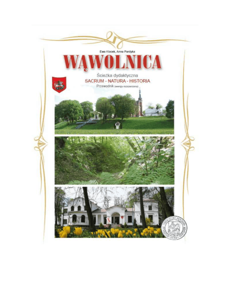Ścieżka dydaktyczna SACRUM- NATURA- HISTORIA Zarzeka- Wąwolnica- Kębło (cz. 1) Wiosną 2009 roku w krajobrazie wąwolnickiej gminy pojawiło się 16 tablic będących przystankami ścieżki dydaktycznej prowadzącej z Nałęczowa przez Zarzekę i Wąwolnicę do Kębła. Trasa samej ścieżki liczy 6 kilometrów, zaś wraz z 2,5 kilometrowym odcinkiem łączącym ją z centrum Nałęczowa - 8,5 kilometra. Droga ta doskonale znana jest tutejszym mieszkańcom. Od wielu lat korzystają z niej również kuracjusze i goście z pobliskiego Nałęczowa. Wśród nich znalazł się również sam Ryszard Kapuściński, który rozpoczynając opis swego spaceru tą drogą słowami „Gdy idzie się z Nałęczowa do Wąwolnicy słychać jak ziemia śpiewa ...” (Akcent, 1996, nr 4) wyraził swój zachwyt przede wszystkim nad pięknem natury, która jest niewątpliwym atutem naszych okolic. Do tej pory dla przybysza z zewnątrz, ale i dla niejednego wąwolniczanina wspaniałe dziedzictwo kulturowe i przyroda tych terenów pozostawały w dużej mierze nieznane. Brak ten stara się uzupełnić omawiana ścieżka. Jej przebycie zapewne umożliwi poznanie wielowiekowej historii Wąwolnicy i okolic, pomoże odkryć wspaniałe zabytki sztuki, pozwoli „dotknąć” Sacrum, jakie jest z wąwolnickim Sanktuarium Maryjnym związane, pobudzi wyobraźnię lokalnymi legendami, ułatwi odkrycie ciekawostek natury. Ścieżka powstała z inicjatywy nauczycielek ze Szkoły Podstawowej w Wąwolnicy i jej autorek zarazem - Ewy Klocek (przyroda), u której pomysł ścieżki się narodził i Anny Pardyki (historia), dzięki której ścieżka ta weszła na drogę realizacji. Przedsięwzięcie to prowadzone jest w ramach działalności Regionalnego Towarzystwa Przyjaciół Wąwolnicy przy szczególnym zaangażowaniu Prezes Towarzystwa Wiesławy Dybały i przy organizacyjnym wsparciu członków Towarzystwa, nauczycieli, pracowników gminy i innych osób: Wójta Gminy Wąwolnica Waldemara Pietraka, Agnieszki Lenartowicz, Edyty Furtak - Łuki, Ewy Niezabitowskiej, Marty Przewłoki oraz przy technicznej pomocy ze strony Aleksandra Delika, Bogusława Chmielnickiego oraz strażaków OSP i pracowników Zakładu Usług Komunalnych w Wąwolnicy: Stanisława Furtaka, Eugeniusza Kolibskiego, Grzegorza Gajkosia, Romana Garwolińskiego, Jerzego Łuszczyńskiego. Tablice ścieżek ozdobiły zdję- cia Blanki Skowronek Kolibskiej, Moniki Pakuły, Krzysztofa Wasilewskiego i Wojciecha Skowronka. Praca nad ścieżką miała charakter społeczny. Ze środków Towarzystwa sfinansowana została drewniana obudowa tablic i wydruk ich treści. Na ten cel środki finansowe Towarzystwo pozyskało przede wszystkim z Urzędu Gminy Wąwolnica, który jest jego głównym sponsorem oraz od innych osób i instytucji, właścicieli gospodarstw agroturystycznych i miejscowych przedsiębiorców, których dane znajdują się zarówno na poszczególnych tablicach w terenie jak i przy poniższej mapce ścieżki oraz w wykazie sponsorów Towarzystwa z 2008 roku. W przygotowaniu ścieżki wykorzystano wyniki kwerend źródłowych, relacje mieszkańców oraz wiedzę z zakresu historii i historii sztuki opracowaną przede wszystkim przez mgr Jadwigę Teodorowicz - Czerepińską oraz prof. Ryszarda Szczygła, prof. Irenę Kutyłowską, mgr Agnieszkę Łagunę Chevillotte, a także ks. infułata Jana Pęzioła, które to osoby zechciały również osobiście konsul- tować treść ścieżki. Dzięki temu upowszechniona została nieznana do tej pory szerszemu gronu odbiorców bardzo ciekawa wiedza na temat np. wąwolnickiego fortalitium, polokacyjnego układu pól, kominów arkadowych w budynkach przy ul. Zamkowej (J. Teodorowicz - Czerepińska), Starego Miasta i zameczku - castrum na wąwolnickim Wzgórzu Kościelnym (I. Kutyłowska), rzeźby Matki Boskiej Wąwolnickiej (Agnieszka Łaguna - Chevillotte). Piszącej te słowa, za wiedzę historyczną odpowiedzialnej, udało się np. dotrzeć do legendy o Dzwonnej Górze (dzięki uczniom - Adrianowi i Damianowi Gąskom), zdobyć informacje na temat okoliczności wystawienia krzyża z patriotycznymi napisami w Kościelnym Dole i wystawienia budynku szkolnego, dzięki relacjom Kazimierza Figla i Marcjanny Bitkowskiej ustalić nowe fakty związane z jedyną w okolicy wpisaną do rejestru zabytków kapliczką przydrożną projektu Stanisława Koszczyc - Witkiewicza, czy wreszcie upowszechnić rok 1486 potwierdzający pośrednio istnienie świątyni w Kę- ble, będącej wyrazem średniowiecznych korzeni kultu Matki Bożej Kębelskiej. W dalszych planach uwzględnione jest wydanie przewodnika do ścieżki w wersji rozszerzonej (obecnie dostępne jest wydanie folderowe - tzw. składanka) wraz z literaturą. Wszystkim osobom, które przyczyniły się do powstania ścieżki składamy serdeczne podziękowania i zapraszamy do osobistego poznania walorów tego szlaku. Osoby zaangażowane przy tworzeniu ścieżki dydaktycznej: (Od lewej): Wiesława Dybała (Prezes Regionalnego Towarzystwa Przyjaciół Wąwolnicy), Edyta Furtak - Łuka, Krzysztof Wasilewski, Ewa Klocek (współautorka), Blanka Skowronek - Kolibska, Agnieszka Lenartowicz, Tadeusz Lenartowicz, Ewa Niezabitowska, Waldemar Pietrak (Wójt Gminy Wąwolnica), Anna Pardyka (współautorka), Eugeniusz Kolibski, Marta Przewłoka, Wojciech Skowronek. Trasa i przystanki ścieżki B A Przystanek A. Tablica wstępna - (współfundator - Bank Spółdzielczy w Nałęczowie) Przystanek B. Tablica wstępna, informacyjna- (współfundator - Oberża koło Beczki. Tradycyjna Kuchnia Polska, ul. Dulęby 15, Wąwolnica, tel. 0 502679833) Przystanek 1. Gościniec - trakt królewski, widok na Dzwonną Górę Przystanek 2. Widok na dolinę rzeki Bystrej Przystanek 3. Bród na Zarzece, widok na cmentarz żydowski i fortalitium Przystanek 4. Kapliczka projektu Jana Koszczyc - Witkiewicza przy moście na Bystrej (współfundator Ewa Kołodyńska i Piotr Gąsiorowski. Zarzeka) Przystanek 