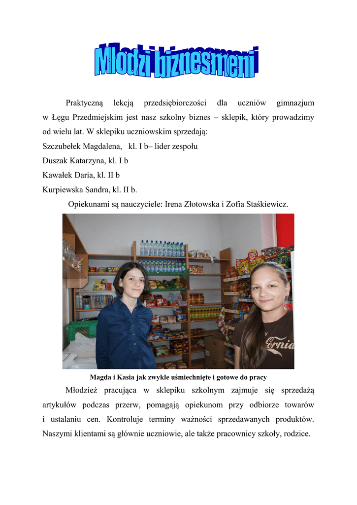 Praktyczną lekcją przedsiębiorczości dla uczniów gimnazjum w Łęgu Przedmiejskim jest nasz szkolny biznes – sklepik, który prowadzimy od wielu lat. W sklepiku uczniowskim sprzedają: Szczubełek Magdalena, kl. I b– lider zespołu Duszak Katarzyna, kl. I b Kawałek Daria, kl. II b Kurpiewska Sandra, kl. II b. Opiekunami są nauczyciele: Irena Złotowska i Zofia Staśkiewicz. Magda i Kasia jak zwykle uśmiechnięte i gotowe do pracy Młodzież pracująca w sklepiku szkolnym zajmuje się sprzedażą artykułów podczas przerw, pomagają opiekunom przy odbiorze towarów i ustalaniu cen. Kontroluje terminy ważności sprzedawanych produktów. Naszymi klientami są głównie uczniowie, ale także pracownicy szkoły, rodzice. Sandra i Daria liczą utarg Sprzedajemy artykuły papiernicze, przybory szkolne i artykuły żywnościowe. Codziennie dostarczane jest pieczywo – świeże bułki i rogaliki. W ramach działań profilaktyki zdrowotnej zaopatrujemy sklepik w artykuły o wysokich walorach zdrowotnych: wodę mineralną, soki owocowe, jogurty, kanapki, suszone owoce. Można u nas kupić również świeże owoce. Nasza oferta Zorganizowaliśmy również akcję oznakowania produktów według wartości odżywczej. Dzięki tej akcji uczymy naszych klientów dokonywania świadomych wyborów podczas robienia zakupów, zachęcamy do właściwego odżywiania się. Współpracujemy z realizatorami programu „ Trzymaj formę”. Praca w sklepiku rozwija zainteresowania handlem i inną działalnością usługową. Kształtuje nawyki gospodarności i nasze umiejętności zespołowego działania. Przede wszystkim jest świetną przygodą. Nauczyciele naszej szkoły prowadzą również inne działania aby przygotować uczniów do aktywnego funkcjonowania na rynku pracy w przyszłości. W pierwszym semestrze, w ramach lekcji dodatkowych, odbywały się zajęcia z przedsiębiorczości, na których młodzież poznała mechanizmy funkcjonowania gospodarki rynkowej. Opracowała dekalog kreowania własnego pozytywnego wizerunku i planowała własną drogę zawodową. Miała możliwość poznania różnych form aktywności zawodowej. Uczniowie przedstawiali różne pomysły na założenie własnej firmy. W czasie ferii zimowych, dla zainteresowanych uczniów, nauczycielka wiedzy o społeczeństwie – Zofia Staśkiewicz przeprowadziła zajęcia z orientacji zawodowej. Uczniowie pisali test dotyczący rozpoznawania predyspozycji zawodowych. Nasze gimnazjum odwiedzili również specjaliści – doradcy zawodowi z Centrum Planowania Kariery Zawodowej w Ostrołęce, którzy również badali predyspozycje zawodowe uczniów klas trzecich oraz przeprowadzili zajęcia dotyczące rynku pracy. Młodzież otrzymała ulotki i mogła osobiście porozmawiać z doradcami. Klasy trzecie wzięły też udział w targach edukacyjnych w Ostrołęce w dniu 29 marca 2012 roku, gdzie prezentowały się szkoły ponadgimnazjalne naszego regionu. Uczniowie rozwijają swoje umiejętności przedsiębiorcze uczestnicząc w obowiązkowym projekcie edukacyjnym w klasach drugich.