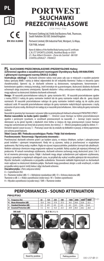 PL SŁUCHAWKI PREZECIWHAŁASOWE CODE: PW42 - PS42 Portwest Clothing Ltd, Fields End Business Park, Thurnscoe, South Yorkshire S63 0JF, United Kingdom EN 352-3:2002 Portwest Limited, IDA Industrial Park, Westport, Co Mayo, F28 FY88, Ireland Name & Address of the Notified Body having issue EC certificate: C.R.I.T.T SPORTS LOISIRS, Notified Body nr 0501 21, Rue Albert Einstein - Zone du Sanital - 86100 CHATELLERAULT - FRANCE PL SŁUCHAWKI PRZECIWHAŁASOWE (PRZEMYSŁOWE Hełmy ochronne) zgodne z zasadniczymi wymogami Dyrektywy Rady 89/686/EWG i głównymi wymogami normy EN352-3:2002 Instrukcja obsługi : Słuchawki ochronne należy nosić przez cały czas w miejscach o wysokim poziomie hałasu (powyżej 80dB) i należy je dobrać odpowiednio do ich wskaźnika tłumienia i hałasu w otoczeniu (patrz charakterystyka). Upewnić się, że słuchawki ochronne są dostosowane, wyregulowane, konserwowane i kontrolowane zgodnie z niniejszą instrukcją. Jeżeli instrukcje nie są przestrzegane, skuteczność działania słuchawek ochronnych ulega znacznemu zmniejszeniu. Oprawki okularów i włosy umieszczone między poduszkami i głową mogą wpływać na skuteczność działania słuchawek ochronnych. Uwaga : W nauszniki przeciwhałasowe należą do gamy rozmiarów M/L. W nauszniki przeciwhałasowe zgodne z normą EN352-3 należą do gamy rozmiarów średnich lub do gamy rozmiarów małych albo do gamy dużych rozmiarach. W nauszniki przeciwhałasowe należące do gamy rozmiarów średnich nadają się do użytku przez większość osób. W nauszniki przeciwhałasowe należące do gamy rozmiarów małych/dużych opracowano z myślą używania ich przez osoby, dla ktorych nie nadają się w nauszniki przeciwhałasowe , które należą do gamy rozmiarów średnich Nauszniki te powinny być mocowane i używane tylko na przemysłowych hełmach ochronnych PW50/PW51/PW57. Montaż nauszników na kasku (patrz rysunki): 1 – Umieścić czasze tłumiące na hełmie przeciwhałasowym zgodnie z poniższymi rysunkami, w szczelinach przeznaczonych na nauszniki. 2 – Zacisnąć (części nauszne skierowane są ku górze) łączniki z obydwóch stron hełmu w miejscu do tego przeznaczonym (czasze tłumiące mogą być zamontowane po lewej lub po prawej stronie, bez różnicy). 3 – Obrócić przegubowy pałąk ku dołowi. 4 – Ostrożnie opuścić czasze na uszy. 5 – Przesunąć czasze tak, by znalazły się dokładnie w pozycji, w której zapewniona jest ochrona przed hałasem. Skład: Czasza: ABS / Poduszka uszczelniająca: Pianka / Pałąk: Stal nierdzewna Przechowywanie / Konserwacja / Ograniczenia stosowania : Przechowywać słuchawki ochronne przed i po każdym użyciu, w miejscu chłodnym, suchym i zabezpieczonym przed światłem i ujemnymi temperaturami. Kiedy nie są używane, należy je przechowywać w oryginalnym opakowaniu. Myć letnią wodą z mydłem. Nigdy nie używać rozpuszczalników, produktów ściernych lub szkodliwych. Niektóre substancje chemiczne mogą negatywnie wpływać na produkt. Należy uzyskać jak najwięcej informacji od producenta. W ramach normalnego użytkowania, słuchawki ochronne zachowują swoją skuteczność przez 2 do 3 lat od momentu pierwszego użycia. Pałąki i słuchawki mogą ulegać uszkodzeniom pod wpływem użytkowania, należy je sprawdzać w regularnych odstępach czasu, na przykład aby wykryć wszelkie pęknięcia lub nieszczelności. Wycofać słuchawki z użytkowania w przypadku uszkodzenia. Stosowanie nakładek higienicznych na słuchawkach może wpływać na skuteczność działania pałąka. Słuchawki mogą powodować alergie u osób wrażliwych, w takim przypadku nalezy opuścić strefę hałasu i zdjąć słuchawki ochronne. Charakterystyka : (Patrz załączona tabela) A = Częstotliwość (Hz) B = Tłumienie średnie (dB) / C = Odchylenie standardowe (dB) / D = Ochrona skuteczna (dB) Tłumienie w dB : L = Niskie częstotliwości (niskie tony) / M = Średnie częstotliwości H = Wysokie częstotliwości (wysokie tony) / SNR = Tłumienie średnie PERFORMANCES - SOUND ATTENUATION PW42/PS42 A B C D Frequency (Hz) Mean Attenuation (dB) Standard Deviation (dB) Assumed Protection (dB) SNR 26dB 63 12.4 5.2 7.2 125 14.4 4.9 9.4 250 17.9 4.5 13.4 500 27.3 4.2 23.1 1000 34.1 4.2 29.9 2000 34.8 4.5 30.4 080-USP-ED-01 4000 8000 32.8 32.3 4.6 6.4 28.2 26.0 H: 29 M: 24 L: 16 080-USP-ED -01