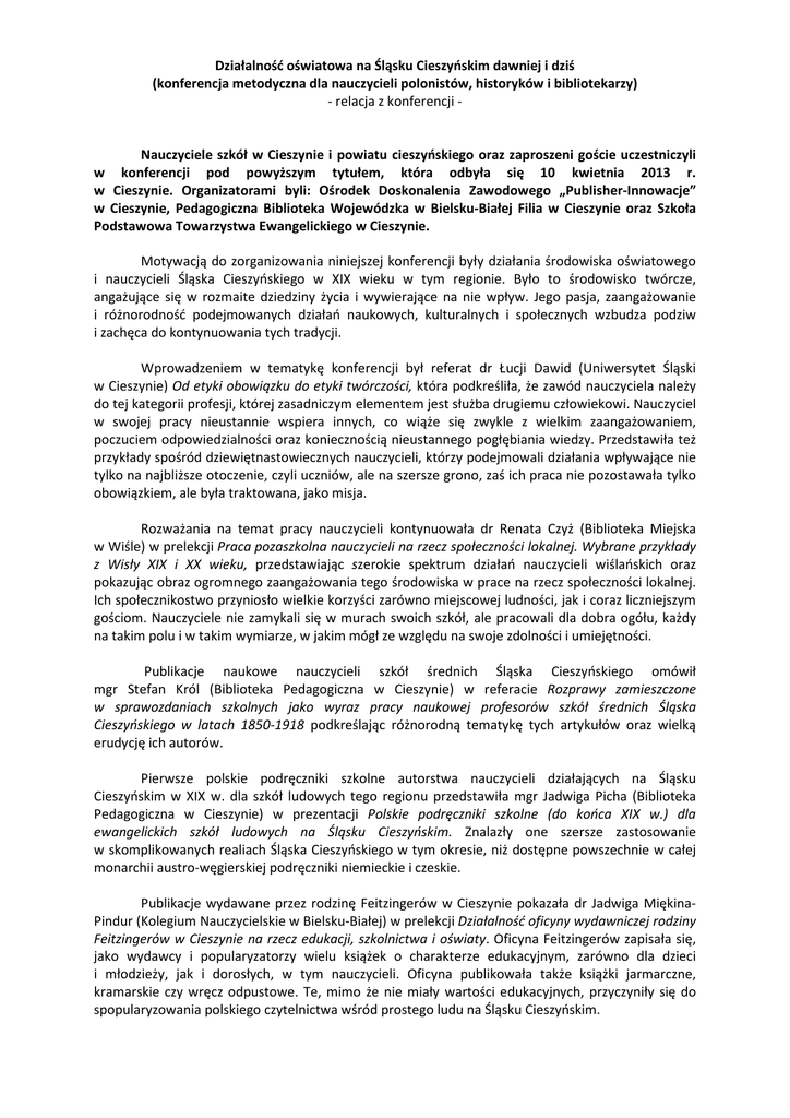 Działalność oświatowa na Śląsku Cieszyńskim dawniej i dziś (konferencja metodyczna dla nauczycieli polonistów, historyków i bibliotekarzy) - relacja z konferencji - Nauczyciele szkół w Cieszynie i powiatu cieszyńskiego oraz zaproszeni goście uczestniczyli w konferencji pod powyższym tytułem, która odbyła się 10 kwietnia 2013 r. w Cieszynie. Organizatorami byli: Ośrodek Doskonalenia Zawodowego „Publisher-Innowacje” w Cieszynie, Pedagogiczna Biblioteka Wojewódzka w Bielsku-Białej Filia w Cieszynie oraz Szkoła Podstawowa Towarzystwa Ewangelickiego w Cieszynie. Motywacją do zorganizowania niniejszej konferencji były działania środowiska oświatowego i nauczycieli Śląska Cieszyńskiego w XIX wieku w tym regionie. Było to środowisko twórcze, angażujące się w rozmaite dziedziny życia i wywierające na nie wpływ. Jego pasja, zaangażowanie i różnorodność podejmowanych działań naukowych, kulturalnych i społecznych wzbudza podziw i zachęca do kontynuowania tych tradycji. Wprowadzeniem w tematykę konferencji był referat dr Łucji Dawid (Uniwersytet Śląski w Cieszynie) Od etyki obowiązku do etyki twórczości, która podkreśliła, że zawód nauczyciela należy do tej kategorii profesji, której zasadniczym elementem jest służba drugiemu człowiekowi. Nauczyciel w swojej pracy nieustannie wspiera innych, co wiąże się zwykle z wielkim zaangażowaniem, poczuciem odpowiedzialności oraz koniecznością nieustannego pogłębiania wiedzy. Przedstawiła też przykłady spośród dziewiętnastowiecznych nauczycieli, którzy podejmowali działania wpływające nie tylko na najbliższe otoczenie, czyli uczniów, ale na szersze grono, zaś ich praca nie pozostawała tylko obowiązkiem, ale była traktowana, jako misja. Rozważania na temat pracy nauczycieli kontynuowała dr Renata Czyż (Biblioteka Miejska w Wiśle) w prelekcji Praca pozaszkolna nauczycieli na rzecz społeczności lokalnej. Wybrane przykłady z Wisły XIX i XX wieku, przedstawiając szerokie spektrum działań nauczycieli wiślańskich oraz pokazując obraz ogromnego zaangażowania tego środowiska w prace na rzecz społeczności lokalnej. Ich społecznikostwo przyniosło wielkie korzyści zarówno miejscowej ludności, jak i coraz liczniejszym gościom. Nauczyciele nie zamykali się w murach swoich szkół, ale pracowali dla dobra ogółu, każdy na takim polu i w takim wymiarze, w jakim mógł ze względu na swoje zdolności i umiejętności. Publikacje naukowe nauczycieli szkół średnich Śląska Cieszyńskiego omówił mgr Stefan Król (Biblioteka Pedagogiczna w Cieszynie) w referacie Rozprawy zamieszczone w sprawozdaniach szkolnych jako wyraz pracy naukowej profesorów szkół średnich Śląska Cieszyńskiego w latach 1850-1918 podkreślając różnorodną tematykę tych artykułów oraz wielką erudycję ich autorów. Pierwsze polskie podręczniki szkolne autorstwa nauczycieli działających na Śląsku Cieszyńskim w XIX w. dla szkół ludowych tego regionu przedstawiła mgr Jadwiga Picha (Biblioteka Pedagogiczna w Cieszynie) w prezentacji Polskie podręczniki szkolne (do końca XIX w.) dla ewangelickich szkół ludowych na Śląsku Cieszyńskim. Znalazły one szersze zastosowanie w skomplikowanych realiach Śląska Cieszyńskiego w tym okresie, niż dostępne powszechnie w całej monarchii austro-węgierskiej podręczniki niemieckie i czeskie. Publikacje wydawane przez rodzinę Feitzingerów w Cieszynie pokazała dr Jadwiga MiękinaPindur (Kolegium Nauczycielskie w Bielsku-Białej) w prelekcji Działalność oficyny wydawniczej rodziny Feitzingerów w Cieszynie na rzecz edukacji, szkolnictwa i oświaty. Oficyna Feitzingerów zapisała się, jako wydawcy i popularyzatorzy wielu książek o charakterze edukacyjnym, zarówno dla dzieci i młodzieży, jak i dorosłych, w tym nauczycieli. Oficyna publikowała także książki jarmarczne, kramarskie czy wręcz odpustowe. Te, mimo że nie miały wartości edukacyjnych, przyczyniły się do spopularyzowania polskiego czytelnictwa wśród prostego ludu na Śląsku Cieszyńskim. Działalność jednej z organizacji oświatowych w Cieszynie omówiła mgr Ewa Mrowiec (Szkoła Podstawowa Towarzystwa Ewangelickiego w Cieszynie) w referacie Towarzystwo Ewangelickie Oświaty Ludowej w Cieszynie i jego sposoby oddziaływania na społeczność Śląska Cieszyńskiego. Program, cele i formy aktywności omawianego zrzeszenia były tworzone, inicjowane oraz realizowane głównie przez przedstawicieli środowiska duchownego i nauczycielskiego, przy znaczącym ich udziale i wkładzie intelektualnym. Jak podkreślono w Statucie organizacji, celem Towarzystwa, które działało od 1881 r. było „szerzenie między ludem ewangelickim polskim oświaty religijnej i ogólnej, w języku polskim, na gruncie chrześcijańsko-ewangelickim”. Konferencję zakończyły warsztaty pedeutologiczne, prowadzone przez dr Łucję Dawid, na których uczestnicy zastanawiali się nad zagadnieniami dotyczącymi nauczycieli, ich osobowości, doboru do zawodu, statusu i kompetencji, kształcenia i doskonalenia w dzisiejszej rzeczywistości. Starano się odpowiedzieć na pytanie, czy obecne trudne realia oświatowe pozwalają na wykonywanie tego zawodu z poświęceniem i poczuciem szczególnej misji. Zainteresowanie konferencją, co potwierdziła liczna frekwencja, wskazuje na potrzebę podejmowania tego rodzaju inicjatyw edukacyjnych. Uczestnictwo w tego typu spotkaniach pozwala na wzbogacenie wiedzy, jak również integruje społeczność nauczycielską. Jadwiga Picha Biblioteka Pedagogiczna w Cieszynie