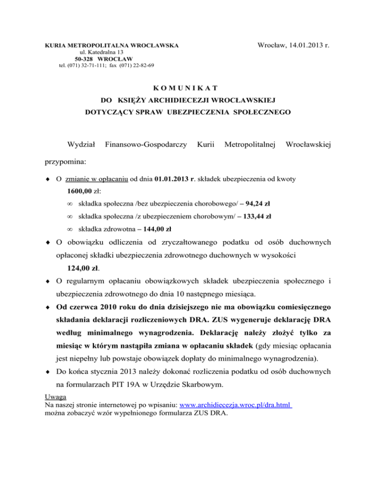 Wrocław, 14.01.2013 r. KURIA METROPOLITALNA WROCŁAWSKA ul. Katedralna 13 50-328 WROCŁAW tel. (071) 32-71-111; fax (071) 22-82-69 KOMUNIKAT DO KSIĘŻY ARCHIDIECEZJI WROCŁAWSKIEJ DOTYCZĄCY SPRAW UBEZPIECZENIA SPOŁECZNEGO Wydział Finansowo-Gospodarczy Kurii Metropolitalnej Wrocławskiej przypomina: ♦ O zmianie w opłacaniu od dnia 01.01.2013 r. składek ubezpieczenia od kwoty 1600,00 zł: • składka społeczna /bez ubezpieczenia chorobowego/ – 94,24 zł • składka społeczna /z ubezpieczeniem chorobowym/ – 133,44 zł • składka zdrowotna – 144,00 zł ♦ O obowiązku odliczenia od zryczałtowanego podatku od osób duchownych opłaconej składki ubezpieczenia zdrowotnego duchownych w wysokości 124,00 zł. ♦ O regularnym opłacaniu obowiązkowych składek ubezpieczenia społecznego i ubezpieczenia zdrowotnego do dnia 10 następnego miesiąca. ♦ Od czerwca 2010 roku do dnia dzisiejszego nie ma obowiązku comiesięcznego składania deklaracji rozliczeniowych DRA. ZUS wygeneruje deklarację DRA według minimalnego wynagrodzenia. Deklarację należy złożyć tylko za miesiąc w którym nastąpiła zmiana w opłacaniu składek (gdy miesiąc opłacania jest niepełny lub powstaje obowiązek dopłaty do minimalnego wynagrodzenia). ♦ Do końca stycznia 2013 należy dokonać rozliczenia podatku od osób duchownych na formularzach PIT 19A w Urzędzie Skarbowym. Uwaga Na naszej stronie internetowej po wpisaniu: www.archidiecezja.wroc.pl/dra.html można zobaczyć wzór wypełnionego formularza ZUS DRA. KURIA METROPOLITALNA WROCŁAWSKA ul. Katedralna 13 50-328 WROCŁAW tel. (071) 32-71-111; fax (071) 22-82-69 Wrocław, 14.01.2013 r. Przewielebny Ksiądz Dziekan Wydział Finansowo-Gospodarczy Kurii Metropolitalnej Wrocławskiej uprzejmie prosi o pilne dostarczenie Księżom Proboszczom Komunikatu dotyczącego spraw ubezpieczenia społecznego duchownych. KURIA METROPOLITALNA WROCŁAWSKA ul. Katedralna 13 50-328 WROCŁAW tel. (071) 32-71-111; fax (071) 22-82-69 Wrocław, 14.01.2013 r. Przewielebny Ksiądz Dziekan Wydział Finansowo-Gospodarczy Kurii Metropolitalnej Wrocławskiej uprzejmie prosi o pilne dostarczenie Księżom Proboszczom Komunikatu dotyczącego spraw ubezpieczenia społecznego duchownych.