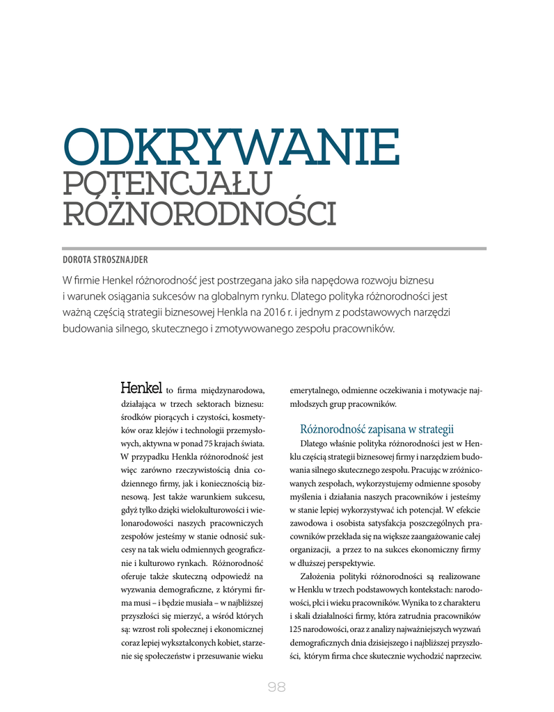 ODKRYWANIE POTENCJAŁU RÓŻNORODNOŚCI DOROTA STROSZNAJDER W firmie Henkel różnorodność jest postrzegana jako siła napędowa rozwoju biznesu i warunek osiągania sukcesów na globalnym rynku. Dlatego polityka różnorodności jest ważną częścią strategii biznesowej Henkla na 2016 r. i jednym z podstawowych narzędzi budowania silnego, skutecznego i zmotywowanego zespołu pracowników. Henkel to firma międzynarodowa, emerytalnego, odmienne oczekiwania i motywacje najmłodszych grup pracowników. działająca w trzech sektorach biznesu: środków piorących i czystości, kosmetyków oraz klejów i technologii przemysłowych, aktywna w ponad 75 krajach świata. W przypadku Henkla różnorodność jest więc zarówno rzeczywistością dnia codziennego firmy, jak i koniecznością biznesową. Jest także warunkiem sukcesu, gdyż tylko dzięki wielokulturowości i wielonarodowości naszych pracowniczych zespołów jesteśmy w stanie odnosić sukcesy na tak wielu odmiennych geograficznie i kulturowo rynkach. Różnorodność oferuje także skuteczną odpowiedź na wyzwania demograficzne, z którymi firma musi – i będzie musiała – w najbliższej przyszłości się mierzyć, a wśród których są: wzrost roli społecznej i ekonomicznej coraz lepiej wykształconych kobiet, starzenie się społeczeństw i przesuwanie wieku Różnorodność zapisana w strategii Dlatego właśnie polityka różnorodności jest w Henklu częścią strategii biznesowej firmy i narzędziem budowania silnego skutecznego zespołu. Pracując w zróżnicowanych zespołach, wykorzystujemy odmienne sposoby myślenia i działania naszych pracowników i jesteśmy w stanie lepiej wykorzystywać ich potencjał. W efekcie zawodowa i osobista satysfakcja poszczególnych pracowników przekłada się na większe zaangażowanie całej organizacji, a przez to na sukces ekonomiczny firmy w dłuższej perspektywie. Założenia polityki różnorodności są realizowane w Henklu w trzech podstawowych kontekstach: narodowości, płci i wieku pracowników. Wynika to z charakteru i skali działalności firmy, która zatrudnia pracowników 125 narodowości, oraz z analizy najważniejszych wyzwań demograficznych dnia dzisiejszego i najbliższej przyszłości, którym firma chce skutecznie wychodzić naprzeciw. 98 STUDIUM PRZYPADKU Starzenie się społeczeństw, oswajanie multikulturowości – te globalne wyzwania dotyczą też firm. Henkel w zarządzaniu różnorodnością dostrzega szansę rozwoju pracowników i zwiększania kapitału społecznego. Strategiczne podejście do różnorodności przejawia się także w ustanawianiu konkretnych celów numerycznych, które pozwalają nam ocenić efektywność i skuteczność podejmowanych działań. Np. jednym z celów polityki różnorodności jest postulat zwiększania udziału kobiet wśród kadry zarządzającej o 1–2 proc. rok do roku. część operacji w Polsce ma charakter produkcyjny. Kobiety stanowią także 30 proc. kadry menedżerskiej, niemniej firma podejmuje działania, aby regularnie ich odsetek się zwiększał, co pokazują statystyki awansów. W 2013 r. 56 proc. wszystkich promocji i 44 proc. promocji na stanowiska menedżerskie w polskim oddziale firmy dotyczyło kobiet. Niewątpliwie rozwój karier kobiet w Henklu wspierają rozwiązania z zakresu elastycznych form zatrudnienia, które pozwalają łatwiej łączyć pracę zawodową z życiem osobistym. Wśród istniejących warto wymienić: możliwość pracy w niepełnym wymiarze godzin, elastyczne godziny pracy czy pracę z domu. Od 2013 r. realizowany jest w Polsce także globalny program networkingu Women in Leadership, którego celem jest wspieranie rozwoju zawodowego i osobistego kobiet na stanowiskach menedżerskich m.in. poprzez system dodatkowych szkoleń i treningów nakierowanych na wzmacnianie umiejętności przywódczych i rozwijanie pewności siebie. Od początku przyszłego roku rusza zaś program peer mentoringu, czyli mentoringu koleżeńskiego, skierowany do kobiecej kadry menedżerskiej, którego celem będzie wymiana doświadczeń, wzajemna inspiracja i budowanie poczucia siły sprawczej w tej grupie pracowników. W trosce o różne potrzeby pracowników Politykę różnorodności realizujemy w Henklu za pomocą wielu narzędzi i programów, za których wdrożenie odpowiada dział HR. Ich celem jest zapewnienie optymalnych warunków pracy i rozwoju zawodowego różnym grupom pracowników z korzyścią dla firmy i ku satysfakcji zatrudnionych w niej ludzi. Programy te wspierają kariery kobiet i rozwój zawodowy młodych, zapewniają rotację kadry menedżerskiej i zdobywanie przez nią międzynarodowego i multikulturowego doświadczenia, wspierają proces ciągłego kształcenia (ze szczególnym uwzględnieniem starszych pracowników) czy w końcu umożliwiają zatrudnionym osiągnięcie równowagi między pracą a życiem osobistym. Wspieranie karier kobiet FOT.: DARIUSZ IWAŃSKI Kobiety stanowią w polskim oddziale Henkla jedynie 30 proc. załogi, co w głównej mierze wynika z tego, że duża Różnorodność pozwala efektywnie wykorzystywać odmienne sposoby myślenia i działania pracowników. Dlatego w Henklu zarządzanie różnorodnością znajduje swoje miejsce w strategii firmy. JANUSZ GOŁĘBIOWSKI, prezes zarządu Henkel Polska 99 FOT.: PATRYK JAGI Według badań kobiety są grupą, którą charakteryzuje niższy poziom aktywności zawodowej. Dlatego Henkel poprzez projekt „W drodze do pracy” stara się wspierać je w rozwoju. Oferuje im m.in. udział w kursie prowadzonym przez pracowników i współpracowników Fundacji Miejsce Kobiet. Cenny potencjał pracowników 50+ Największym zdefiniowanym lokalnie wyzwaniem są jednak zmiany demograficzne na polskim rynku pracy. Z danych GUS wynika, że w latach 2010–2015 w Polsce będzie ponad 1 mln osób w wieku 60+, a do 2035 r. – 3 mln. Jednocześnie liczebność innych grup wiekowych spadnie. W praktyce oznacza to zwiększ