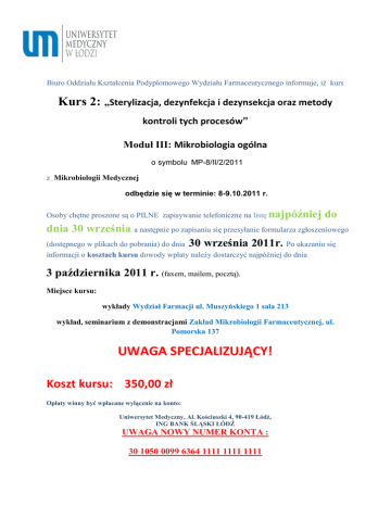 Biuro Oddziału Kształcenia Podyplomowego Wydziału Farmaceutycznego informuje, iż kurs Kurs 2: „Sterylizacja, dezynfekcja i dezynsekcja oraz metody kontroli tych procesów” Moduł III: Mikrobiologia ogólna o symbolu MP-8/II/2/2011 z Mikrobiologii Medycznej odbędzie się w terminie: 8-9.10.2011 r. Osoby chętne proszone są o PILNE zapisywanie telefoniczne na listę najpóźniej do dnia 30 września a następnie po zapisaniu się przesyłanie formularza zgłoszeniowego (dostępnego w plikach do pobrania) do dnia 30 września 2011r. Po ukazaniu się informacji o kosztach kursu dowody wpłaty należy dostarczyć najpóźniej do dnia 3 października 2011 r. (faxem, mailem, pocztą). Miejsce kursu: wykłady Wydział Farmacji ul. Muszyńskiego 1 sala 213 wykład, seminarium z demonstracjami Zakład Mikrobiologii Farmaceutycznej, ul. Pomorska 137 UWAGA SPECJALIZUJĄCY! Koszt kursu: 350,00 zł Opłaty winny być wpłacane wyłącznie na konto: Uniwersytet Medyczny, Al. Kościuszki 4, 90-419 Łódź, ING BANK ŚLĄSKI ŁÓDŹ UWAGA NOWY NUMER KONTA : 30 1050 0099 6364 1111 1111 1111 KONIECZNIE : w rubryce tytułem należy podać symbol kursu oraz dopisek 708-04- 078 Prosimy o dokładne i czytelne wypełnienie formularza, włącznie z aktualnym numerem telefonu, datą i podpisem – umożliwi to szybkie przekazanie informacji w przypadku wszelkich zmian. W przypadku rezygnacji z udziału w szkoleniu prosimy o niezwłoczne zawiadomienie o tym pracowników Biuro Oddziału Kształcenia Podyplomowego. Osoby zainteresowane otrzymaniem FAKTURY wystawionej przez UM dla podmiotu gospodarczego opłacającego szkolenie powinny wypełnić druk przelewu/ wpłaty gotówkowej podając w rubryce nazwa zleceniodawcy- nazwę i adres podmiotu gospodarczego, a w rubryce tytułem dodatkowo obok w/w : nazwisko i imię kursanta. Osoby fizyczne wypełniają druk podając swoje dane, a jeśli chcą otrzymać fakturę w rubryce tytułem obok symbolu kursu i dopisku 708-04- 078 zamieszczają dopisek Faktura. Podstawą do wystawienia faktury jest druk wpłaty (nie formularz zgłoszeniowy). Prawidłowo wypełniony druk wpłaty powinien zawierać wszystkie powyżej podane dane. Nazwa wpisanego podmiotu gospodarczego na druku wpłaty musi być zgodna z danymi na formularzu zgłoszenia. Na druku wpłaty nie ma konieczności wpisywania NIP. RAMOWY PROGRAM ZAJĘĆ 16 godzin wykładów (z demonstracjami) + 1 godzina testu zaliczającego kurs 8 października 2011 rok (sobota) Organizacja laboratorium i aseptyka wykłady Wydział Farmacji ul. Muszyńskiego 1 sala 213 8.30 – 10.00 Organizacja i standardy techniczne pomieszczeń czystych i jałowych w laboratoriach mikrobiologicznych i analitycznych 10.15- 11.00 Higiena szpitalna. 11.15 -12.45 Chemiczne środki antyseptyczne i dezynfekcyjne. Dezynfekcja powietrza, wody, przedmiotów. 13.00-13.45 Przyczyna niepowodzeń w procesie dezynfekcji i sterylizacji (biofilm, oporność, i inne). Przerwa wykład, seminarium z demonstracjami Zakład Mikrobiologii Farmaceutycznej, ul. Pomorska 137 14.15 – 14.45 Metody badania środków antyseptycznych i dezynfekcyjnych 14.45 -16.15 Wrażliwość różnych form bakterii na działanie środków dezynfekcyjnych. Wpływ materii organicznej na aktywność przeciwbakteryjną środków dezynfekcyjnych. Badanie aktywności środków antyseptycznych i dezynfekcyjnych metodą wyznaczania MIC i MBC. Kontrola bakteryjnego zanieczyszczenia powierzchni metodą odcisków. 9 października 2011 (niedziela) Dezynsekcja i sterylizacja wykłady Wydział Farmacji ul. Muszyńskiego 1 sala 213 8.30 -10.00 Dezynsekcja. Choroby przenoszone przez insekty. 10.15 – 11.45 Metody sterylizacji – stare i nowe technologie. seminarium z demonstracjami wykład, seminarium z demonstracjami Zakład Mikrobiologii Farmaceutycznej, ul. Pomorska 137 12.30 – 14.45 Metody kontroli urządzeń sterylizujących. Wskaźniki biologiczne – Sporal A, Sporal S, testy chemiczne – Alias C1/C2, Alias A1/B1, test emulacyjny Brown TST Control, taśmy do kontroli sterylizacja TGP i TAS. 14.45 – 15.30 Test zaliczający kurs