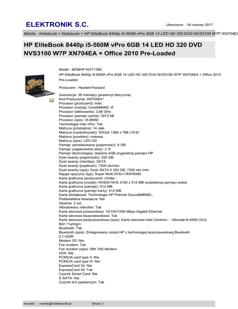 ELEKTRONIK S.C. Utworzono : 04 marzec 2017 Mobile - Notebooki > Notebooki > HP EliteBook 8440p i5-560M vPro 6GB 14 LED HD 320 DVD NVS3100 W7P XN704EA HP EliteBook 8440p i5-560M vPro 6GB 14 LED HD 320 DVD NVS3100 W7P XN704EA + Office 2010 Pre-Loaded Model : MOBHP-NOT1356 HP EliteBook 8440p i5-560M vPro 6GB 14 LED HD 320 DVD NVS3100 W7P XN704EA + Office 2010 Pre-Loaded Producent : Hewlett-Packard Gwarancja: 36 miesięcy gwarancji fabrycznej Kod Producenta: XN704EA* Procesor (producent): Intel� Procesor (rodzaj): Core™ i5 Procesor (taktowanie): 2,66 GHz Procesor (pamięć cache): 3072 kB Procesor (opis): i5-560M Technologia Intel vPro: Tak Matryca (przekątna): 14 cale Matryca (rozdzielczość): WXGA 1366 x 768 (16:9) Matryca (powłoka): matowa Matryca (opis): LED HD Pamięć zainstalowana (pojemność): 6 GB Pamięć (zajęte/wolne sloty): 2 /0 Pamięć (technologia): dołożne 4GB oryginalnej pamięci HP Dysk twardy (pojemność): 320 GB Dysk twardy (interfejs): SATA Dysk twardy (prędkość): 7200 obr/min Dysk twardy (opis): Dysk SATA II 320 GB, 7200 obr./min Napęd optyczny (typ): Super Multi DVD+/-RW/RAM Karta graficzna (producent): nVidia� Karta graficzna (model): NVIDIA NVS 3100 z 512 MB wydzielonej pamięci wideo Karta graficzna (pamięć): 512 MB Karta graficzna (pamięć karty): 512 MB Karta dźwiękowa: Technologia HP Premier Sound™, Podświetlana klawiatura: Nie Głośniki: 2 szt. Wbudowany mikrofon: Tak Karta sieciowa przewodowa: 10/100/1000 Mbps Gigabit Ethernet Karta sieciowa bezprzewodowa: Tak Karta sieciowa bezprzewodowa (opis): Karta sieciowa Intel Centrino� Ultimate-N 6300 (3x3) 802.11a/b/g/n Bluetooth: Tak Bluetooth (opis): Zintegrowany moduł HP z technologią bezprzewodową Bluetooth 2.1+EDR Modem 3G: Nie Fax modem: Tak Fax modem (opis): 56K V92 Modem IrDA: Nie PCMCIA card type II: Nie PCMCIA card type III: Nie ExpressCard 34: Nie ExpressCard 54: Tak Czytnik Smart Card: Nie E-SATA: Nie Czytnik linii papilarnych: Tak kontakt : - [email protected] Strona 1 ELEKTRONIK S.C. Utworzono : 04 marzec 2017 Mobile - Notebooki > Notebooki > HP EliteBook 8440p i5-560M vPro 6GB 14 LED HD 320 DVD NVS3100 W7P XN704EA HP EliteBook 8440p i5-560M vPro 6GB 14 LED HD 320 DVD NVS3100 W7P XN704EA + Office 2010 Pre-Loaded Platforma szyfrująca TPM: Tak Kensington Lock: Tak Display Port: Tak DVI-D: Nie HDMI: Nie VGA (RGB): Tak S-video/TV-out: Nie AV-in (Tuner TV): Nie Line-in: Nie Line-out: Tak Wejście mikrofonu: Tak S/PDIF: Nie RS232 (szeregowy): Nie Czytnik kart pamięci: Nie Panel klawiszy multimedialnych: Nie Złącze replikatora portów: Tak Fire-Wire (IEEE1394): Tak USB 2.0: 3 szt. System operacyjny: Windows 7 Professional 32 bit System operacyjny (wer. Językowa): polski Dodatkowe oprogramowanie: HP Recovery Manager (tylko w systemach Windows 7 i Vista), HP QuickLook, HP QuickWeb, HP Power Assistant, HP Client Manager Software Wbudowana kamera: Tak Wbudowana kamera (opis): 2 MP Akumulator (technologia): 6 -ogniwowy akumulator litowy HP Akumulator (czas pracy): 6 h Wymiary (wysokość): 310 mm Wymiary (szerokość): 330 mm Wymiary (głębokość): 230 mm Waga: 2,12 kg Gwarancja: 36 mies Gwarancja międzynarodowa: Tak Opis: Informacja dla Kanału sprzedaży: Towar kupiony z rynku, ceny uwzględniają maksymalne rabaty. Brak finansowego wsparcia z HPKlawiatura z otworami odpływowymi odporna na zalanie Adres www producenta: Link na stronę opisu technicznego Cena : 2.979,19 zł Brutto ( 2.441,96 zł Netto) Dostępność: Produkt dostępny w naszym sklepie od 23 czerwiec 2012 kontakt : - [email protected] Strona 2