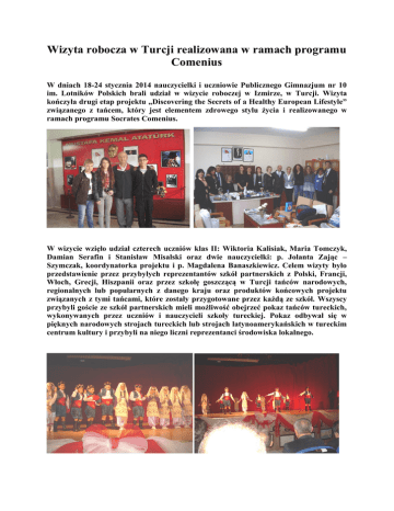 Wizyta robocza w Turcji realizowana w ramach programu Comenius W dniach 18-24 stycznia 2014 nauczycielki i uczniowie Publicznego Gimnazjum nr 10 im. Lotników Polskich brali udział w wizycie roboczej w Izmirze, w Turcji. Wizyta kończyła drugi etap projektu „Discovering the Secrets of a Healthy European Lifestyle” związanego z tańcem, który jest elementem zdrowego stylu życia i realizowanego w ramach programu Socrates Comenius. W wizycie wzięło udział czterech uczniów klas II: Wiktoria Kalisiak, Maria Tomczyk, Damian Serafin i Stanisław Misalski oraz dwie nauczycielki: p. Jolanta Zając – Szymczak, koordynatorka projektu i p. Magdalena Banaszkiewicz. Celem wizyty było przedstawienie przez przybyłych reprezentantów szkół partnerskich z Polski, Francji, Włoch, Grecji, Hiszpanii oraz przez szkołę goszczącą w Turcji tańców narodowych, regionalnych lub popularnych z danego kraju oraz produktów końcowych projektu związanych z tymi tańcami, które zostały przygotowane przez każdą ze szkół. Wszyscy przybyli goście ze szkół partnerskich mieli możliwość obejrzeć pokaz tańców tureckich, wykonywanych przez uczniów i nauczycieli szkoły tureckiej. Pokaz odbywał się w pięknych narodowych strojach tureckich lub strojach latynoamerykańskich w tureckim centrum kultury i przybyli na niego liczni reprezentanci środowiska lokalnego. Po tańcach tureckich przyszła kolej na pokaz tańców narodowych poszczególnych krajów partnerskich: Grecji Hiszpanii w strojach ludowych Polski Włoch oraz nauczycieli krajów partnerskich. W trakcie wizyty uczniowie brali również udział w lekcji plastyki, na której malowali prace przedstawiające braterstwo między partnerskimi szkołami pracującymi w projekcie oraz ich krajami. Podczas zorganizowanej dla gości lekcji tureckiego uczniowie i nauczyciele przybyli ze szkół partnerskich mogli się nauczyć podstawowych zwrotów grzecznościowych, powitań i pożegnań w języku tureckim. Nauczyciele i uczniowie odwiedzali lokalne instytucje samorządowe, gdzie byli przyjmowani przez burmistrza, dyrektora Wydziału Edukacji, oraz gubernatora Gaziemiru i częstowani typowymi dla Turcji przekąskami. Wizyta w Turcji dała również wszystkim przybyłym gościom z krajów partnerskich możliwość obejrzenia pięknych miejsc w Izmirze i okolicy dzięki wycieczkom zorganizowanym dla uczniów i nauczycieli przez szkołę goszczącą. Odwiedziliśmy: Ruiny starożytnego miasta Ephesus Meczet Sanktuarium NMP Muzeum Zarządu Miasta Starą posiadłość dworską MuzeumTechniki Morze i przepłynęliśmy promem do fantastycznego parku dzikiej przyrody Tarasy wodne w Pamukkale Wizytę zakończyło pożegnalne przyjęcie dla uczniów i nauczycieli, oraz goszczących uczniów rodzin. Wizyta w Turcji nie tylko pozwoliła nam zrealizować zadania wyznaczone przez projekt, ale dostarczyła również wiele niezapomnianych wrażeń i zapoczątkowała wiele nowych przyjaźni. Przygotowała Jolanta Zając-Szymczak