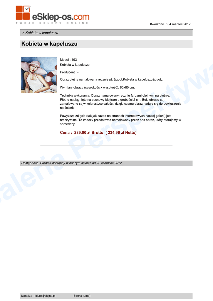 Utworzono : 04 marzec 2017 > Kobieta w kapeluszu Kobieta w kapeluszu Model : 193 Kobieta w kapeluszu w y t Producent : Obraz olejny namalowany ręcznie pt. "Kobieta w kapeluszu". Wymiary obrazu (szerokość x wysokość): 60x80 cm. k e Technika wykonania: Obraz namalowany ręcznie farbami olejnymi na płótnie. Płótno naciągnięte na sosnowy blejtram o grubości 2 cm. Boki obrazu są zamalowane są w kolorystyce całości, dzięki czemu obraz nadaje się do powieszenia na ścianie. p rs Powyższe zdjęcie (tak jak każde na stronach internetowych naszej galerii) jest rzeczywiste. To znaczy przedstawia namalowany przez nas obraz, który oferujemy w sprzedaży. e P a Cena : 289,00 zł Brutto ( 234,96 zł Netto) i r e Dostępność: Produkt dostępny w naszym sklepie od 28 czerwiec 2012 l a G kontakt : - [email protected] Strona 1/{nb}