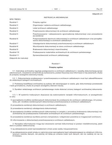 Dziennik Ustaw Nr 14 — 1031 — Poz. 67 Załącznik nr 6 INSTRUKCJA ARCHIWALNA SPIS TREŚCI: Rozdział 1 Przepisy ogólne Rozdział 2 Organizacja i zadania archiwum zakładowego Rozdział 3 Lokal archiwum zakładowego Rozdział 4 Przejmowanie dokumentacji do archiwum zakładowego Rozdział 5 Przechowywanie i zabezpieczanie zgromadzonej dokumentacji oraz prowadzenie jej ewidencji Rozdział 6 Przeprowadzanie skontrum dokumentacji w archiwum zakładowym oraz porządkowanie dokumentacji w archiwum zakładowym Rozdział 7 Udostępnianie dokumentacji przechowywanej w archiwum zakładowym Rozdział 8 Wycofywanie dokumentacji ze stanu archiwum zakładowego Rozdział 9 Brakowanie dokumentacji niearchiwalnej Rozdział 10 Przekazywanie materiałów archiwalnych do archiwum państwowego Rozdział 11 Sprawozdawczość archiwum zakładowego Załącznik do instrukcji Rozdział 1 Przepisy ogólne § 1. Instrukcja archiwalna reguluje postępowanie w archiwum zakładowym z wszelką dokumentacją spraw zakończonych, niezależnie od techniki jej wytwarzania, postaci fizycznej oraz informacji w niej zawartych, chyba że przepisy szczególne stanowią inaczej. § 2. 1. Dokumentacja przekazywana i przechowywana w archiwum zakładowym musi być zakwalifikowana do właściwych kategorii archiwalnych. 2. Podstawą kwalifikacji archiwalnej są wykazy akt obowiązujące w czasie, gdy dokumentacja powstawała i była gromadzona, chyba że przepis szczególny stanowi inaczej. 3. Dyrektor właściwego archiwum państwowego może dokonać zmiany kategorii archiwalnej dokumentacji. § 3. 1. W systemie tradycyjnym dopuszcza się wykorzystanie narzędzi informatycznych, w szczególności w celu: 1) sporządzania środków ewidencyjnych dokumentacji do przekazania do archiwum zakładowego, ich przesyłania, jak i środków ewidencyjnych dokumentacji przechowywanej w archiwum zakładowym; 2) prowadzenia ewidencji dokumentacji w archiwum zakładowym; 3) prowadzenia ewidencji udostępniania dokumentacji; 4) sporządzania środków ewidencyjnych dokumentacji w związku z procedurą brakowania dokumentacji niearchiwalnej lub przekazywania materiałów archiwalnych do archiwum państwowego; 5) prowadzenia ewidencji wyników pomiaru temperatury i wilgotności powietrza w magazynach archiwum; 6) informowania o dokumentacji przechowywanej w archiwum zakładowym. 2. Narzędzia informatyczne mogą być stosowane zamiast dokumentacji w postaci nieelektronicznej, jeżeli dane w postaci elektronicznej: 1) są zabezpieczone przed wprowadzeniem zmian przez osoby nieupoważnione; 2) są zabezpieczone przed utratą co najmniej przez sporządzanie kopii zabezpieczającej na odrębnym informatycznym nośniku danych, nie później niż dobę po zmianie treści tych danych, ale nie rzadziej niż raz na 6 miesięcy. Dziennik Ustaw Nr 14 — 1032 — Poz. 67 3. Kopie zabezpieczające wykonuje się kolejno co najmniej na dwóch różnych informatycznych nośnikach danych, tak aby podmiot stale dysponował co najmniej dwoma nośnikami umożliwiającymi odzyskanie danych. 4. Wymagania określone w ust. 2 uważa się za spełnione, jeśli dla podmiotu została opracowana i wdrożona polityka zarządzania bezpieczeństwem informacji, w której określono wymagania bezpieczeństwa zgodne z Polską Normą PN-ISO/IEC 27001:2007 lub nowszą. Rozdział 2 Organizacja i zadania archiwum zakładowego § 4. 1. W podmiocie działa jedno archiwum zakładowe. 2. W urzędach obsługujących organy zespolonej administracji rządowej w województwie działają odrębne archiwa zakładowe, jeżeli nie są te organy obsługiwane przez urząd wojewódzki lub nie mają wspólnego z urzędem wojewódzkim systemu EZD. 3. Archiwum zakładowe jest komórką organizacyjną lub samodzielnym stanowiskiem pracy. 4. Dla dokumentacji w postaci elektronicznej w systemie EZD funkcję archiwum zakładowego spełnia system EZD lub jego moduł. 5. W systemie tradycyjnym archiwum zakładowe może posiadać filie. 6. Filie archiwum zakładowego tworzy odpowiednio sekretarz gminy, przewodniczący zarządu związku międzygminnego, sekretarz powiatu, sekretarz województwa, dyrektor generalny urzędu lub, w przypadku, o którym mowa w ust. 2, właściwy organ zespolonej administracji rządowej w województwie, określając zakres ich działania, przy uwzględnieniu że: 1) w filiach materiały archiwalne przechowuje się nie dłużej niż dziesięć lat, a po tym okresie przekazuje się je do archiwum zakładowego; 2) filie archiwum zakładowego stosują przepisy instrukcji odpowiednio. 7. Nadzór merytoryczny nad działalnością filii archiwum zakładowego sprawuje wyznaczony archiwista archiwum zakładowego. 8. Filie archiwum zakładowego przekazują do archiwum zakładowego kopie swoich środków ewidencyjnych dokumentacji, chyba że narzędzia informatyczne, o których mowa w § 3 ust. 1 pkt 2, umożliwiają wgląd do tych środków. § 5. Do zadań archiwum zakładowego należy: 1) przejmowanie dokumentacji: a) spraw zakończonych z poszczególnych komórek organizacyjnych, b) niearchiwalnej po państwowych i samorządowych jednostkach organizacyjnych, których działalność ustała i które nie mają sukcesora oraz dla których organem założycielskim lub sprawującym nadzór był odpowiednio kierownik podmiotu lub organ jednostki samorządu terytorialnego, c) na nośniku papierowym ze składu chronologicznego, d) elektronicznej na informatycznych nośnikach danych, zgromadzonych w składzie informatycznych nośników danych, których zawartości nie skopiowano do systemu EZD, 2) przechowywanie i zabezpieczanie zgromadzonej dokumentacji oraz prowadzenie jej ewidencji, 3) przeprowadzanie skontrum dokumentacji, 4) porządkowanie przechowywanej dokumentacji przejętej w latach wcześniejszych w stanie nieuporządkowanym, 5) udostępnianie przechowywanej dokumentacji, 6) wycofywanie dokumentacji ze stanu archiwum zakładowego w przypadku wznowienia sprawy w komórce organizacyjnej
