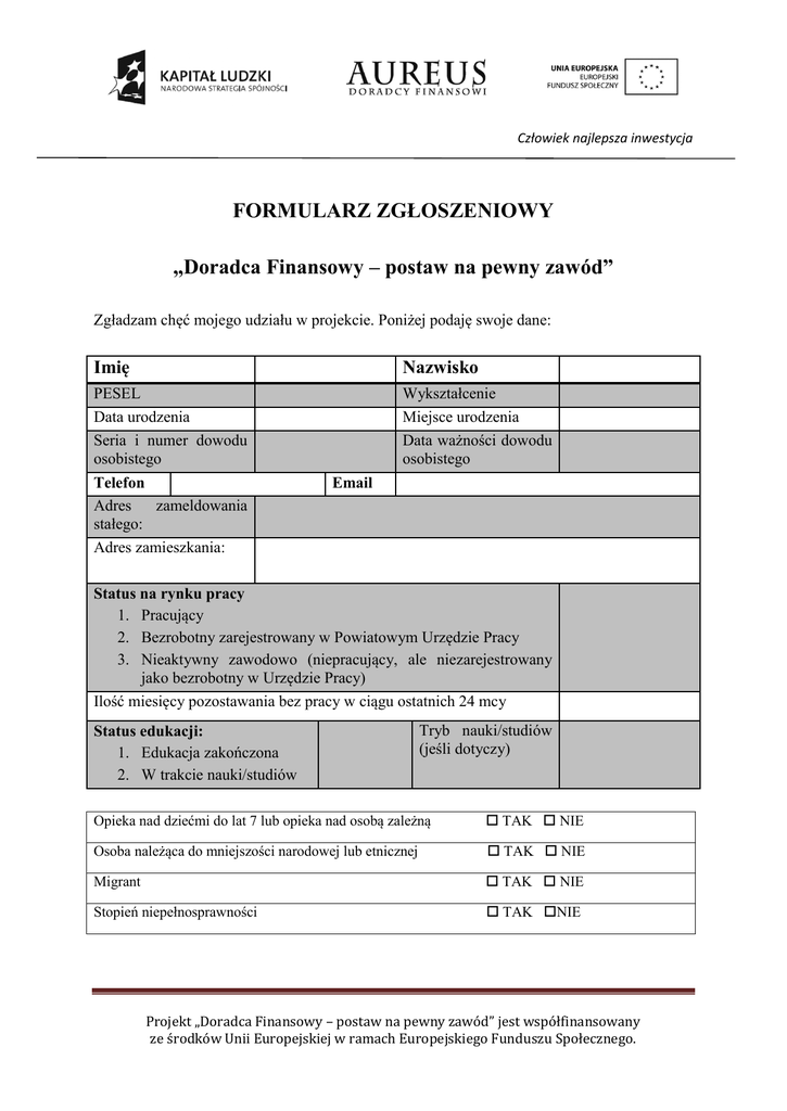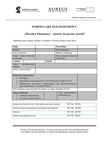 FORMULARZ ZGŁOSZENIOWY „Doradca Finansowy – postaw na