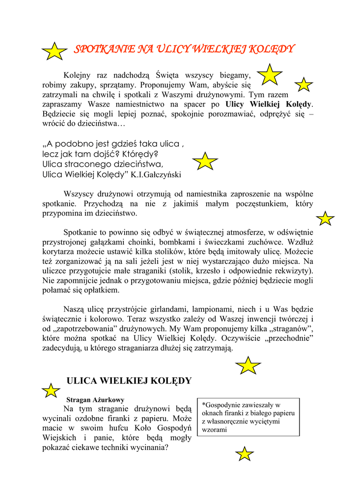 SPOTKANIE NA ULICY WIELKIEJ KOLĘDY Kolejny raz nadchodzą Święta wszyscy biegamy, robimy zakupy, sprzątamy. Proponujemy Wam, abyście się zatrzymali na chwilę i spotkali z Waszymi drużynowymi. Tym razem zapraszamy Wasze namiestnictwo na spacer po Ulicy Wielkiej Kolędy. Będziecie się mogli lepiej poznać, spokojnie porozmawiać, odprężyć się – wrócić do dzieciństwa… „A podobno jest gdzieś taka ulica , lecz jak tam dojść? Którędy? Ulica straconego dzieciństwa, Ulica Wielkiej Kolędy” K.I.Gałczyński Wszyscy drużynowi otrzymują od namiestnika zaproszenie na wspólne spotkanie. Przychodzą na nie z jakimiś małym poczęstunkiem, który przypomina im dzieciństwo. Spotkanie to powinno się odbyć w świątecznej atmosferze, w odświętnie przystrojonej gałązkami choinki, bombkami i świeczkami zuchówce. Wzdłuż korytarza możecie ustawić kilka stolików, które będą imitowały ulicę. Możecie też zorganizować ją na sali jeżeli jest w niej wystarczająco dużo miejsca. Na uliczce przygotujcie małe straganiki (stolik, krzesło i odpowiednie rekwizyty). Nie zapomnijcie jednak o przygotowaniu miejsca, gdzie później będziecie mogli połamać się opłatkiem. Naszą ulicę przystrójcie girlandami, lampionami, niech i u Was będzie świątecznie i kolorowo. Teraz wszystko zależy od Waszej inwencji twórczej i od „zapotrzebowania” drużynowych. My Wam proponujemy kilka „straganów”, które można spotkać na Ulicy Wielkiej Kolędy. Oczywiście „przechodnie” zadecydują, u którego straganiarza dłużej się zatrzymają. ULICA WIELKIEJ KOLĘDY Stragan Ażurkowy Na tym straganie drużynowi będą wycinali ozdobne firanki z papieru. Może macie w swoim hufcu Koło Gospodyń Wiejskich i panie, które będą mogły pokazać ciekawe techniki wycinania? *Gospodynie zawieszały w oknach firanki z białego papieru z własnoręcznie wyciętymi wzorami Stragan Stroikowy Tutaj możecie uczyć się tworzenia Bożonarodzeniowych stroików. (Aby choinka w stroiku dłużej zachowała świeżość, jako podłoże wykorzystajcie worek z wilgotną ziemią lub piaskiem i mocno go zwiążcie ) * W czterech kątach izby kuchennej ustawiano snopy zbóż, po jednym pszenicy, żyta, owsa i jęczmienia. Dzięki temu zbiory w nadchodzącym roku miały być obfite. Stragan Ozdóbkowy W tym miejscu „przechodnie” wykonują różne ozdoby choinkowe. Możecie skupić się na robieniu łańcuchów lub malowaniu papierowych bombek. My Wam proponujemy sięgnąć po książkę z origami, tam na pewno znajdziecie coś czego warto nauczyć innych. * U powały zwisały na końskim włosiu ozdobne pająki (słoma, papier) oraz wycięte z kolorowego opłatka jabłuszka, jeżyki, kolebki, półksiężyce. Stragan z łakociami Poproście swoją babcię (lub zupełnie kogoś innego), aby nauczyła lub po prostu przygotowała z drużynowymi ozdobne kruche ciasteczka, pierniczki lub inną potrawę w zależności od Waszych możliwości. A może pokusicie się, żeby na tym straganie samodzielnie wykonać jakąś pyszną świąteczną potrawę. * Niektórzy gospodarze obwiązywali nogi ławy lub stołu łańcuchami, aby chleb się trzymał domu Stragan dobrego wychowania Tutaj drużynowi poznają zasady układania zastawy na stole, nauczą się do czego służą poszczególne sztućce, jak usadzać przy stole gości, a może nauczą się też ozdabiania stołu i fantazyjnego układania serwetek. Warto by zapoznali się tu również ze staropolskimi * Jeszcze w wielu domach pod biały obrus na Wigilijnym stole wkłada się siano, aby się przekonać co nas czeka w przyszłości. zwyczajami związanymi z wigilijnym stołem np. wolne miejsce dla niespodziewanego gościa, sianko pod obrusem itd. Stragan kolędnika Bez tego straganu nie obeszła by się żadna wigilijna uroczystość. Możecie tu wspólnie zaśpiewać którąś z pięknych polskich kolęd, albo też nauczyć się jakiejś w obcym języku np. „Cicha noc”. Może pokusicie się również, żeby ułożyć słowa nowej kolędy na melodię jakiejś starej, wszystkim dobrze znanej . * Możecie zaśpiewać wspólnie stary, ale dobrze znany quodlibet. Równocześnie zaśpiewajcie „Wśród nocnej ciszy” i „Pije Kuba do Jakuba”. Jeżeli przechodnie już zwiedzili Ulicę zaproście ich do przygotowania Wigilijnego stołu. Wykorzystajcie przyniesione poczęstunki, wykonane ozdoby, stroiki. Na pewno nie trzeba Wam przypominać o zostawieniu wolnego nakrycia i o tym, aby nie posadzić żadnej panny na rogu stołu! Gdy za oknem zapłonie pierwsza gwiazdka, a u was świece, połamcie się opłatkiem i złóżcie sobie życzenia. Potem jedząc przygotowane własnoręcznie smakołyki, śpiewając kolędy, powspominajcie jak wyglądały dawniej Wigilie w Waszych domach. Może macie jakieś zwyczaje, których inni nie znają ? Może jest coś co Was łączy ? Wart spróbować! * Dawniej dla zwierząt były przeznaczone opłatki barwione – szafranem na żółto, żytem na zielono lub sokiem z buraków na różowo. Życzymy Wam, abyście na Waszym wigilijnym spotkaniu odnaleźli w sobie to coś, co łączy przeszłe i przyszłe pokolenia: to uczucie wielkiego szczęścia i wzruszenia, jakiego doznajemy, zasiadając do wigilijnego stołu. hm. Anna Piekarz /materiał ukazał się w „Zuchowych Wieściach”/