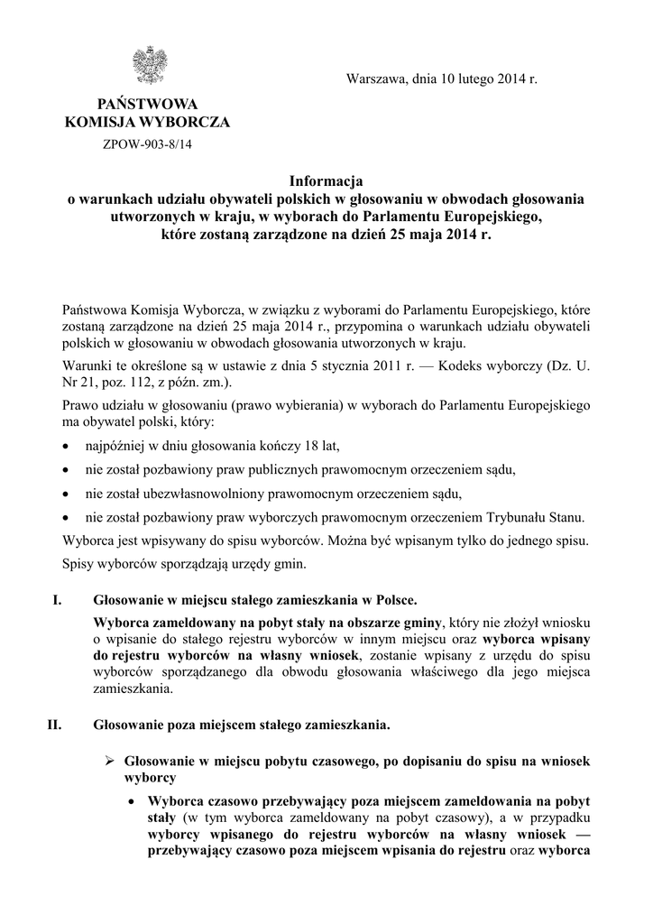 Warszawa, dnia 10 lutego 2014 r. PAŃSTWOWA KOMISJA WYBORCZA ZPOW-903-8/14 Informacja o warunkach udziału obywateli polskich w głosowaniu w obwodach głosowania utworzonych w kraju, w wyborach do Parlamentu Europejskiego, które zostaną zarządzone na dzień 25 maja 2014 r. Państwowa Komisja Wyborcza, w związku z wyborami do Parlamentu Europejskiego, które zostaną zarządzone na dzień 25 maja 2014 r., przypomina o warunkach udziału obywateli polskich w głosowaniu w obwodach głosowania utworzonych w kraju. Warunki te określone są w ustawie z dnia 5 stycznia 2011 r. — Kodeks wyborczy (Dz. U. Nr 21, poz. 112, z późn. zm.). Prawo udziału w głosowaniu (prawo wybierania) w wyborach do Parlamentu Europejskiego ma obywatel polski, który: najpóźniej w dniu głosowania kończy 18 lat, nie został pozbawiony praw publicznych prawomocnym orzeczeniem sądu, nie został ubezwłasnowolniony prawomocnym orzeczeniem sądu, nie został pozbawiony praw wyborczych prawomocnym orzeczeniem Trybunału Stanu. Wyborca jest wpisywany do spisu wyborców. Można być wpisanym tylko do jednego spisu. Spisy wyborców sporządzają urzędy gmin. I. Głosowanie w miejscu stałego zamieszkania w Polsce. Wyborca zameldowany na pobyt stały na obszarze gminy, który nie złożył wniosku o wpisanie do stałego rejestru wyborców w innym miejscu oraz wyborca wpisany do rejestru wyborców na własny wniosek, zostanie wpisany z urzędu do spisu wyborców sporządzanego dla obwodu głosowania właściwego dla jego miejsca zamieszkania. II. Głosowanie poza miejscem stałego zamieszkania. Głosowanie w miejscu pobytu czasowego, po dopisaniu do spisu na wniosek wyborcy Wyborca czasowo przebywający poza miejscem zameldowania na pobyt stały (w tym wyborca zameldowany na pobyt czasowy), a w przypadku wyborcy wpisanego do rejestru wyborców na własny wniosek — przebywający czasowo poza miejscem wpisania do rejestru oraz wyborca -2nigdzie niezamieszkały, może wziąć udział w głosowaniu w miejscu czasowego pobytu, jeżeli złoży pisemny wniosek o dopisanie do spisu wyborców. Wniosek składa się w urzędzie gminy, na obszarze której czasowo przebywa wyborca, najpóźniej w 5. dniu przed dniem wyborów, tj. do dnia 20 maja 2014 r. Żołnierze pełniący zasadniczą lub okresową służbę wojskową oraz pełniący służbę w charakterze kandydatów na żołnierzy zawodowych lub odbywający ćwiczenia i przeszkolenie wojskowe, ratownicy odbywający zasadniczą służbę w obronie cywilnej poza miejscem stałego zamieszkania, policjanci z jednostek skoszarowanych, funkcjonariusze Biura Ochrony Rządu, Straży Granicznej, Państwowej Straży Pożarnej oraz Służby Więziennej pełniący służbę w systemie skoszarowanym, którzy chcą wziąć udział w głosowaniu w miejscu odbywania służby, powinni złożyć wniosek o dopisanie do spisu wyborców w wybranym przez siebie obwodzie w danej miejscowości. Wniosek składa się w urzędzie gminy od dnia 4 maja 2014 r. do dnia 12 maja 2014 r. Osoby, które przybyły do miejsca zakwaterowania po tym terminie mogą złożyć wniosek najpóźniej w 2. dniu przed dniem wyborów, tj. do dnia 23 maja 2014 r. Wyborca dopisany do spisu wyborców na własny wniosek zostanie z urzędu skreślony ze spisu w miejscu stałego zamieszkania. Głosowanie na podstawie zaświadczenia o prawie do głosowania Wyborca, który zamierza zmienić miejsce pobytu przed dniem wyborów może otrzymać zaświadczenie o prawie do głosowania. Z zaświadczeniem takim można głosować w dowolnym obwodzie głosowania w kraju, za granicą lub na polskim statku morskim. Wniosek o wydanie zaświadczenia o prawie do głosowania składa się w urzędzie gminy, w której wyborca będzie ujęty w spisie wyborców, najpóźniej w 2. dniu przed dniem wyborów, tj. do dnia 23 maja 2014 r. Może on zostać złożony pisemnie, telefaksem lub w formie elektronicznej. Zaświadczenie o prawie do głosowania wyborca odbiera za pokwitowaniem osobiście albo przez upoważnioną pisemnie osobę. W przypadku upoważnienia innej osoby do odbioru zaświadczenia wyborca sporządza wniosek o wydanie zaświadczenia i upoważnienie (może to być jeden dokument), w którym wskazuje swoje imię (imiona) i nazwisko oraz numer PESEL oraz dane osoby upoważnionej do odebrania zaświadczenia. Wyborca, któremu wydano zaświadczenie o prawie do głosowania zostanie z urzędu skreślony ze spisu wyborców w miejscu stałego zamieszkania. Należy zwrócić szczególną uwagę, aby nie utracić zaświadczenia o prawie do głosowania. W przypadku jego utraty, niezależnie od przyczyny, nie będzie możliwe otrzymanie kolejnego zaświadczenia, ani wzięcie udziału w głosowaniu w obwodzie właściwym dla w miejsca stałego zamieszkania. -3 Głosowanie w szpitalach, domach pomocy społecznej, zakładach karnych i aresztach śledczych oraz w domach studenckich Wyborcy, którzy będą przebywać w dniu wyborów w szpitalach, domach pomocy społecznej, zakładach karnych i aresztach śledczych zostaną wpisani do spisów wyborców sporządzonych dla obwodów głosowania utworzonych w tych jednostkach i będą mogli głosować w tych obwodach. Dyrektor jednostki powiadomi osoby przebywające w jednostce o umieszczeniu ich w spisie wyborców. Na takich samych zasadach będą mogli głosować wyborcy przebywający w domach studenckich lub zespołach domów studenckich, w których utworzono obwody głosowania. Wyborcy wpisani do spisu wyborców w wyżej wymienionych jednostkach zostaną z urzędu skreśleni ze spisu w miejscu stałego zamieszkania. Osoby, które przybędą do wyżej wymienionych jednostek w dniu wyborów, będą mogły głosować w obwodach utworzonych w tych jednostkach tylko na podstawie zaświadczeń o prawie do głosowania. Głosowanie w kraju wyborców stale zamieszkałych za granicą Wyborca stale zamieszkały za granicą, który będzie przebywał w Polsce w dniu wyborów, może wziąć udział w głosow
