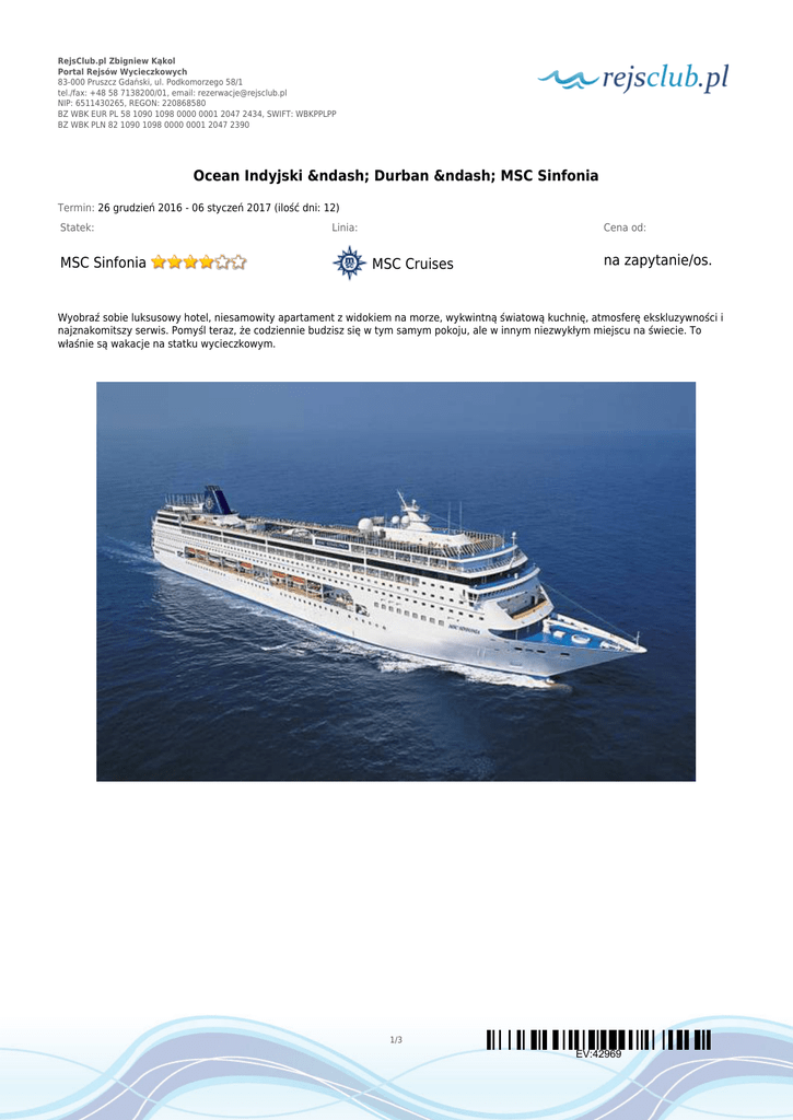 RejsClub.pl Zbigniew Kąkol Portal Rejsów Wycieczkowych 83-000 Pruszcz Gdański, ul. Podkomorzego 58/1 tel./fax: +48 58 7138200/01, email: [email protected] NIP: 6511430265, REGON: 220868580 BZ WBK EUR PL 58 1090 1098 0000 0001 2047 2434, SWIFT: WBKPPLPP BZ WBK PLN 82 1090 1098 0000 0001 2047 2390 Ocean Indyjski – Durban – MSC Sinfonia Termin: 26 grudzień 2016 - 06 styczeń 2017 (ilość dni: 12) Statek: MSC Sinfonia Linia: Cena od: MSC Cruises na zapytanie/os. Wyobraź sobie luksusowy hotel, niesamowity apartament z widokiem na morze, wykwintną światową kuchnię, atmosferę ekskluzywności i najznakomitszy serwis. Pomyśl teraz, że codziennie budzisz się w tym samym pokoju, ale w innym niezwykłym miejscu na świecie. To właśnie są wakacje na statku wycieczkowym. 1/3 EV:42969 RejsClub.pl Zbigniew Kąkol Portal Rejsów Wycieczkowych 83-000 Pruszcz Gdański, ul. Podkomorzego 58/1 tel./fax: +48 58 7138200/01, email: [email protected] NIP: 6511430265, REGON: 220868580 BZ WBK EUR PL 58 1090 1098 0000 0001 2047 2434, SWIFT: WBKPPLPP BZ WBK PLN 82 1090 1098 0000 0001 2047 2390 TRASA REJSU dzień 1 Data Port Wpłynięcie Wypłynięcie poniedziałek 26.12.2016 Durban 14:00 14:00 Republika Południowej Afryki dzień 2 wtorek 27.12.2016 Dzień na morzu --:-- --:-- dzień 3 środa 28.12.2016 Dzień na morzu --:-- --:-- dzień 4 czwartek 29.12.2016 Dzień na morzu --:-- --:-- dzień 5 piątek 30.12.2016 La Possession, Reunion 08:00 17:00 sobota 31.12.2016 Port Louis 09:00 23:59 niedziela 01.01.2017 Port Louis 00:01 23:59 poniedziałek 02.01.2017 Port Louis 00:01 13:00 dzień 9 wtorek 03.01.2017 Dzień na morzu --:-- --:-- dzień 10 środa 04.01.2017 Dzień na morzu --:-- --:-- dzień 11 czwartek 05.01.2017 Dzień na morzu --:-- --:-- dzień 12 piątek 06.01.2017 Durban 07:00 07:00 dzień 6 dzień 7 dzień 8 Francja Mauritius Mauritius Mauritius Republika Południowej Afryki CENNIK 2/3 EV:42969 Legenda RejsClub.pl Zbigniew Kąkol Portal Rejsów Wycieczkowych 83-000 Pruszcz Gdański, ul. Podkomorzego 58/1 tel./fax: +48 58 7138200/01, email: [email protected] NIP: 6511430265, REGON: 220868580 BZ WBK EUR PL 58 1090 1098 0000 0001 2047 2434, SWIFT: WBKPPLPP BZ WBK PLN 82 1090 1098 0000 0001 2047 2390 Cena katalogowa Suite Fantastica €2 642.00 Balcony Fantastica €2 569.00 Ocean View €2 120.00 Balcony Bella €2 447.00 Suite Aurea €2 775.00 Inside Bella €1 908.00 Ocean View Fantastica €2 226.00 Inside Fantastica €2 006.00 Opłaty portowe Cena promocyjna €36.00 Uwaga! Ceny za osobę w kabinie dwuosobowej. Cena zawiera: zakwaterowanie w kabinie wybranej kategorii; wyżywienie - 3 główne posiłki, przekąski między posiłkami, bufet lub przekąski o północy; napoje serwowane do śniadania i w bufetach samoobsługowych; serwis bagażowy podczas wejścia i zejścia ze statku; serwis kabinowy; korzystanie ze wszystkich urządzeń sportowo - rekreacyjnych znajdujących się na pokładzie statku (basen, jacuzzi, sala fitness, itp.); udział we wszystkich imprezach organizowanych na statku (przedstawienia w teatrze, koncerty, programy animacyjne itp.). Cena nie zawiera: kosztów dojazdu do portu; opłat portowych; ewentualnych noclegów w hotelu przed/po rejsie i transferów; wycieczek fakultatywnych w trakcie rejsu; korzystania z barów, mini baru w kabinie oraz napojów zamawianych w restauracji; korzystania z punktów usługowych (fryzjer, pralnia, fotograf, salon piękności i odnowy biologicznej, internet) i wydatków osobistych; napiwków dla obsługi na statku (kwota uzależniona od długości rejsu); ubezpieczenia KL, NNW i bagaż, kosztów wiz (tam gdzie wymagane). Uwagi: na wszystkich rejsach MSC Cruises można zarezerwować pakiety all inclusive: Allegrissimo 24h: 26€/os./dzień i 12€/dziecko/dzień; Allegrissimo Premium: 44€/os./dzień i 21€/dziecko/dzień (pakiet musi być wykupiony przez każdą osobę zakwaterowaną w kabinie - można zakupić w biurze przed rejsem). Na Państwa życzenie zarezerwujemy przelot, transfery do/z portu, parking, dodatkowe noclegi oraz zadbamy o odpowiednie ubezpieczenie podróżne. 3/3 EV:42969