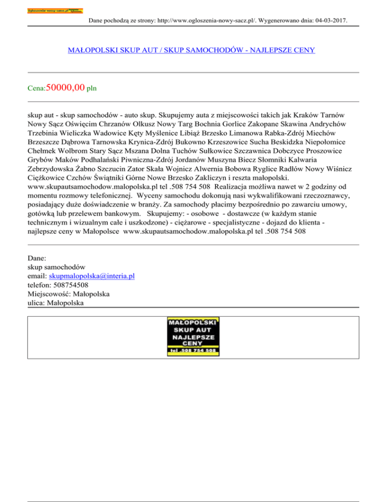 Dane pochodzą ze strony: http://www.ogloszenia-nowy-sacz.pl/. Wygenerowano dnia: 04-03-2017. MAŁOPOLSKI SKUP AUT / SKUP SAMOCHODÓW - NAJLEPSZE CENY Cena:50000,00 pln skup aut - skup samochodów - auto skup. Skupujemy auta z miejscowości takich jak Kraków Tarnów Nowy Sącz Oświęcim Chrzanów Olkusz Nowy Targ Bochnia Gorlice Zakopane Skawina Andrychów Trzebinia Wieliczka Wadowice Kęty Myślenice Libiąż Brzesko Limanowa Rabka-Zdrój Miechów Brzeszcze Dąbrowa Tarnowska Krynica-Zdrój Bukowno Krzeszowice Sucha Beskidzka Niepołomice Chełmek Wolbrom Stary Sącz Mszana Dolna Tuchów Sułkowice Szczawnica Dobczyce Proszowice Grybów Maków Podhalański Piwniczna-Zdrój Jordanów Muszyna Biecz Słomniki Kalwaria Zebrzydowska Żabno Szczucin Zator Skała Wojnicz Alwernia Bobowa Ryglice Radłów Nowy Wiśnicz Ciężkowice Czchów Świątniki Górne Nowe Brzesko Zakliczyn i reszta małopolski. www.skupautsamochodow.malopolska.pl tel .508 754 508 Realizacja możliwa nawet w 2 godziny od momentu rozmowy telefonicznej. Wyceny samochodu dokonują nasi wykwalifikowani rzeczoznawcy, posiadający duże doświadczenie w branży. Za samochody płacimy bezpośrednio po zawarciu umowy, gotówką lub przelewem bankowym. Skupujemy: - osobowe - dostawcze (w każdym stanie technicznym i wizualnym całe i uszkodzone) - ciężarowe - specjalistyczne - dojazd do klienta najlepsze ceny w Małopolsce www.skupautsamochodow.malopolska.pl tel .508 754 508 Dane: skup samochodów email: [email protected] telefon: 508754508 Miejscowość: Małopolska ulica: Małopolska