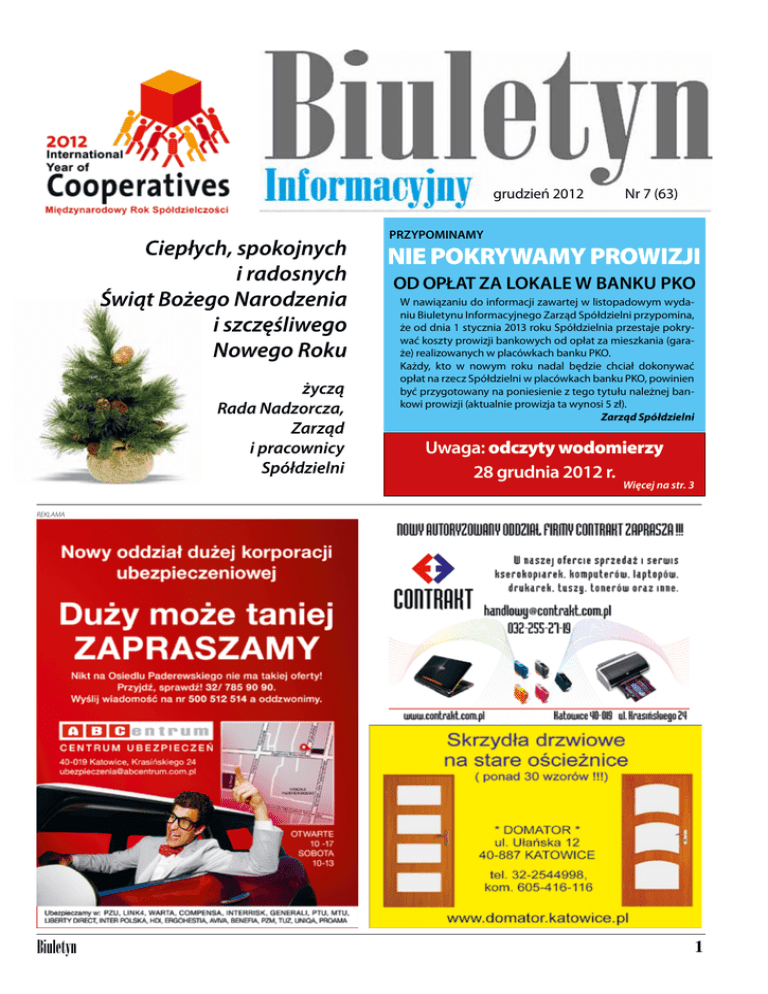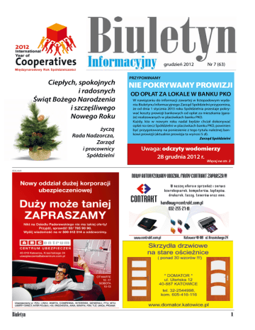 grudzień 2012 Ciepłych, spokojnych i radosnych Świąt Bożego Narodzenia i szczęśliwego Nowego Roku życzą Rada Nadzorcza, Zarząd i pracownicy Spółdzielni Nr 7 (63) PRZYPOMINAMY NIE POKRYWAMY PROWIZJI OD OPŁAT ZA LOKALE W BANKU PKO W nawiązaniu do informacji zawartej w listopadowym wydaniu Biuletynu Informacyjnego Zarząd Spółdzielni przypomina, że od dnia 1 stycznia 2013 roku Spółdzielnia przestaje pokrywać koszty prowizji bankowych od opłat za mieszkania (garaże) realizowanych w placówkach banku PKO. Każdy, kto w nowym roku nadal będzie chciał dokonywać opłat na rzecz Spółdzielni w placówkach banku PKO, powinien być przygotowany na poniesienie z tego tytułu należnej bankowi prowizji (aktualnie prowizja ta wynosi 5 zł). Zarząd Spółdzielni Uwaga: odczyty wodomierzy 28 grudnia 2012 r. Więcej na str. 3 REKLAMA Biuletyn 1 Klub REZONANS Klub „Rezonans” przy ul. Sowińskiego 5a, telefon 32 256-40-20, e-mail: [email protected] zaprasza mieszkańców osiedla na następujące zajęcia stałe: – sekcja plastyczna dla dzieci – środa i piątek, godz.16.00 – 17.30 – warsztaty plastyczne dla dorosłych – wtorek, godz.16.00 – 19.00 – zajęcia w Modelarni – wtorek, czwartek, piątek, godz.16.00 – 20.00 Modelarnia przeniesiona została do Klubu Rezonans! Ponadto zapraszamy na prowadzone na terenie Klubu zajęcia: – taneczno-ruchowe dla dzieci – środa, godz.17.00 – 17.45 – nauka tańca dla dorosłych – środa, godz.18.10 – 18.45 – aerobik/zumba – wtorek i czwartek, godz.18.10 – 18.55 – callanetics – wtorek i czwartek, godz.19.00 – 19.45 – pilates – poniedziałek i piątek, godz.18.00 – 19.00 – j. angielski dla dzieci (3 grupy) – poniedziałek, godz.15.30 – 17.45 – j. angielski dla dorosłych – piątek, godz.17.15 – 18.00 W dniach 24-25 listopada br. w siedzibie Spółdzielni zorganizowany został IX Konkurs Modeli Redukcyjnych o Puchar Przewod niczącego Rady Nadzorczej. Konkurs połączony został z wystawą modeli redukcyjnych oraz prezentacją zabytkowych motocykli z czasów II Wojny Światowej. W konkursie w kategorii senior oraz junior udział wzięło łącznie 74 modelarzy z całego kraju, wystawiając 232 modele: samolotów, wozów bojowych, dioram (makiet), statków oraz wiele innych ciekawych eksponatów. Modele wykonane zostały ze szczególną precyzją, dokładnością i fantazją, co sprawiło, że ciszyły oko licznie przybyłych mieszkańców osiedla oraz gości oglądających wystawę. REKLAMA Miło nam poinformować Państwa, że wśród osób nagrodzonych w Konkursie Modeli znalazł się mieszkaniec naszego osiedla: pan Piotr Stachura, zajmując srebro za figurkę „Oficer łącznik” oraz brąz za dioramę „Rosja lato 1941 r.” INFORMACJA W dniach od 1-17 grudnia 2012 r. w Klubie Rezonans prowadzona jest świąteczna zbiórka żywności oraz środków czystości w ramach akcji pomocy potrzebującym, prowadzonej wspólnie z Zespołem Charytatywnym działającym przy parafii pw. WNMP. Dary przyjmowane są w Klubie codziennie od poniedziałku do piątku w godzinach od 10.00-18.00. Jak, co roku liczymy na Państwa pomoc i dziękujemy z góry za okazane serce i przyłączenie się do naszej akcji. Pamiętajmy, że nawet najdrobniejsza pomoc pozwoli uczynić święta bardziej radosnymi. PLANOWANE IMPREZY Zapraszamy serdecznie mieszkańców osiedla do klubu na rodzinne kolędowanie. Spotkanie planowane jest na sobotę 5 stycznia 2013 r. – godzina 16.00. Termin spotkania potwierdzony będzie ogłoszeniem zamieszczonym w holach budynków. Szczegółowe informacje w Klubie Rezonans. Serdecznie zapraszamy mieszkańców osiedla do korzystania z przygotowanej oferty. Beata Kowalska 2 Biuletyn Założenia do Planu gospodarczo-finansowego Spółdzielni na 2013 rok I nformujemy, że w dniu 21 listopada br. Rada Nadzorcza przyjęła założenia do Planu gospodarczo-finansowego Spółdzielni na 2013 rok. Założenia te zostały skonstruowane na podstawie prognoz gospodarczych oraz przewidywanego wykonania przychodów i kosztów Spółdzielni za rok bieżący. Według prognoz analityków w roku 2013, podobnie jak w dwóch ostatnich latach, wzrosną ceny towarów i usług, podatków od nieruchomości, ubezpieczenia majątku, dostawy wody i odprowadzania ścieków. O 6,7% – do poziomu 1 600,- zł – wzrośnie wysokość płacy minimalnej, co niewątpliwie wpłynie na oferty wykonawców. Ponadto od 1 lipca 2013 r. wejdzie w życie tzw. ustawa śmieciowa. Za organizację i wywóz nieczystości będzie odpowiadało miasto. Do dnia dzisiejszego radni Katowic nie zdecydowali się na sposób pobierania i ustalania należnych opłat, w związku z czym w pierwszym półroczu nie przewidziano zmiany stawki opłaty za wywóz śmieci, natomiast w stosunku do drugiego półrocza decyzja zostanie podjęta zgodnie z ustaleniami miasta. Mimo prognozowanego wzrostu cen, które w bezpośredni sposób przekładają się na wysokość stawki eksploatacyjnej, Zarząd postanowił utrzymać na niezmienionym poziomie wysokość stawki opłaty eksploatacyjnej dla członków Spółdzielni. Zaproponowane Radzie, a następnie zaakceptowane przez nią, założenia stanowiące podstawę do budowy Planu gospodarczo – finansowego Spółdzielni na rok 2013 prezentujemy poniżej: 1. utrzymanie na dotychczasowym poziomie wysokości opłaty eksploatacyjnej dla członków Spółdzielni; 2. utrzymanie na dotychczasowym poziomie stawki funduszu remontowego [za wyjątkiem lokali usytuowanych w budynkach, w których przeprowadzone zostały prace termomodernizacyjne (przy ul. Granicznej 57÷57C oraz przy ul. Sikorskiego 10÷16)]. Zgodnie z decyzją Zebrania Przedstawicieli dla lokali tych miesięczna stawka odpisu na fundusz remontowy zostanie podniesiona o 0,30 zł/m2; 3. utrzymanie na dotychczasowym poziomie stawek opłat za eksploatację domofonów, wywóz nieczystości, eksploatację dźwigów oraz minimalnej stawki opłaty za u