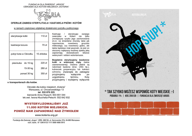 FUNDACJA DLA ZWIERZĄT „ARGOS” OŚRODEK DLA KOTÓW MIEJSKICH „KOTERIA” OFERUJE ZABIEGI STERYLITACJI / KASTARCJI PSÓW i KOTÓW w ramach częściowo odpłatnej działalności pożytku publicznego sterylizacja kotki 110 zł kastracja kocura 70 zł pobyt kota w Ośrodku 15 zł/doba do 15 kg 220 zł 15-30 kg 280 zł ponad 30 kg 350 zł pies/suka Kastrując / sterylizując swojego zwierzaka w Koterii nie tylko zmniejszysz ryzyko jego zachorowania (m.in. na śmiertelne choroby takie jak ropomacicze, nowotwory gruczołu mlekowego, czy nowotwory jąder), ale także będziesz miał pewność, że jest on otoczony najlepszą możliwą opieką jaką zapewniają doświadczeni lekarze weterynarii i oddani wolontariusze. Bezpłatnie sterylizujemy bezdomne kotki w widocznej ciąży (także zaawansowanej). Osobno płatne są natomiast badania (krwi, USG itp.), kubraczek pooperacyjny lub kołnierz ochronny. Zwierzęta do zabiegów przyjmujemy wyłącznie po uzgodnieniu terminu. Koty przyjmujemy i wydajemy wyłącznie w transporterach dla kotów. Ośrodek dla kotów miejskich „Koteria” Warszawa, ul. Chrzanowskiego 13 tel. 535 870 225 kierownik Anna Wypych: 603 651 044 lek.wet. Iwona Kłucińska-Petschl: 502 642 932 WYSTERYLIZOWALIŚMY JUŻ 11.000 KOTÓW MIEJSKICH. POMÓŻ NAM ZAPANOWAĆ NAD ŻYWIOŁEM www.koteria.org.pl –––––––––––––––––––––––––––––––––––––––––––––––––––––––––––––––––––––––– Fundacja dla Zwierząt „Argos”, KRS: 286138, ul. Garncarska 37A, 04-886 Warszawa rach. bank.: 47 1240 6133 1111 0000 4808 5915