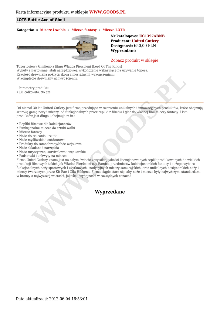 Karta informacyjna produktu w sklepie WWW.GOODS.PL LOTR Battle Axe of Gimli Kategoria: » Miecze i szable » Miecze fantasy » Miecze LOTR Nr katalogowy: UC1397ABNB Producent: United Cutlery Dostępność: 650,00 PLN Wyprzedane Zobacz produkt w sklepie S. PL Topór bojowy Gimliego z filmu Władca Pierścieni (Lord Of The Rings) Wykuty z hartowanej stali narzędziowej, wykończenie wskazujące na używanie topora. Rękojeść drewniana pokryta skórą z mosiężnymi wykończeniami. W komplecie drewniany uchwyt ścienny. Parametry produktu: • Dł. całkowita: 96 cm O D Od niemal 30 lat United Cutlery jest firmą przodująca w tworzeniu unikalnych i innowacyjnych produktów, które obejmują szeroką gamę noży i mieczy, od funkcjonalnych przez repliki z filmów i gier do własnej linii mieczy fantasy. Lista produktów jest długa i obejmuje m.in.: W W W .G O • Repliki filmowe dla kolekcjonerów • Funkcjonalne miecze do sztuki walki • Miecze fantasy • Noże do rzucania i rzutki • Noże myśliwskie i outdoorowe • Produkty do samoobrony/Noże wojskowe • Noże składane i narzędzia • Noże turystyczne, survivalowe i wędkarskie • Podstawki i uchwyty na miecze Firma Unied Cutlery znana jest na całym świecie z wysokiej jakości licencjonowanych replik produkowanych do wielkich produkcji filmowych takich jak Władca Pierścieni czy Rambo, przedmiotów kolekcjonerskich fantasy i dużego wyboru funkcjonalnych noży sportowych i użytkowych, tradycyjnych mieczy samurajskich, oraz unikalnych designerskich noży i mieczy tworzonych przez Kit Rae i Gila Hibbena. Firma ciągle stara się, aby noże i miecze były najwyższymi standardami w branży o najwyższej wartości, jakości i wydajności w rozsądnych cenach! Data aktualizacji: 2012-06-04 16:53:01 Wyprzedane