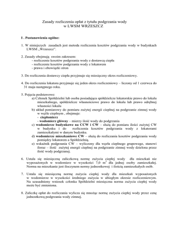 Zasady rozliczenia opłat z tytułu podgrzania wody w LWSM WRZESZCZ I . Postanowienia ogólne: 1. W niniejszych zasadach jest metoda rozliczenia kosztów podgrzania wody w budynkach LWSM „Wrzeszcz”. 2. Zasady obejmują swoim zakresem: - rozliczenie kosztów podgrzania wody z dostawcą ciepła - rozliczenie kosztów podgrzania wody z lokatorem - prawa i obowiązki stron 3. Do rozliczenia dostawcy ciepła przyjmuje się miesięczny okres rozliczeniowy. 4. Do rozliczenia lokatora przyjmuje się jeden okres rozliczeniowy – liczony od 1 czerwca do 31 maja następnego roku. 5. Pojęcia podstawowe: a) Członek Spółdzielni lub osoba posiadająca spółdzielcze lokatorskie prawo do lokalu mieszkalnego, spółdzielcze własnościowe prawo do lokalu lub prawo odrębnej własności lokalu b) układ pomiarowy do pomiaru zużytej energii cieplnej na podgrzanie zimnej wody w węźle cieplnym , obejmuje: - ciepłomierz - wodomierz główny – mierzy ilość wody do podgrzania c) wodomierze budynkowe na CCW i CW – służą do pomiaru ilości zużytej CW w budynku i do rozliczenia kosztów podgrzania wody z lokatorami zamieszkałymi w danym budynku. d) wodomierze mieszkaniowe CW – służą do rozliczania kosztów podgrzania wody pomiędzy lokatorem a Spółdzielnią. e) wskaźnik podgrzania CW – wyliczony dla węzła cieplnego grupowego, stanowi iloraz – ilość zużytej energii cieplnej na podgrzanie zimnej wody dzielona przez ilość wody podgrzanej. 6. Ustala się miesięczną zaliczkową normę zużycia ciepłej wody dla mieszkań nie wyposażonych w wodomierz w wysokości 7,0 m3 dla jednej osoby zamieszkałej. Norma na mieszkanie jest iloczynem normy jednostkowej i ilością zamieszkałych osób. 7. Ustala się miesięczną normę zużycia ciepłej wody dla mieszkań wyposażonych w wodomierze w wysokości średniego zużycia w ubiegłym okresie rozliczeniowym. Na uzasadniony wniosek członka Spółdzielni miesięczna norma zużycia ciepłej wody może być zmieniona. 8. Zaliczkę opłat do rozliczania wylicza się mnożąc normę zużycia ciepłej wody przez cenę jednostkową podgrzania wody zimnej. 9. Cena podgrzania wody zimnej ustalona jest przez Zarząd Spółdzielni w oparciu o kalkulację własną, sporządzoną na podstawie poniesionych kosztów energii cieplnej na podgrzanie wody zimnej użytkowej. Proponowaną przez Zarząd cenę podgrzania wody zatwierdza Rada Nadzorca Spółdzielni. II. Zasada rozliczania kosztów podgrzania wody z dostawcą i podziału na poszczególne budynki 1. Spółdzielnia rozlicza się z dostawcą energii cieplnej (na podgrzanie wody) zgodnie z zawartą umową sprzedaży ciepła. 2 Obowiązują dwie metody rozliczania kosztów podgrzania wody z dostawcą ciepła: - pierwsza, obowiązująca dla węzłów cieplnych grupowych obsługujących różnych odbiorców. - druga, obowiązująca dla węzłów cieplnych obsługujących jednego odbiorcę - naszą Spółdzielnię. 3. Obowiązkiem Spółdzielni jest: - zapewnienie kontroli prawidłowego odczytu układu pomiarowego do rozliczenia podgrzania wody ( ciepłomierza i wodomierza w węźle grupowym, wodomierzy na CCW i CW w budynkach). - sprawdzenie wystawionych faktur przez Dostawcę. 4. W przypadku awarii układu pomiarowego ciepła do rozliczenia podgrzania wody(ciepłomierza i wodomierza w węźle grupowym, wodomierzy na CCW i CW w budynku) podstawą do rozliczenia kosztów podgrzania wody z dostawcą są wskazania ww. układu pomiarowego w analogicznym okresie ub. roku. 5. Metoda pierwsza rozliczenia kosztów podgrzania wody z dostawcą ciepła polega na tym, że: a) wylicza się jednakowy wskaźnik podgrzania ciepłej wody dla wszystkich budynków zasilanych z rozliczanego węzła grupowego wg pkt I 5e. b) wylicza się ilość wody ciepłej zużytej w poszczególnych budynkach na podstawie wskazań wodomierzy na CCW i CW ( suma wskazań wodomierzy budynkowych). Sumaryczna ilość zużytej wody we wszystkich budynkach nie może być większa od ilości wody zasilającej wymiennik CW w węźle grupowym. c) wylicza się ilość energii cieplnej zużytej na podgrzanie ciepłej wody w poszczególnych budynkach : jako iloczyn ilość zużytej CW i wskaźnika podgrzania CW. d) wylicza się koszt podgrzania wody w budynkach : jako iloczyn ilości zużytej energii na podgrzanie wody i ceny podgrzania wody. e) wylicza się koszt podgrzania wody do zapłaty dostawca jako sumę kosztów wszystkich budynków Spółdzielni zasilanych z tego węzła. 6.Metoda druga rozliczania kosztów podgrzania wody z dostawcą ciepła polega na tym, że: a) wylicza się ilość wody ciepłej zużytej w poszczególnych budynkach na podstawie wskazań wodomierzy na CCW i CW. b) wylicza się ilość energii cieplnej zużywanej na podgrzanie jednego metra sześciennego wody w każdym budynku na podstawie pomiarów zużycia ciepła na potrzeby CW w okresie letnim. c) wylicza się ilość energii cieplnej zużytej na podgrzanie ciepłej wody w budynku: jako iloczyn ilości zużytej CW i ilości energii cieplnej na podgrzanie 1 m3 wody. d) wylicza się koszt podgrzania wody w budynku: jako iloczyn ilości zużytej energii na podgrzanie wody i ceny podgrzania wody. e) wylicza się koszt podgrzania wody do zapłaty dostawcy jako sumę kosztów wszystkich budynków Spółdzielni zasilanych z tego węzła grupowego. III Zasady rozliczania kosztów podgrzania wody z lokatorem Spółdzielni. 1. Lokator opłaca przez bieżący okres rozliczeniowy wyliczoną wg pkt I. 8 zaliczkę , która zostanie rozliczona po zakończeniu bieżącego okresu rozliczeniowego. 2. Przed upływem okresu obliczeniowego – od 25 dnia ostatniego miesiąca do końca miesiąca -lokator zobowiązany jest do przekazania do Administracji informacji o stanie wodomierzy. 3. Informacja – w formie pisemnej – winna zawierać następujące dane: - nr fabryczny każdego wodomierza - odczyt stany każdego wodomierza - datę odczytu - podpis 4. Nie złożenie takiej infor