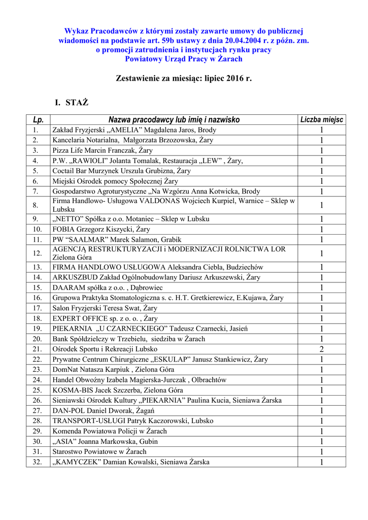 Wykaz Pracodawców z którymi zostały zawarte umowy do publicznej wiadomości na podstawie art. 59b ustawy z dnia 20.04.2004 r. z późn. zm. o promocji zatrudnienia i instytucjach rynku pracy Powiatowy Urząd Pracy w Żarach Zestawienie za miesiąc: lipiec 2016 r. I. STAŻ Lp. 1. 2. 3. 4. 5. 6. 7. 8. 9. 10. 11. 12. 13. 14. 15. 16. 17. 18. 19. 20. 21. 22. 23. 24. 25. 26. 27. 28. 29. 30. 31. 32. Nazwa pracodawcy lub imię i nazwisko Liczba miejsc Zakład Fryzjerski „AMELIA” Magdalena Jaros, Brody Kancelaria Notarialna, Małgorzata Brzozowska, Żary Pizza Life Marcin Franczak, Żary P.W. „RAWIOLI” Jolanta Tomalak, Restauracja „LEW” , Żary, Coctail Bar Murzynek Urszula Grubizna, Żary Miejski Ośrodek pomocy Społecznej Żary Gospodarstwo Agroturystyczne „Na Wzgórzu Anna Kotwicka, Brody Firma Handlowo- Usługowa VALDONAS Wojciech Kurpiel, Warnice – Sklep w Lubsku „NETTO” Spółka z o.o. Motaniec – Sklep w Lubsku FOBIA Grzegorz Kiszycki, Żary PW “SAALMAR” Marek Salamon, Grabik AGENCJĄ RESTRUKTURYZACJI i MODERNIZACJI ROLNICTWA LOR Zielona Góra FIRMA HANDLOWO USŁUGOWA Aleksandra Ciebla, Budziechów ARKUSZBUD Zakład Ogólnobudowlany Dariusz Arkuszewski, Żary DAARAM spółka z o.o. , Dąbrowiec Grupowa Praktyka Stomatologiczna s. c. H.T. Gretkierewicz, E.Kujawa, Żary Salon Fryzjerski Teresa Swat, Żary EXPERT OFFICE sp. z o. o. , Żary PIEKARNIA „U CZARNECKIEGO” Tadeusz Czarnecki, Jasień Bank Spółdzielczy w Trzebielu, siedziba w Żarach Ośrodek Sportu i Rekreacji Lubsko Prywatne Centrum Chirurgiczne „ESKULAP” Janusz Stankiewicz, Żary DomNat Natasza Karpiuk , Zielona Góra Handel Obwoźny Izabela Magierska-Jurczak , Olbrachtów KOSMA-BIS Jacek Szczerba, Zielona Góra Sieniawski Ośrodek Kultury „PIEKARNIA” Paulina Kucia, Sieniawa Żarska DAN-POL Daniel Dworak, Żagań TRANSPORT-USŁUGI Patryk Kaczorowski, Lubsko Komenda Powiatowa Policji w Żarach „ASIA” Joanna Markowska, Gubin Starostwo Powiatowe w Żarach „KAMYCZEK” Damian Kowalski, Sieniawa Żarska 1 1 1 1 1 1 1 1 1 1 1 1 1 1 1 1 1 1 1 1 2 1 1 1 1 1 1 1 1 1 1 1 II. PRACE INTERWENCYJNE Lp. Nazwa pracodawcy , imię i nazwisko Liczba miejsc 1 1. Urząd Gminy w Lipinkach Łużyckich 2. Handel Hurtowy i Detaliczny , Waldemar Piekarczyk, Żary 6 3. „TADMIR” S.C. Mirosław Owsianka, Bernard Pyrkowski, Żary 1 4. „PERFEKT” Zofia Świerczyńska, Żary 1 5. Kantor Wymiany Walut Regina Piwowarska, Kałki 1 6. IMPORT-EKSPORT Art. Przemysłowe i Budowlane Jan Mytyś, Dłużek 1 7. ALFA-ZAUN Kowalstwo Artystyczne Mirosław Ochryniuk, Jeziory Wysokie 2 8. Zakład Ogólnobudowlany Grażyna Husar-Zakowicz, Żary 1 9. Ewa Owsiany Handel Artykułami Przemysłowymi, Jasień 1 10. Urząd Gminy w Żarach 1 11. Salon Fryzjerski Damsko-Męski Wioletta Ciszek, Trzebiel 1 12. Zespół Szkól Technicznych, Lubsko 1 13. DEKARSTWO, CIESIELSTWO, Marek Łobodziec, Tuchola 1 III. DOFINANSOWANIE WYNAGRODZENIA ZATRUDNIONYCH OSÓB BEZROBOTNYCH POWYŻEJ 50 ROKU ŻYCIA Lp. Nazwa pracodawcy , imię i nazwisko 1. OKTAN LUBSKO Wojciech Wujciów, Lubsko 2. HANDEL-USŁUGI Janina Niewiadomska, Lubsko IV. Lp. Liczba miejsc 1 1 REFUNDACJA KOSZTÓW WYPOSAŻENIA I DOPOSAŻENIA STANOWISK PRACY DLA SKIEROWANYCH BEZROBOTNYCH Nazwa pracodawcy lub imię i nazwisko Liczba miejsc 1. GO-MAN Mariusz Gorczyca, Żary 1 2. SpiroPrint E. Zalewska, A. Burzyński, Żary 1 3. „AGA” Jarosław Lato, Żary 1