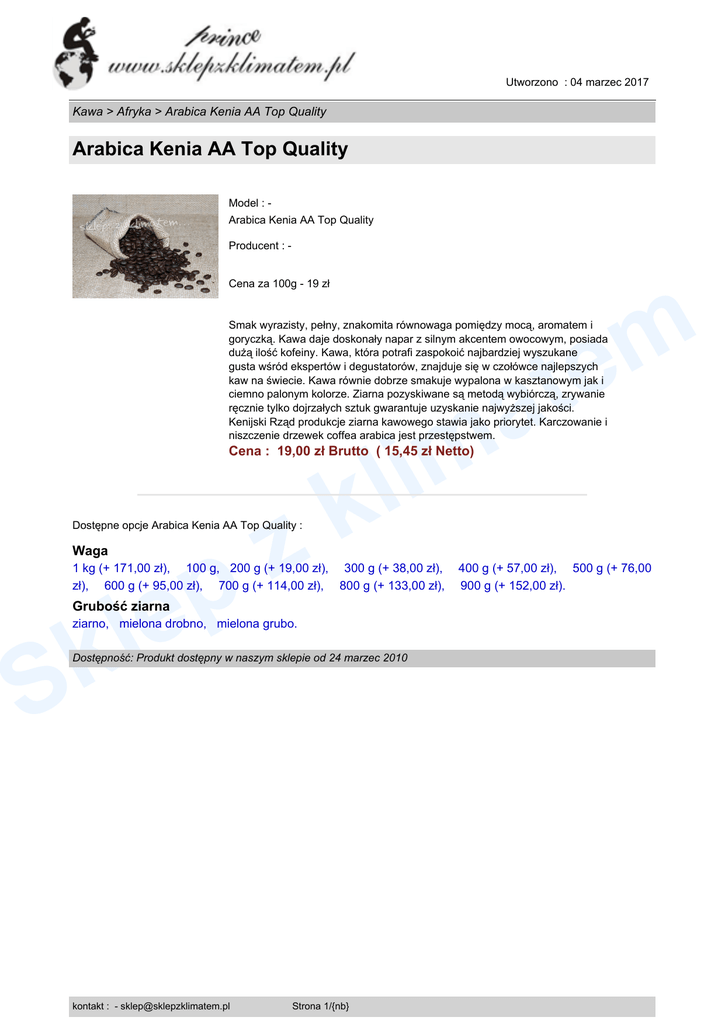 Utworzono : 04 marzec 2017 Kawa > Afryka > Arabica Kenia AA Top Quality Arabica Kenia AA Top Quality Model : Arabica Kenia AA Top Quality Producent : Cena za 100g - 19 zł m e t Smak wyrazisty, pełny, znakomita równowaga pomiędzy mocą, aromatem i goryczką. Kawa daje doskonały napar z silnym akcentem owocowym, posiada dużą ilość kofeiny. Kawa, która potrafi zaspokoić najbardziej wyszukane gusta wśród ekspertów i degustatorów, znajduje się w czołówce najlepszych kaw na świecie. Kawa równie dobrze smakuje wypalona w kasztanowym jak i ciemno palonym kolorze. Ziarna pozyskiwane są metodą wybiórczą, zrywanie ręcznie tylko dojrzałych sztuk gwarantuje uzyskanie najwyższej jakości. Kenijski Rząd produkcje ziarna kawowego stawia jako priorytet. Karczowanie i niszczenie drzewek coffea arabica jest przestępstwem. i l k a m Cena : 19,00 zł Brutto ( 15,45 zł Netto) z p Dostępne opcje Arabica Kenia AA Top Quality : Waga 1 kg (+ 171,00 zł), 100 g, 200 g (+ 19,00 zł), 300 g (+ 38,00 zł), zł), 600 g (+ 95,00 zł), 700 g (+ 114,00 zł), 800 g (+ 133,00 zł), e l k Grubość ziarna ziarno, mielona drobno, mielona grubo. S Dostępność: Produkt dostępny w naszym sklepie od 24 marzec 2010 kontakt : - [email protected] Strona 1/{nb} 400 g (+ 57,00 zł), 500 g (+ 76,00 900 g (+ 152,00 zł).