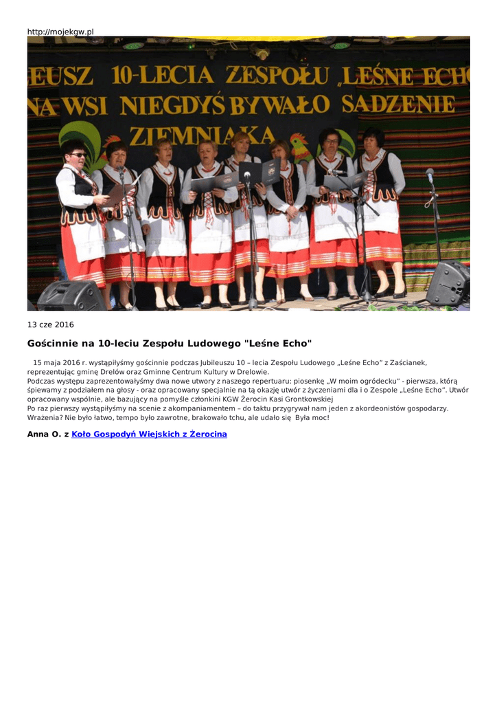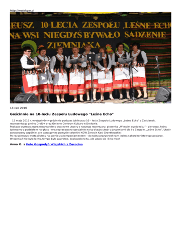 http://mojekgw.pl 13 cze 2016 Gościnnie na 10-leciu Zespołu Ludowego "Leśne Echo" 15 maja 2016 r. wystąpiłyśmy gościnnie podczas Jubileuszu 10 – lecia Zespołu Ludowego „Leśne Echo” z Zaścianek, reprezentując gminę Drelów oraz Gminne Centrum Kultury w Drelowie. Podczas występu zaprezentowałyśmy dwa nowe utwory z naszego repertuaru: piosenkę „W moim ogródecku” - pierwsza, którą śpiewamy z podziałem na głosy - oraz opracowany specjalnie na tą okazję utwór z życzeniami dla i o Zespole „Leśne Echo”. Utwór opracowany wspólnie, ale bazujący na pomyśle członkini KGW Żerocin Kasi Grontkowskiej Po raz pierwszy wystąpiłyśmy na scenie z akompaniamentem – do taktu przygrywał nam jeden z akordeonistów gospodarzy. Wrażenia? Nie było łatwo, tempo było zawrotne, brakowało tchu, ale udało się Była moc! Anna O. z Koło Gospodyń Wiejskich z Żerocina