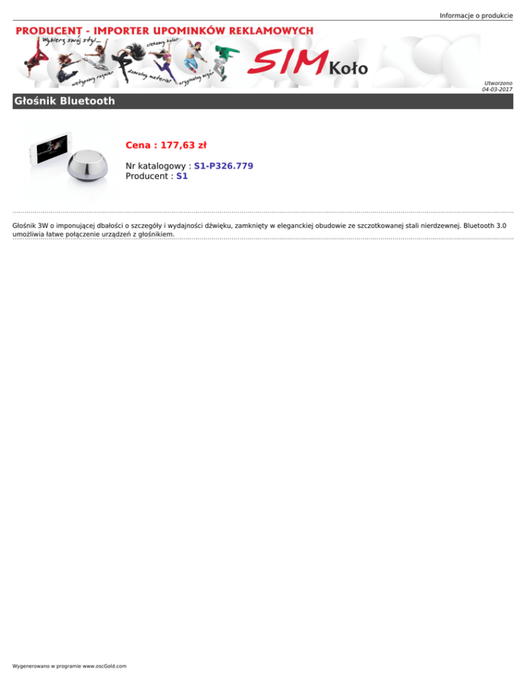 Informacje o produkcie Utworzono 04-03-2017 Głośnik Bluetooth Cena : 177,63 zł Nr katalogowy : S1-P326.779 Producent : S1 Głośnik 3W o imponującej dbałości o szczegóły i wydajności dźwięku, zamknięty w eleganckiej obudowie ze szczotkowanej stali nierdzewnej. Bluetooth 3.0 umożliwia łatwe połączenie urządzeń z głośnikiem. Wygenerowano w programie www.oscGold.com