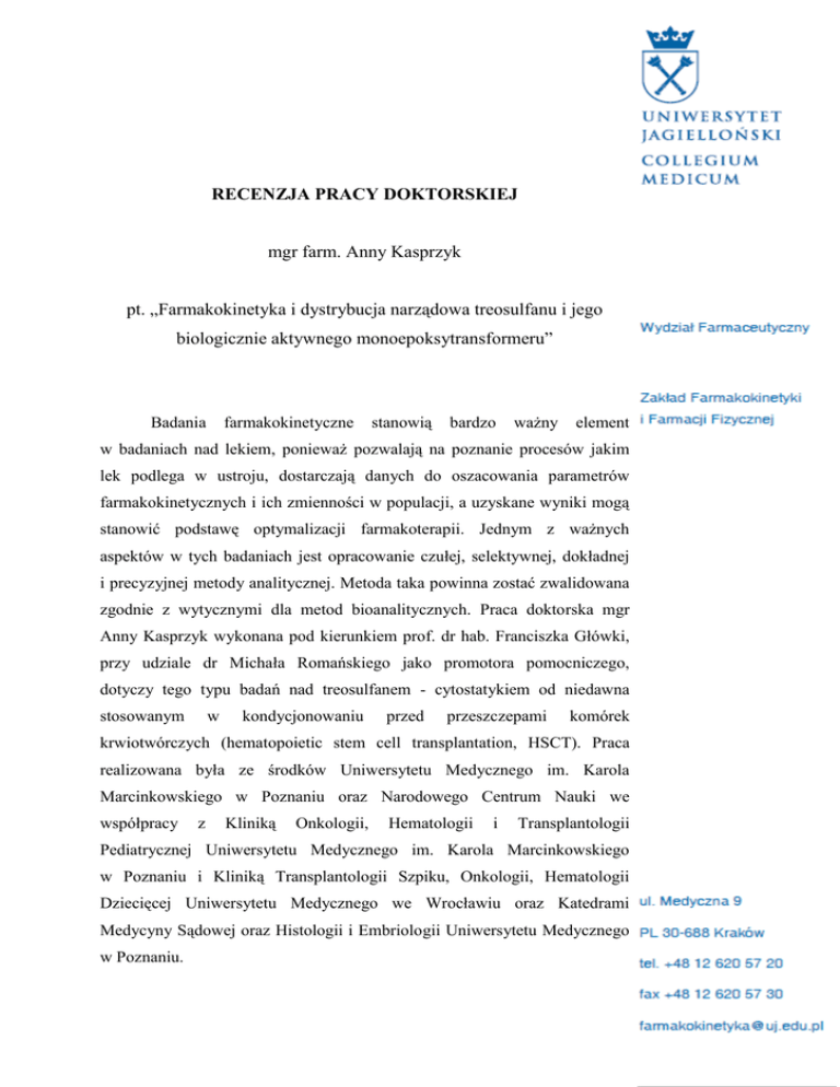 RECENZJA PRACY DOKTORSKIEJ mgr farm. Anny Kasprzyk pt