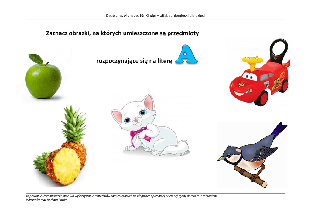 Deutsches Alphabet für Kinder – alfabet niemiecki dla dzieci Zaznacz obrazki, na których umieszczone są przedmioty rozpoczynające się na literę Kopiowanie, rozpowszechnianie lub wykorzystanie materiałów zamieszczonych na blogu bez uprzedniej pisemnej zgody autora jest zabronione. Własność: mgr Barbara Płuska Deutsches Alphabet für Kinder – alfabet niemiecki dla dzieci Zaznacz obrazki, na których umieszczone są przedmioty rozpoczynające się na literę Kopiowanie, rozpowszechnianie lub wykorzystanie materiałów zamieszczonych na blogu bez uprzedniej pisemnej zgody autora jest zabronione. Własność: mgr Barbara Płuska Deutsches Alphabet für Kinder – alfabet niemiecki dla dzieci Zaznacz obrazki, na których umieszczone są przedmioty rozpoczynające się na literę Kopiowanie, rozpowszechnianie lub wykorzystanie materiałów zamieszczonych na blogu bez uprzedniej pisemnej zgody autora jest zabronione. Własność: mgr Barbara Płuska