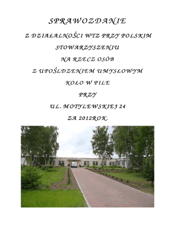 SPRA W O Z D A N IE Z D Z IA ŁA LN O ŚCI W TZ PRZ Y POLSK IM STOW A RZ YSZ E N IU N A RZ E CZ OSÓB Z U PO ŚLD Z E N IE M U M YSŁOW YM K OŁO W PILE PRZ Y U L. M OTYLE W SK IE J 24 Z A 2012ROK . SPRAWOZDANIE Z DZIAŁALNOŚCI WTZ PRZY POLSKIM STOWARZYSZENIU NA RZECZ OSÓB Z UPOŚLEDZENIEM UMYSŁOWYM W PILE przy ul. MOTYLEWSKIEJ 24 ZA 2012 ROK A. W 2012 r. w zajęciach brało udział 40 osób z róŜnymi rodzajami niepełnosprawności. Na dzień 31.12.2012 r.: - 10 osób posiadało umiarkowany stopień niepełnosprawności - 30 osób stopień znaczny niepełnosprawności Rozpiętość wieku wynosi od 20 do 49 lat. - Niepełnosprawnych ruchowo / poruszających się na wózkach/ - 7 osób - Z oprzyrządowaniem /balkonik, kule / - 7 osób - Niewidomych – 2 osoby - Mieszkańcy DPS w Pile – 3 osoby - Łącznie z ograniczona sprawnością ruchowa jest 14 osób tj. 35 % B. Frekwencja: Lp. Miesiąc Frekwencja w % Uwagi 1. Styczeń 93,69 - 2. Luty 94,52 - 3. Marzec 93,97 - 4. Kwiecień 93,00 - 5. Maj 93,69 - 6. Czerwiec 95,89 - 7. Sierpień 87,58 Wyjazd uczestników do Jarosławca 8. Wrzesień 76,15 Wyjazd uczestników do Jarosławca 9. Październik 91,52 - 10. Listopad 94,16 - 11. Grudzień 92,63 - Średnia frekwencja w 2012 r. wyniosła – 91,52 C) Formy i metody pracy w poszczególnych pracowniach: Warsztat pracuje od poniedziałku do piątku w godzinach 7:30 do 15:30. Uczestnicy pracują w 8 pracowniach: Komputerowa – w ramach zajęć w pracowni komputerowej uczestnicy uczą się obsługi komputera wraz z programami Open Office, Corel Draw itp. Aktualizują stronę internetową, nabywają umiejętności przy obsłudze urządzeń biurowych typu fax, ksero, bindownica, laminator. Wikliniarsko - ogrodnicza - uczestnicy pracowni wikliniarsko- ogrodniczej sprawują opiekę nad terenami przyległymi do naszego Warsztatu Terapii Zajęciowej. Uprawiają wiele warzyw i kwiatów, jak równieŜ sprawują opiekę nad terenami ozdobnymi. Zapoznają się z odmianami warzyw i kwiatów oraz ich pielęgnacją. Plastyczna - w pracowni plastycznej tematyka zajęć związana jest z porami roku i towarzyszącymi im zjawiskami przyrodniczymi, aktualnymi wydarzeniami i przeŜyciami. Zajęcia mają na celu usprawnianie manualne, poprawę zręczności dłoni, palców i koordynacji wzrokowo – ruchowej. Uczestnicy mają moŜliwość poznawania materiałów, narzędzi i technik plastycznych takich jak: malowanie rysowanie, wylewy gipsowe oraz wyroby drobnej biŜuterii. Gotowe wyroby prezentowane są na wystawach okolicznościowych konkursach i kiermaszach. Stolarska – uczestnicy pracowni stolarskiej wykonują prace związane z tworzeniem w drewnie róŜnych wyrobów, zabawek i przedmiotów ozdobnych. Prace wykonywane są przy pomocy narzędzi stolarskich, szablonów. Obrabianie następuje ręcznie przez uczestników WTZ pod nadzorem instruktora. Ceramiczna – w ramach zajęć w pracowni ceramicznej uczestnicy zapoznają się z podstawowymi Doskonalili technikami modelowania oraz zdobienia wyrobów ceramicznych. wcześniej zdobyte umiejętności oraz wykonywali artystycznej, jak i uŜytkowej przedmioty ceramiki wg własnych projektów. Brali udział w konkursach plastycznych organizowanych przez PFRON. Teatralno – taneczna – w ramach zajęć w pracowni teatralno – tanecznej podopieczni nabierają właściwą postawę do odbioru sztuki, uczą się koncentracji, wyraŜania uczuć i nastrojów, rozwijają wyobraźnie oraz wraŜliwość i poczucie piękna, poprawiają sprawność mowy. Wyrabiają umiejętność radzenia sobie ze stresem. Osoby biorące udział w zajęciach przygotowują programy słowno – muzyczno – taneczne będące oprawą imprez okolicznościowych. Poprzez odgrywanie ról, uczestnicy zdobywają wiedzę o tematyce kulturalnej. Czynnościami w pracowni są takŜe samodzielnie przygotowywanie strojów, dekoracji oraz rekwizytów. Rękodzieło artystyczne – uczestnicy zapoznają się z moŜliwościami wykorzystywania i łączenia róŜnych tkanin, materiałów, doboru kolorów, projektowania wzorów, dzięki czemu zostały wykonane łapki kuchenne, zabawki, poszewki, obrusy, serwetki itp. Rozwijają poczucie estetyki, wyobraźni poprzez moŜliwość tworzenia prac artystycznych, krawieckich, hafciarskich i tkackich. Gospodarstwo domowe – w tej pracowni uczestnicy doskonalą dokładność i precyzje. Uczą się przygotowywać proste posiłki (sałatki, surówki desery). Zdobywają równieŜ podstawowe umiejętności samoobsługi – obsługa pralki, nauka prasowania, mycie naczyń, sprzątanie i porządkowanie. Zapoznają się równieŜ z obsługą urządzeń gospodarstwa domowego, samodzielnie planują zakupy na wykonywane potrawy. W roku 2012 wszyscy uczestnicy biorą udział w treningu ekonomicznym. Trening ekonomiczny w 2012r wynosił 120,00 zł. W warsztacie prowadzone są równieŜ zajęcia: Muzykoterapii – polega ona głównie na nauce i utrwalaniu utworów muzycznych, które są formą przygotowania do róŜnego rodzaju konkursów muzycznych np. udział w Ogólnopolskim Festiwalu Twórczości Teatrów Muzycznych Osób Niepełnosprawnych „ALBERTIANA” organizowanego przez Annę Dymną. Rehabilitacji ruchowej – ma ona na celu stymulację , poprawę jak i utrzymanie ogólnej wydolności organizmu, promocję zachowań , postaw i nawyków prozdrowotnych. Udział w spotkaniach sportowo –rekreacyjno – integracyjnych z uczniami Gimnazjum im. Jana Pawła II w Kaczorach, turniejach sportowo – rekreacyjnego Osób Niepełnosprawnych w Kiszkowie oraz szkole Podstawowej nr 12 w Pile. Usprawniania psychicznego – polegające na doskonaleniu umiejętności nawiązywania i podtrzymywania relacji interpersonalnych, rozwijaniu funkcji stref poznawczych, ćwiczeniach stymulujących pracę oko-ręka , myślenia skojarzeniowego, poznawanie sposobów rozładowywania frustracji, praca nad kontrolowaniem emocji. Rewalidacji – której zakres pracy pedagoga obejmował zagadnienia stymu
