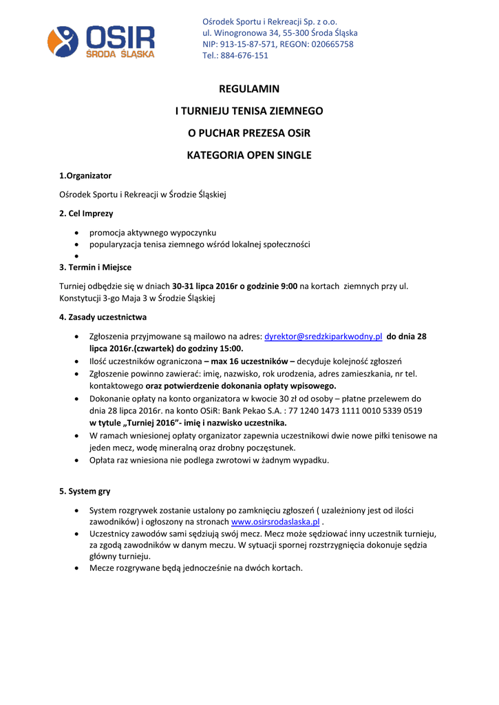 Ośrodek Sportu i Rekreacji Sp. z o.o. ul. Winogronowa 34, 55-300 Środa Śląska NIP: 913-15-87-571, REGON: 020665758 Tel.: 884-676-151 REGULAMIN I TURNIEJU TENISA ZIEMNEGO O PUCHAR PREZESA OSiR KATEGORIA OPEN SINGLE 1.Organizator Ośrodek Sportu i Rekreacji w Środzie Śląskiej 2. Cel Imprezy promocja aktywnego wypoczynku popularyzacja tenisa ziemnego wśród lokalnej społeczności 3. Termin i Miejsce Turniej odbędzie się w dniach 30-31 lipca 2016r o godzinie 9:00 na kortach ziemnych przy ul. Konstytucji 3-go Maja 3 w Środzie Śląskiej 4. Zasady uczestnictwa Zgłoszenia przyjmowane są mailowo na adres: [email protected] do dnia 28 lipca 2016r.(czwartek) do godziny 15:00. Ilość uczestników ograniczona – max 16 uczestników – decyduje kolejność zgłoszeń Zgłoszenie powinno zawierać: imię, nazwisko, rok urodzenia, adres zamieszkania, nr tel. kontaktowego oraz potwierdzenie dokonania opłaty wpisowego. Dokonanie opłaty na konto organizatora w kwocie 30 zł od osoby – płatne przelewem do dnia 28 lipca 2016r. na konto OSiR: Bank Pekao S.A. : 77 1240 1473 1111 0010 5339 0519 w tytule „Turniej 2016”- imię i nazwisko uczestnika. W ramach wniesionej opłaty organizator zapewnia uczestnikowi dwie nowe piłki tenisowe na jeden mecz, wodę mineralną oraz drobny poczęstunek. Opłata raz wniesiona nie podlega zwrotowi w żadnym wypadku. 5. System gry System rozgrywek zostanie ustalony po zamknięciu zgłoszeń ( uzależniony jest od ilości zawodników) i ogłoszony na stronach www.osirsrodaslaska.pl . Uczestnicy zawodów sami sędziują swój mecz. Mecz może sędziować inny uczestnik turnieju, za zgodą zawodników w danym meczu. W sytuacji spornej rozstrzygnięcia dokonuje sędzia główny turnieju. Mecze rozgrywane będą jednocześnie na dwóch kortach. Ośrodek Sportu i Rekreacji Sp. z o.o. ul. Winogronowa 34, 55-300 Środa Śląska NIP: 913-15-87-571, REGON: 020665758 Tel.: 884-676-151 6. Losowanie Losowanie par przeprowadzi organizator w dniu 29 lipca 2016 r. o godzinie 12:00. Po losowaniu ogłoszona zostanie drabinka turniejowa z podanymi wynikami losowania oraz planowanymi godzinami rozgrywania poszczególnych meczy, która będzie do pobrania na stronach www.osirsrodaslaska.pl. 7. Nagrody Dla finalistów gier (najlepsza trójka zawodników) w turnieju przewidziane są puchary i dyplomy. Dla pozostałych uczestników dyplomy za uczestnictwo. 8. Postanowienia końcowe: We wszystkich sprawach dotyczących rozgrywek decyduje organizator zawodów. Start w turnieju równoznaczny jest ze zgodą zawodnika na przetwarzanie jego danych osobowych i publikacji wizerunku w materiałach związanych z ligą. Organizator zastrzega sobie prawo do interpretacji przedstawionego regulaminu i przyjętego systemu rozgrywek. Do każdego meczu organizator zapewnia komplet piłek ( 2szt.) Organizatorzy turnieju nie biorą odpowiedzialności za wszelkie urazy i kontuzje zawodników powstałe w trakcie turnieju. Organizator nie ponosi odpowiedzialności za złe warunki atmosferyczne, które uniemożliwiłyby rozegranie imprezy. Wszelkie zastrzeżenia dotyczące zawodów należy zgłaszać do Organizatora Każdy zawodnik zgłaszający się jako uczestnik turnieju akceptuje jednocześnie treść przedstawionego regulaminu i zobowiązuje się do jego przestrzegania Dodatkowe informacje można uzyskać pod nr telefonu 885 130 885