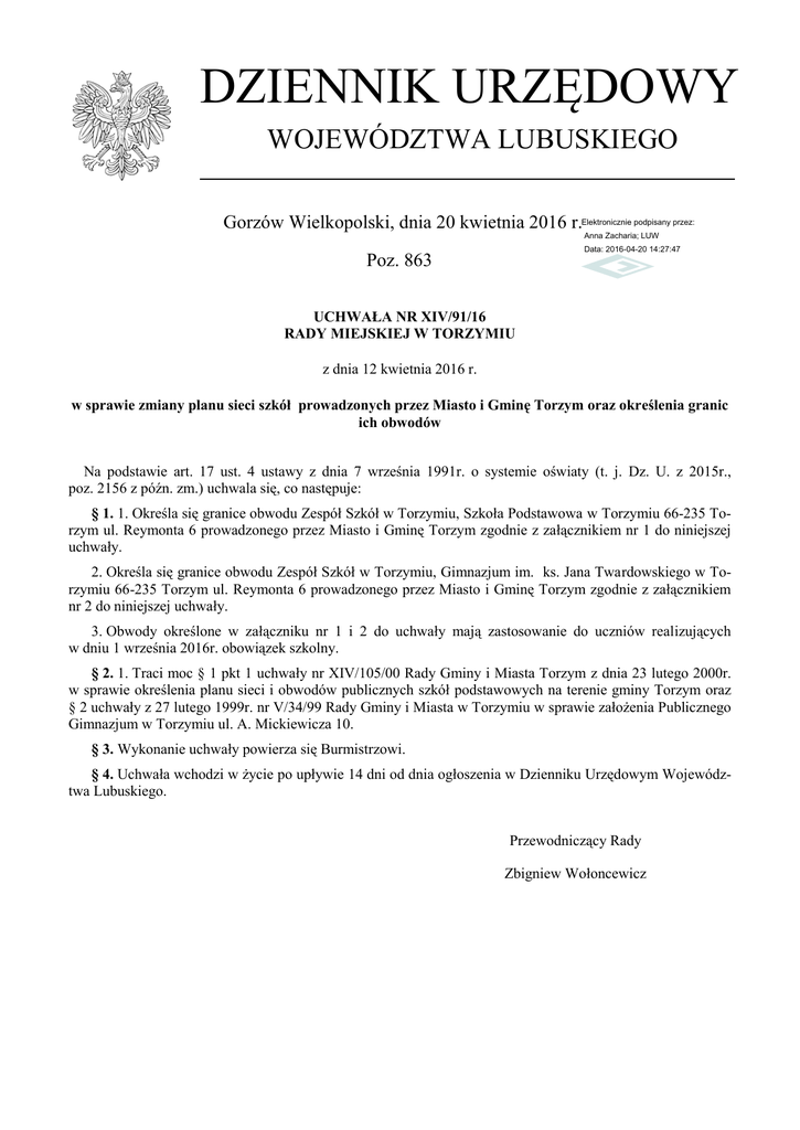 DZIENNIK URZĘDOWY WOJEWÓDZTWA LUBUSKIEGO Gorzów Wielkopolski, dnia 20 kwietnia 2016 r.Elektronicznie podpisany przez: Anna Zacharia; LUW Data: 2016-04-20 14:27:47 Poz. 863 UCHWAŁA NR XIV/91/16 RADY MIEJSKIEJ W TORZYMIU z dnia 12 kwietnia 2016 r. w sprawie zmiany planu sieci szkół prowadzonych przez Miasto i Gminę Torzym oraz określenia granic ich obwodów Na podstawie art. 17 ust. 4 ustawy z dnia 7 września 1991r. o systemie oświaty (t. j. Dz. U. z 2015r., poz. 2156 z późn. zm.) uchwala się, co następuje: § 1. 1. Określa się granice obwodu Zespół Szkół w Torzymiu, Szkoła Podstawowa w Torzymiu 66-235 Torzym ul. Reymonta 6 prowadzonego przez Miasto i Gminę Torzym zgodnie z załącznikiem nr 1 do niniejszej uchwały. 2. Określa się granice obwodu Zespół Szkół w Torzymiu, Gimnazjum im. ks. Jana Twardowskiego w Torzymiu 66-235 Torzym ul. Reymonta 6 prowadzonego przez Miasto i Gminę Torzym zgodnie z załącznikiem nr 2 do niniejszej uchwały. 3. Obwody określone w załączniku nr 1 i 2 do uchwały mają zastosowanie do uczniów realizujących w dniu 1 września 2016r. obowiązek szkolny. § 2. 1. Traci moc § 1 pkt 1 uchwały nr XIV/105/00 Rady Gminy i Miasta Torzym z dnia 23 lutego 2000r. w sprawie określenia planu sieci i obwodów publicznych szkół podstawowych na terenie gminy Torzym oraz § 2 uchwały z 27 lutego 1999r. nr V/34/99 Rady Gminy i Miasta w Torzymiu w sprawie założenia Publicznego Gimnazjum w Torzymiu ul. A. Mickiewicza 10. § 3. Wykonanie uchwały powierza się Burmistrzowi. § 4. Uchwała wchodzi w życie po upływie 14 dni od dnia ogłoszenia w Dzienniku Urzędowym Województwa Lubuskiego. Przewodniczący Rady Zbigniew Wołoncewicz Dziennik Urzędowy Województwa Lubuskiego –2– Poz. 863 Załącznik nr 1 do uchwały Nr XIV/91/16 Rady Miejskiej w Torzymiu z dnia 12 kwietnia 2016r. GRANICE OBWODU Zespołu Szkół w Torzymiu, Szkoła Podstawowa im. Bohaterów Westerplatte prowadzonego przez Miasto i Gminę Torzym L.p. Nazwa i adres szkoły 1. Zespół Szkół w Torzymiu, Szkoła Podstawowa im. Bohaterów Westerplatte 66-235 Torzym ul. Reymonta 6 Wykaz miejscowości i ulic w obwodzie szkoły TORZYM ulice wszystkie: B. Prusa, Brzozowa, C. K. Norwida, Generała Świerczewskiego, J. Słowackiego, Jeziorna, Kasztanowa, Klonowa, Kolonia Leśna, Kolonia Osiny, Kolonia Sulęcińska, Krośnieńska, Kwiatowa, Leśniczówka Góry, Łąkowa, Mickiewicza, Miodowa, Młyńska, Nowa, Ogrodowa, Osiedle Lecha, Plac Kościuszki, Plac Wolności, Podgórna, Poznańska, Słowiańska, Stolarska, Sulęcińska, Świebodzińska, Świerkowa, W. Reymonta, Walki Młodych, Warszawska, Wąska, Wiejska, Wodna, Wojska Polskiego, Biernackiego, Chrobrego, Dworcowa, Kolejowa, Kolonia Poręby, Kolonia Saperska, Krótka, Łaszewo, Piastowska, Saperska, Sienkiewicza, Witosa Miejscowości: Bobrówko, Prześlice, Pniów, Koryta, Drzewce Kolonia, Jelenie Pole, Grabów, Kolonia Rożnówka, Kownaty, Walewice Dziennik Urzędowy Województwa Lubuskiego –3– Poz. 863 Załącznik nr 2 do uchwały Nr XIV/91/16 Rady Miejskiej w Torzymiu z dnia 12 kwietnia 2016r. GRANICE OBWODU Zespołu Szkół w Torzymiu - Gimnazjum im. ks. Jana Twardowskiego prowadzonego przez Miasto i Gminę Torzym L.p. Nazwa i adres szkoły 1. Zespół Szkół w Torzymiu Gimnazjum im. ks. Jana Twardowskiego ul. Reymonta 6 66-235 Torzym Wykaz miejscowości i ulic w obwodzie szkoły TORZYM ulice wszystkie: B. Prusa, Brzozowa, C. K. Norwida, Generała Świerczewskiego, J. Słowackiego, Jeziorna, Kasztanowa, Klonowa, Kolonia Leśna, Kolonia Osiny, Kolonia Sulęcińska, Krośnieńska, Kwiatowa, Leśniczówka Góry, Łąkowa, Mickiewicza, Miodowa, Młyńska, Nowa, Ogrodowa, Osiedle Lecha, Plac Kościuszki, Plac Wolności, Podgórna, Poznańska, Słowiańska, Stolarska, Sulęcińska, Świebodzińska, Świerkowa, W. Reymonta, Walki Młodych, Warszawska, Wąska, Wiejska, Wodna, Wojska Polskiego, Biernackiego, Chrobrego, Dworcowa, Kolejowa, Kolonia Poręby, Kolonia Saperska, Krótka, Łaszewo, Piastowska, Saperska, Sienkiewicza, Witosa Miejscowości: Bobrówko, Prześlice, Drzewce Kolonia, Grabów, Jelenie Pole, Kolonia Rożnówka, Koryta, Kownaty, Walewice, Boczówulice wszystkie, Garbicz, Lubin, Mierczany, Pniów, Tarnawa Rzepińska, Bielice, Lubów, Wystok, Bargów, Debrznica, Drzewce, Gądków Mały, Gądków Wielki- ulice wszystkie.