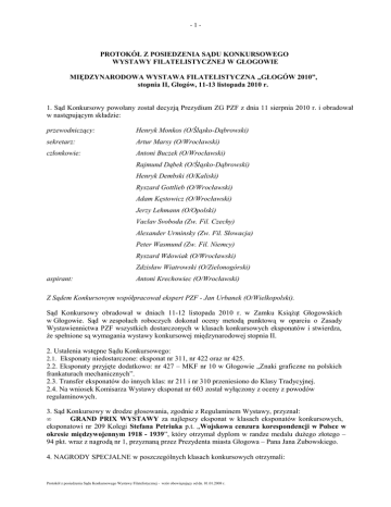 -1- PROTOKÓŁ Z POSIEDZENIA SĄDU KONKURSOWEGO WYSTAWY FILATELISTYCZNEJ W GŁOGOWIE MIĘDZYNARODOWA WYSTAWA FILATELISTYCZNA „GŁOGÓW 2010”, stopnia II, Głogów, 11-13 listopada 2010 r. 1. Sąd Konkursowy powołany został decyzją Prezydium ZG PZF z dnia 11 sierpnia 2010 r. i obradował w następującym składzie: przewodniczący: Henryk Monkos (O/Śląsko-Dąbrowski) sekretarz: Artur Marsy (O/Wrocławski) członkowie: Antoni Buczek (O/Wrocławski) Rajmund Dąbek (O/Śląsko-Dąbrowski) Henryk Dembski (O/Kaliski) Ryszard Gottlieb (O/Wrocławski) Adam Kęstowicz (O/Wrocławski) Jerzy Lehmann (O/Opolski) Vaclav Svoboda (Zw. Fil. Czechy) Alexander Urminsky (Zw. Fil. Słowacja) Peter Wasmund (Zw. Fil. Niemcy) Ryszard Wdowiak (O/Wrocławski) Zdzisław Wiatrowski (O/Zielonogórski) aspirant: Antoni Krechowiec (O/Wrocławski) Z Sądem Konkursowym współpracował ekspert PZF - Jan Urbanek (O/Wielkopolski). Sąd Konkursowy obradował w dniach 11-12 listopada 2010 r. w Zamku Książąt Głogowskich w Głogowie. Sąd w zespołach roboczych dokonał oceny metodą punktową w oparciu o Zasady Wystawiennictwa PZF wszystkich dostarczonych w klasach konkursowych eksponatów i stwierdza, że spełnione są wymagania wystawy konkursowej międzynarodowej stopnia II. 2. Ustalenia wstępne Sądu Konkursowego: 2.1. Eksponaty niedostarczone: eksponat nr 311, nr 422 oraz nr 425. 2.2. Eksponaty przyjęte dodatkowo: nr 427 – MKF nr 10 w Głogowie „Znaki graficzne na polskich frankaturach mechanicznych”. 2.3. Transfer eksponatów do innych klas: nr 211 i nr 310 przeniesiono do Klasy Tradycyjnej. 2.4. Na wniosek Komisarza Wystawy eksponat nr 603 został wyłączony z oceny z powodów regulaminowych. 3. Sąd Konkursowy w drodze głosowania, zgodnie z Regulaminem Wystawy, przyznał: • GRAND PRIX WYSTAWY za najlepszy eksponat w klasach eksponatów konkursowych, eksponatowi nr 209 Kolegi Stefana Petriuka p.t. „Wojskowa cenzura korespondencji w Polsce w okresie międzywojennym 1918 - 1939”, który otrzymał dyplom w randze medalu dużego złotego – 94 pkt. wraz z nagrodą nr 1, przyznaną przez Prezydenta miasta Głogowa – Pana Jana Zubowskiego. 4. NAGRODY SPECJALNE w poszczególnych klasach konkursowych otrzymali: Protokół z posiedzenia Sądu Konkursowego Wystawy Filatelistycznej - wzór obowiązujący od dn. 01.01.2008 r. -2• • NAGRODĘ SPECJALNĄ w Klasie Tradycyjnej otrzymał eksponat nr 102 Kolegi Rudolfa Rakovskiego p.t. „Slovensko 1939 - vyplatne znamky s potretom Andreja Hlinku”, który otrzymał dyplom w randze medalu dużego pozłacanego – 81 pkt. wraz z nagrodą nr 2, przyznaną przez Starostę Głogowskiego – Panią Annę Brok. • NAGRODĘ SPECJALNĄ w Klasie Tematycznej otrzymał eksponat nr 319 Kolegi Mieczysława Rożka p.t. „Ku szczytom gór”, który otrzymał dyplom w randze medalu dużego złotego – 91 pkt. wraz z nagrodą nr 3, przyznaną przez Przewodniczącego Rady Powiatu Głogowskiego – Pana Krzysztofa Dąbrowę. NAGRODĘ SPECJALNĄ w Klasie Młodzieżowej otrzymał eksponat nr 412 Kolegi Dominika Żuchowskiego p.t. „Polska mój kraj”, który otrzymał dyplom w randze medalu dużego pozłacanego – 88 pkt. wraz z nagrodą nr 4, przyznaną przez Prezes Zarządu Oddziału PZF Ruda Śląska – Panią Jadwigę Ostraszewską. • NAGRODĘ SPECJALNĄ w Klasie Eksponatów Jednoekranowych otrzymał eksponat nr 504 Kolegi Vladimira Munzbergera p.t. „Ceskoslovensko menova reforma 1953 korespondence do ciziny”, który otrzymał dyplom w randze medalu pozłacanego – 80 pkt. wraz z nagrodą nr 5, przyznaną przez dyrektora Poczty Polskiej Oddział Rejonowy w Legnicy – Pana Jerzego Jaroszewskiego. • NAGRODĘ SPECJALNĄ w Klasie Literatury otrzymał eksponat nr 613 Kolegi Gerharda Torza p.t. „Okres Plebistytu na Górnym Śląsku 1920 - 1922”, który otrzymał dyplom w randze medalu złotego – 86 pkt. wraz z nagrodą nr 6, przyznaną przez Prezesa Związku Żołnierzy Wojska Polskiego – Generała Dywizji Adama Rębacza. 5. Sąd Konkursowy dziękuje wystawcom w Klasie Honorowej Kolegom: Lumirowi Brendlowi oraz Ryszardowi Gottliebowi za udostępnienie swoich eksponatów na wystawie. Dziękuje również wystawcom zaproszonym i wystawcom klasy sędziowskiej za przedstawione eksponaty w klasach niekonkursowych wystawy. 6. Pełny wykaz przyznanych wyróżnień w klasie konkursowej: 6.1. Klasa Tradycyjna (TR): Nr Wystawca (Okręg/kraj) Zbigniew Gniewoszewski (O. 101 Zachodniopomorski, Polska) Tytuł eksponatu Punkty Medal Wielka Brytania Viktoria – 1840 – 1901 78 PZ 102 Rudolf Rakovsky (O. Bratislava, Słowacja) Slovensko 1939 - vyplatne znamky s potretom Andreja Hlinku 81 DPZ 103 Jozef Vangel (O. Źilina, Słowacja) Ceskoslovensko 1918 – 1920 predbeżne a subeżne znamky 65 S 104 Jiri Sedlak (O. Kladno, Republika Czech) Ceska republika 1993 - 2005 70 DS 105 Tadeusz Zawer (O. Wrocławski, Polska – Polen – 1944 – 1952 Polska) 79 PZ 211 Stefan Petriuk (O. Langballigholz, Niemcy) Renaissance-Jahr 71 DS 310 Janusz Komisaruk (O. Wrocławski, Polska) Znaczki okupacyjne na terenach Polski 64 PS Nagroda NS + nr 2 6.2. Klasa Historii Poczty (HP): Nr Wystawca (Okręg/kraj) Tytuł eksponatu Punkty Medal 70 DS 75 PZ 201 Janusz Baszyński (O. Zielonogórski, Polska) Usługi pocztowe do 1945 roku w obrębie Zielonej Góry - Sulechowa - Babimostu - Wolsztyna Sławy - Nowej Soli 202 Maciej Bukczyński (O. Kaliski, Polska) 200 lat poczt w Ostrzeszowie Protokół z posiedzenia Sądu Konkursowego Wystawy Filatelistycznej - wzór obowiązujący od dn. 01.01.2008 r. Nagroda -3- 203 Andrzej Dudek (O. Wielkopolski, Polska) Gostyń 55 B 204 Ladislav Fekete (O. Galanta, Słowacja) Medzi nebom a zemou 87 Z 205 Ladislav Fekete, (O. Galanta, Słowacja) Na modrých vlnách 88 Z 206 Gabriel Kosztolanyi (O. Levice, Słowacja) The history of postal services in Levice 85 Z 207 Michael Lenke (O. Gusborn, Niemcy) Historia poczty Torunia 92 DZ 208 Jerzy, Maciej Nowak (O. Cz