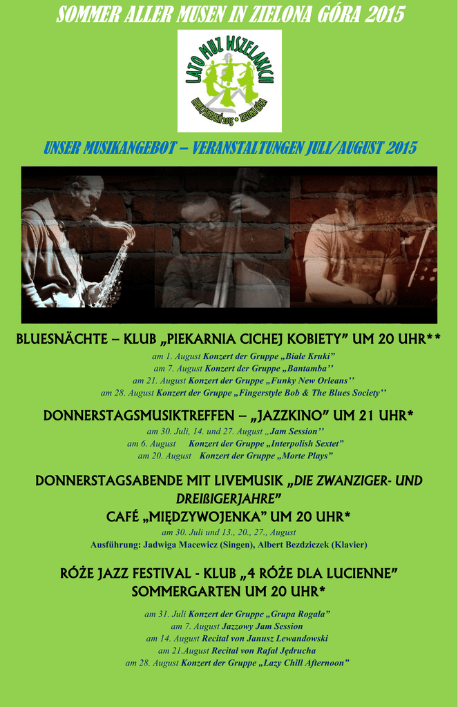 SOMMER ALLER MUSEN IN ZIELONA GÓRA 2015 UNSER MUSIKANGEBOT – VERANSTALTUNGEN JULI/AUGUST 2015 BLUESNÄCHTE – KLUB „PIEKARNIA CICHEJ KOBIETY” UM 20 UHR** am 1. August Konzert der Gruppe „Białe Kruki” am 7. August Konzert der Gruppe „Bantamba’’ am 21. August Konzert der Gruppe „Funky New Orleans’’ am 28. August Konzert der Gruppe „Fingerstyle Bob & The Blues Society’’ DONNERSTAGSMUSIKTREFFEN – „JAZZKINO” UM 21 UHR* am 30. Juli, 14. und 27. August „Jam Session’’ am 6. August Konzert der Gruppe „Interpolish Sextet” am 20. August Konzert der Gruppe „Morte Plays” DONNERSTAGSABENDE MIT LIVEMUSIK „DIE ZWANZIGER- UND DREIßIGERJAHRE” CAFÉ „MIĘDZYWOJENKA” UM 20 UHR* am 30. Juli und 13., 20., 27., August Ausführung: Jadwiga Macewicz (Singen), Albert Bezdziczek (Klavier) RÓŻE JAZZ FESTIVAL - KLUB „4 RÓŻE DLA LUCIENNE” SOMMERGARTEN UM 20 UHR* am 31. Juli Konzert der Gruppe „Grupa Rogala” am 7. August Jazzowy Jam Session am 14. August Recital von Janusz Lewandowski am 21.August Recital von Rafał Jędrucha am 28. August Konzert der Gruppe „Lazy Chill Afternoon” INTERNATIONALES FOLKLOREFESTIVAL Zielona Góra 2015 REGIONALES KULTURZENTRUM* vom 26. Juli Bis 1. August – „Gesichte der Tradition’’ -am 26.Juli um 11.00 Uhr - Eröffnungskonzert – treten die Gruppen aus Bosnien Und Herzegowina, Mexico, Polen, Senegal und der Türkei (Ethnographisches Museum In Ochla) - am 27., 28., 29., 30. Juli um 11.00 Uhr - Folk-Markt, Spiele mit Folkloregruppen, um 18 Uhr Konzert (Fußgängerzone; um 19.00Uhr (große Bühne des Lebuser Theaters) -am 31. Juli um 19.00 Uhr – Galakonzert im Amphitheater ABENDE BEI LUTHERANER IN DER EVANGELISCH-AUGSBURGISCHEN KIRCHE** UM 19 UHR - Ausführung: Sängergesellschaft „Cantores’’ am 2. August –Inaugurationskonzert „von Zieleński zu Bach’’ am 9. August - Konzert „Über Bacchus gemütlich’’ am 16. August – Konzert von Michał Kocot und Michał Dembiński am 23. August – Konzert „Musische Welt des Renaissance’’ am 30. August – Konzert „Zauber des ehemaligen Wiens’’ SOMMERABEND BEI DER FONTÄNE* Am 22. August um 21 Uhr - Auftritt von Bachus Classic Orchestra mit Begleitung von den Tänzer bei der Lichtillumination im Hintergrund der Fontäne, Bohaterów Platz bei der Fontäne *Kostenlos **Eintrittskarten Mehr Info: Deutsch-Polnisches Zentrum für Touristische Förderung und Information Stary Rynek 1, 65-067 Zielona Góra +48 68 323 22 22 www.cit.zielona-gora.pl [email protected] VERANSTALTER UND KONZERTORTE Klub Piekarnia Cichej Kobiety, ul. Fabryczna 13, Zielona Góra JazzKino, ul. Jana Sobieskiego 14, Zielona Góra Cafe Międzywojenka, ul. Niepodległości 23, Zielona Góra Klub 4 Róże dla Lucienne, ul. Stary Rynek 17, Zielona Góra Sommegarten in der Fuβgängerzone, Stary Rynek, Zielona Góra Ethnographisches Museum mit Sitz in Ochla, ul. Muzealna 5, Ochla Philharmonie Namens Tadeusz Baird, Plac Powstańców Wlkp. 10, Zielona Góra Lebuser Leon-Kruczkowski-Theater, Aleja Niepodległości 3/5, Zielona Góra Die evangelisch-augsburgische Kirche, ul. Kazimierza Wielkiego 11, Zielona Góra Amphitheater Namens Anna German, ul. Festiwalowa 3, Zielona Góra Fontäne, Plac Bohaterów Westerplatte, Zielona Góra