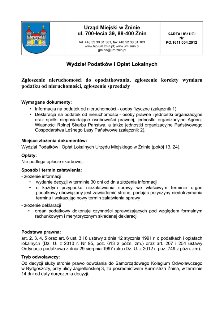 Urząd Miejski w Żninie ul. 700-lecia 39, 88-400 Żnin tel. +48 52 30 31 301, fax +48 52 30 31 103 www.bip.um.znin.pl; www.um.znin.pl [email protected] KARTA USŁUGI Nr PO.1611.004.2012 Wydział Podatków i Opłat Lokalnych Zgłoszenie nieruchomości do opodatkowania, zgłoszenie korekty wymiaru podatku od nieruchomości, zgłoszenie sprzedaży Wymagane dokumenty: • Informacja na podatek od nieruchomości - osoby fizyczne (załącznik 1) • Deklaracja na podatek od nieruchomości - osoby prawne i jednostki organizacyjne oraz spółki nieposiadające osobowości prawnej, jednostki organizacyjne Agencji Własności Rolnej Skarbu Państwa, a także jednostki organizacyjne Państwowego Gospodarstwa Leśnego Lasy Państwowe (załącznik 2). Miejsce złożenia dokumentów: Wydział Podatków i Opłat Lokalnych Urzędu Miejskiego w Żninie (pokój 13, 24). Opłaty: Nie podlega opłacie skarbowej. Sposób i termin załatwienia: - złożenie informacji • wydanie decyzji w terminie 30 dni od dnia złożenia informacji • o każdym przypadku niezałatwienia sprawy we właściwym terminie organ podatkowy obowiązany jest zawiadomić stronę, podając przyczyny niedotrzymania terminu i wskazując nowy termin załatwienia sprawy - złożenie deklaracji • organ podatkowy dokonuje czynności sprawdzających pod względem formalnym rachunkowym i merytorycznym składanej deklaracji. Podstawa prawna: art. 2, 3, 4, 5 oraz art. 6 ust. 3 i 8 ustawy z dnia 12 stycznia 1991 r. o podatkach i opłatach lokalnych (Dz. U. z 2010 r. Nr 95, poz. 613 z późn. zm.) oraz art. 207 i 254 ustawy Ordynacja podatkowa z dnia 29 sierpnia 1997 roku (Dz. U. z 2012 r. poz. 749 z późn. zm). Tryb odwoławczy: Od decyzji służy stronie prawo odwołania do Samorządowego Kolegium Odwoławczego w Bydgoszczy, przy ulicy Jagiellońskiej 3, za pośrednictwem Burmistrza Żnina, w terminie 14 dni od daty doręczenia decyzji. Dodatkowe informacje: osoby fizyczne: • w wyniku zgłoszenia nieruchomości do opodatkowania, zgłoszenia korekty wymiaru lub sprzedaży nieruchomości, organ podatkowy wydaje decyzję w sprawie wymiaru lub zmiany wymiaru podatku od nieruchomości za dany rok podatkowy osoby prawne: • organ podatkowy dokonuje czynności sprawdzających pod względem formalnym, rachunkowym i merytorycznym składanej deklaracji Wydział dodatkowo może żądać okazania np. aktu notarialnego, umowy kupna sprzedaży, umowy dzierżawy lub innego dokumentu potwierdzającego dane wykazane w informacji podatkowej. (52) 30 31 301 wew. 134,145 Formularze i wnioski do pobrania: Załącznik 1 - Informacja na podatek od nieruchomości - osoby fizyczne (załącznik 1) Załącznik 2 - Deklaracja na podatek od nieruchomości - osoby prawne i jednostki organizacyjne oraz spółki niemające osobowości prawnej, jednostki organizacyjne Agencji Własności Rolnej Skarbu Państwa, a także jednostki organizacyjne Państwowego Gospodarstwa Leśnego Lasy Państwowe (załącznik 2).