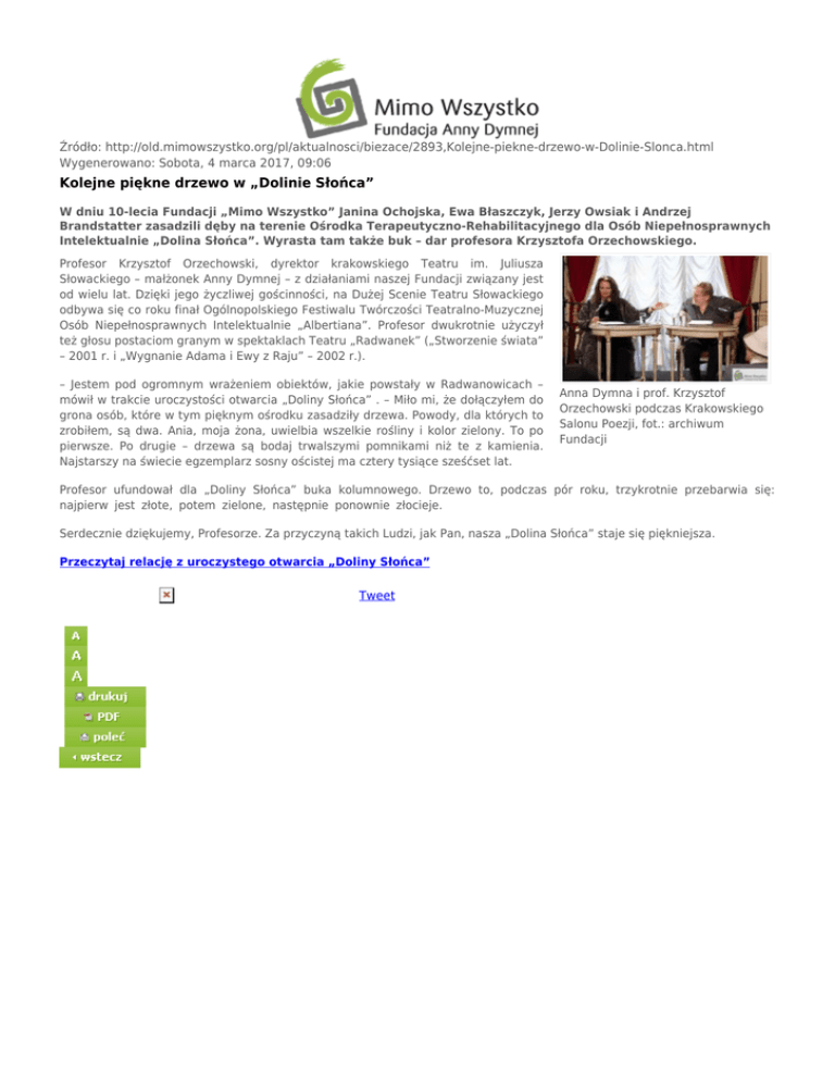 Źródło: http://old.mimowszystko.org/pl/aktualnosci/biezace/2893,Kolejne-piekne-drzewo-w-Dolinie-Slonca.html Wygenerowano: Sobota, 4 marca 2017, 09:06 Kolejne piękne drzewo w „Dolinie Słońca” W dniu 10-lecia Fundacji „Mimo Wszystko” Janina Ochojska, Ewa Błaszczyk, Jerzy Owsiak i Andrzej Brandstatter zasadzili dęby na terenie Ośrodka Terapeutyczno-Rehabilitacyjnego dla Osób Niepełnosprawnych Intelektualnie „Dolina Słońca”. Wyrasta tam także buk – dar profesora Krzysztofa Orzechowskiego. Profesor Krzysztof Orzechowski, dyrektor krakowskiego Teatru im. Juliusza Słowackiego – małżonek Anny Dymnej – z działaniami naszej Fundacji związany jest od wielu lat. Dzięki jego życzliwej gościnności, na Dużej Scenie Teatru Słowackiego odbywa się co roku finał Ogólnopolskiego Festiwalu Twórczości Teatralno-Muzycznej Osób Niepełnosprawnych Intelektualnie „Albertiana”. Profesor dwukrotnie użyczył też głosu postaciom granym w spektaklach Teatru „Radwanek” („Stworzenie świata” – 2001 r. i „Wygnanie Adama i Ewy z Raju” – 2002 r.). – Jestem pod ogromnym wrażeniem obiektów, jakie powstały w Radwanowicach – mówił w trakcie uroczystości otwarcia „Doliny Słońca” . – Miło mi, że dołączyłem do grona osób, które w tym pięknym ośrodku zasadziły drzewa. Powody, dla których to zrobiłem, są dwa. Ania, moja żona, uwielbia wszelkie rośliny i kolor zielony. To po pierwsze. Po drugie – drzewa są bodaj trwalszymi pomnikami niż te z kamienia. Najstarszy na świecie egzemplarz sosny ościstej ma cztery tysiące sześćset lat. Anna Dymna i prof. Krzysztof Orzechowski podczas Krakowskiego Salonu Poezji, fot.: archiwum Fundacji Profesor ufundował dla „Doliny Słońca” buka kolumnowego. Drzewo to, podczas pór roku, trzykrotnie przebarwia się: najpierw jest złote, potem zielone, następnie ponownie złocieje. Serdecznie dziękujemy, Profesorze. Za przyczyną takich Ludzi, jak Pan, nasza „Dolina Słońca” staje się piękniejsza. Przeczytaj relację z uroczystego otwarcia „Doliny Słońca” Tweet