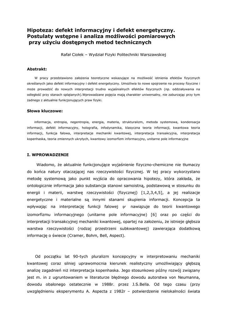 Hipoteza: defekt informacyjny i defekt energetyczny. Postulaty wstępne i analiza możliwości pomiarowych przy użyciu dostępnych metod technicznych Rafał Ciołek – Wydział Fizyki Politechniki Warszawskiej Abstrakt: W pracy przedstawiono założenia teoretyczne wskazujące na możliwość istnienia efektów fizycznych określanych jako defekt informacyjny i defekt energetyczny. Umożliwia to nowe spojrzenie na procesy fizyczne i może prowadzić do nowych interpretacji trudno wyjaśnialnych efektów fizycznych (np. oddziaływania na odległość przy stanach splątanych).Wprowadzane pojęcia mają charakter uniwersalny, nie zaburzając przy tym żadnego z aktualnie funkcjonujących praw fizyki. Słowa kluczowe: informacja, entropia, negentropia, energia, materia, strukturalizm, metoda systemowa, kondensacja informacji, defekt informacyjny, holografia, infodynamika, klasyczna teoria informacji, kwantowa teoria informacji, funkcja falowa, interpretacje mechaniki kwantowej, interpretacja transakcyjna, interpretacja kopenhaska, teoria zmiennych ukrytych, kwantowy izomorfizm informacyjny, unitarne pole informacyjne I. WPROWADZENIE Wiadomo, że aktualnie funkcjonujące wyjaśnienie fizyczno-chemiczne nie tłumaczy do końca natury otaczającej nas rzeczywistości fizycznej. W tej pracy wykorzystano metodę systemową jako punkt wyjścia do opracowania hipotezy, która zakłada, że ontologicznie informacja jako substancja stanowi samoistną, podstawową w stosunku do energii i materii, warstwę rzeczywistości (fizycznej) [1,2,3,4,5], a jej realizacje energetyczne i materialne są innymi stanami skupienia informacji. Koncepcja ta wpływając na interpretację funkcji falowej ψ nawiązuje do teorii kwantowego izomorfizmu informacyjnego (unitarne pole informacyjne) [6] oraz po części do interpretacji transakcyjnej mechaniki kwantowej, opartej na założeniu, że istnieje głębsza warstwa rzeczywistości (rodzaj przestrzeni subkwantowej) zawierająca dodatkową informację o świecie (Cramer, Bohm, Bell, Aspect). Od początku lat 90-tych pluralizm koncepcyjny w interpretowaniu mechaniki kwantowej coraz silniej uprawomocnia kierunek realistyczny umożliwiający głębszą analizę zagadnień niż interpretacja kopenhaska. Jego stosunkowo późny rozwój związany jest m. in z ugruntowaniem w literaturze błędnego dowodu autorstwa von Neumanna, dowodu obalonego ostatecznie w 1988r. przez J.S.Bella. Od tego czasu (przy uwzględnieniu eksperymentu A. Aspecta z 1982r – potwierdzenie nielokalności świata kwantów) stał się on generatorem olbrzymiego skoku w rozwoju teorii kwantowych, w szczególności sukcesów kwantowej teorii informacji. Metoda systemowa użyta w tej pracy jako nośnik logiczny dla omawianego problemu to sposób opisu rzeczywistości, w którym wszystko, co istnieje jest elementem większego systemu, do którego byt (obiekt) w sensie ontologicznym należy (Hartmann, Białobrzeski). Konsekwentne wprowadzenie filozofii systemowej wymaga stosowania nowych pojęć i strukturalistycznego języka. Metoda systemowa w konsekwencji zmienia sposób widzenia relacji całość-część. Wynikają z tego określone konsekwencje ontologiczne i epistemologiczne. Metodę systemową można przedstawić w trzech tezach: 1. Wszystkie istniejące byty są systemami. System charakteryzuje się strukturą. Struktura stanowi o naturze bytów, 2. Poznanie jest względne tzn. odniesione jest zawsze do podmiotu poznającego, będącego systemem poznającym (podejście relatywistyczne), 3. Relacja całość – część (system – element) ma następujące właściwości: a. całość nie jest sumą części (całość nie jest redukowalna do części), b. całość określa właściwości części (właściwości części wynikają z funkcjonowania części w całości), c. część poznawalna jest zawsze jako element całości, d. części nie istnieją poza całością, e. części stale oddziałują na siebie modyfikując swoje właściwości, System jest, więc podstawowym i pierwotnym pojęciem określającym wszystko, co istnieje, całą rzeczywistość i jej elementy będące również systemami (podsystemami). W każdym systemie możemy wyróżnić elementy i strukturę, dzięki której elementy tworzą system. To, co identyfikuje system decydując o jego tożsamości jest jego strukturą (informacją), elementy są wtórne względem struktury, są podporządkowane strukturze całości. System i struktura (informacja) stają się, więc podstawowymi kategoriami ontologicznymi. II. HIPOTEZA DEFEKT INFORMACYJNY I DEFEKT ENERGETYCZNY. TEORIA Na podstawie poniższych postulatów, 2 1. Materia i energia są formami kondensacji (formami skupienia) treści, którą w sensie ontologicznym (substancjalnym) jest informacja. Kondensacje powyższe można przedstawić za pomocą wzorów: M = K M (E) [1.01] E = K E (H ) [1.02] 2. Korzystając z [1.01] i [1.02], materię, energię i informację można przedstawić ∑K wzorem Einsteina, E ( H ) + K M ( K E ( H )) ⋅ c 2 = const [1.1] przez jego uogólnienie przedstawione poniżej [5], K E ( H ) K M ( K E ( H )) ⋅ c 2 = const ∑H + k + 10 7 ⋅ k [1.2] gdzie: k - stała Boltzmanna, k = 1,38 · 10-23 [J/K] H - uogólniona negentropia (informacja) w bitach [b] E - energia w dżulach [J] M - masa układu w gramach [g] uwzględniająca jej przyrost przy prędkościach KM ( H ) = rzędu prędkości światła K M0 ( H ) ν 1− c 2 [1.3] c - prędkość światła, c = 299 792 458 [m/s] Z równania [1.2] według [5] wynika poniższa relacja ilościowa: 1[ kg ] = 1017 [ J ] = 10 40 [b ] [1.4] Przy uwzględnieniu: I. Zasady równoważności energii i materii, co wyraża się wzorem Einsteina [1.7] i wynikających z niej zasad zachowania energii i zachowania masy, jak również faktu istnienia defektu masy - zamiany materii w energię – efekt ubytku masy na rzecz energii wiązań przy syntezie np. 2 atomów wodoru H w cząsteczkę H2 i odwrotnie – zam