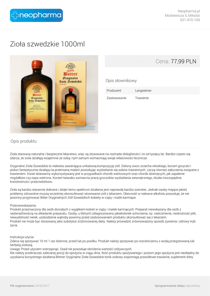 Neopharma.pl Mickiewicza 5, Mikstat 531-470-109 Zioła szwedzkie 1000ml Cena: 77,99 PLN Opis słownikowy Producent Langsteiner Zastosowanie Trawienie Opis produktu Zioła stanowią naturalne i bezpieczne lekarstwo, więc są stosowane na rozmaite dolegliwości i to od tysięcy lat. Bardzo często się zdarza, że zioła działają wzajemnie ze sobą i tym samym wzmacniają swoje właściwości lecznicze. Oryginalne Zioła Szwedzkie to nalewka zawierająca unikatową kompozycję ziół. Zielony owoc orzecha włoskiego, korzeń goryczki i piołun fantastycznie działają na przemianę materii powodując wydzielanie się soków trawiennych. Leczą również zaburzenia związane z trawieniem. Kwiat dziewanny wykorzystywany jest w przypadkach chorób wieńcowych oraz chorób dziecięcych, jak zapalenie migdałków czy ospa wietrzna. Korzeń tataraku wzmacnia pracę gruczołów wydzielania wewnętrznego, działa moczopędnie, krwiotwórczo i przeciwbólowo. Zioła są bardzo starannie dobrane i dzięki temu spektrum działania jest naprawdę bardzo szerokie. Jednak osoby mające jakieś problemy zdrowotne muszą wcześniej skonsultować stosowanie ziół z lekarzem. Obecność w nalewce alkoholu powoduje, że nie powinny przyjmować Bitter Oryginalnych Ziół Szwedzkich kobiety w ciąży i matki karmiące. Przeciwwskazania: Produkt przeznaczony dla osób dorosłych z wyjątkiem kobiet w ciąży i matek karmiących. Preparat niewskazany dla osób z nadwrażliwością na składaniki preparatu. Osoby, u których zdiagnozowano jakiekolwiek schorzenia, np. nadciśnienie, niedrożność jelit, niewydolność nerek, uszkodzenie wątroby powinny przed zastosowaniem produktu skonsultować się z lekarzem. Produkt nie może byc stosowany jako substytut zróżnicowanej diety. Należy prowadzić zrównoważony sposób zywienia i zdrowy tryb życia. Instrukcja użycia: Zaleca się spożywać 15 ml 1 raz dziennie, przed lub po posiłku. Produkt należy spożywać po rozcieńczeniu z wodą przegotowaną lub herbatą ziołową. Uwaga: Przed użyciem wstrząsnąć. Osad nie powoduje obniżenia wartośći odżywczych. Nie należy przekraczać zalecanej porcji do spożycia w ciągu dnia. Ilość produktu spożywanego i poziom jego spożycia jest niezbędny do uzyskania korzystnego działania.Bittner Oryginalne Zioła Szwedzkie tonik ziołowy wspomaga prawidłowe trawienie, suplement diety Plik wygenerowano: 04-03-2017 Oprogramowanie sklepu: AptusShop Neopharma.pl Mickiewicza 5, Mikstat 531-470-109 Suplement diety tonik ziołowy Bittner Oryginalne Zioła Szwedzkie polecany jest dla dobrego trawienia i przyswajania składników odżywczych dostarczanych w pożywieniu. Dodatkowo pomaga zachować dobre sampopoczucie po jedzeniu. Specjalnie wyselekcjonowana unikatowa kompozycja 25 ziół głównie goryczkowych i aromatyczno-gorzkich. Wspomaga prawidłowe trawienie dzięki temu, że : wspomaga dobre przyswajanie składników odżywczych dostarczanych w pożywieniu, pomaga zachować dobre samopoczucie po jedzeniu, ułatwia proces trawienia, normalizuje funkcjonowanie przewodu pokarmowego. Przyjęty przed jedzeniem przyczynia się do poprawy apetytu Nie zawiera alkoholu: idealny dla osób rezygnujących z nalewek alkoholowych wspomagających trawienie. Idealny dla pacjentów preferujących płynne formy preparatów. Plik wygenerowano: 04-03-2017 Powered by TCPDF (www.tcpdf.org) Oprogramowanie sklepu: AptusShop