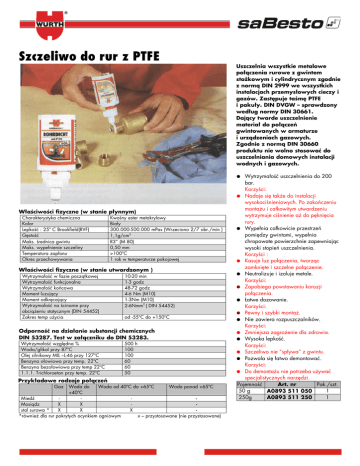 Szczeliwo do rur z PTFE Właściwości fizyczne (w stanie płynnym) Charakterystyka chemiczna Kolor Lepkość : 25º C Brookfield(RVF) Gęstość Maks. średnica gwintu Maks. wypełnienie szczeliny Temperatura zapłonu Okres przechowywania Kwaśny ester metakrylowy Biały 300.000-500.000 mPas (Wrzeciono 2/7 obr./min ) 1,1g/cm3 R3” (M 80) 0,50 mm >100ºC 1 rok w temperaturze pokojowej Właściwości fizyczne (w stanie utwardzonym ) Wytrzymałość w fazie początkowej Wytrzymałość funkcjonalna Wytrzymałość końcowa Moment luzujący Moment odkręcający Wytrzymałość na ścinanie przy obciążeniu statycznym (DIN 54452) Zakres temp użycia 10-20 min 1-3 godz 48-72 godz 4-6 Nm (M10) 1-3Nm (M10) 2-6Nmm2 ( DIN 54452) od -55ºC do +150ºC Odporność na działanie substancji chemicznych DIN 53287. Test w załączniku do DIN 53283. Wytrzymałość względna % Woda/glikol przy 87ºC Olej silnikowy MIL –L-46 przy 127ºC Benzyna ołowiowa przy temp. 22ºC Benzyna bezołowiowa przy temp 22ºC 1.1.1. Trichloroetan przy temp. 22ºC 500 h 100 100 60 60 50 Przykładowe rodzaje połączeń Gaz Woda do Woda od 40ºC do +65ºC Woda ponad +65ºC +40ºC Miedź Mosiądz X X stal surowa * X X X *również dla rur pokrytych ocynkiem ogniowym x – przystosowane (nie przystosowane) Uszczelnia wszystkie metalowe połączenia rurowe z gwintem stożkowym i cylindrycznym zgodnie z normą DIN 2999 we wszystkich instalacjach przemysłowych cieczy i gazów. Zastępuje taśmę PTFE i pakuły. DIN DVGW – sprawdzony według normy DIN 30661. Dający twarde uszczelnienie materiał do połączeń gwintowanych w armaturze i urządzeniach gazowych. Zgodnie z normą DIN 30660 produktu nie wolno stosować do uszczelniania domowych instalacji wodnych i gazowych. ● Wytrzymałość uszczelnienia do 200 bar. Korzyści: ● Nadaje się także do instalacji wysokociśnieniowych. Po zakończeniu montażu i całkowitym utwardzeniu wytrzymuje ciśnienie aż do pęknięcia rury. ● Wypełnia całkowicie przestrzeń pomiędzy gwintami, wypełnia chropowate powierzchnie zapewniając wysoki stopień uszczelnienia. Korzyści : ● Kasuje luz połączenia, tworząc zamknięte i szczelne połączenie. ● Neutralizuje i izoluje metale. Korzyści: ● Zapobiega powstawaniu korozji połączenia. ● Łatwe dozowanie. Korzyści: ● Pewny i szybki montaż. ● Nie zawiera rozpuszczalników. Korzyści: ● Zmniejsza zagrożenie dla zdrowia. ● Wysoka lepkość. Korzyści: ● Szczeliwo nie “spływa” z gwintu. ● Pozwala się łatwo demontować. Korzyści: ● Do demontażu nie potrzeba używać specjalistycznych narzędzi. Pojemność Pak./szt. Art. nr 50 g 1 A0893 511 050 250g 1 A0893 511 250