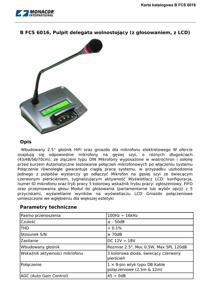 Karta katalogowa B FCS 6016 B FCS 6016, Pulpit delegata wolnostojący (z głosowaniem, z LCD) Opis Wbudowany 2.5” głośnik HiFi oraz gniazdo dla mikrofonu elektretowego W ofercie znajdują się odpowiednie mikrofony na gęsiej szyi, o różnych długościach (43/48/56/70cm), ze złączem typu DIN Mikrofony wyposażone w wiatrochron i osłonę przed kurzem Automatyczne testowanie połączeń mikrofonowych po włączeniu systemu Połączenie równoległe gwarantuje ciągłą pracę systemu, w przypadku uszkodzenia jednego z pulpitów wystarczy go odłączyć Mikrofon na gęsiej szyi ze świecącym czerwonym pierścieniem, sygnalizującym aktywność Wyświetlacz LCD: konfiguracja, numer ID mikrofonu oraz tryb pracy 3 kolorowy wskaźnik trybu pracy: zgłoszeniowy, FIFO oraz przejmowania głosu Moduł do głosowania (parlamentarne lub wybór opcji) z 5 przyciskami, wyświetlanie wyników na wyświetlaczu LCD Gniazdo połączeniowe umieszczone we wgłębieniu dla większej estetyki Parametry techniczne Pasmo przenoszenia 100Hz ÷ 16kHz Czułość ≥ - 50dB THD < 0.1% Stosunek S/N ≥ 70dB Zasilanie DC 12V ÷ 18V Wbudowany głośnik Rozmiar 2.5", Moc 0.5W, Max SPL 120dB Wskaźnik aktywności mikrofonu 3 kolorowa dioda, świecący czerwony pierścień Połączenie 1 × 9-pin wtyk typu DB Kable połączeniowe (2.5m & 12m) AGC (Auto Gain Control) 45 ÷ 0dB Karta katalogowa B FCS 6016 Gniazdo słuchawkowe 3.5mm stereo Gniazdo REC 3.5mm stereo Wymiary (W × S × D) 53.6 × 169.3 × 131.8mm Waga 990g Materiał podstawy Stop cynkowo-aluminiowy, mata antypoślizgowa Materiał obudowy Tworzywo ABS 2/2 Powered by TCPDF (www.tcpdf.org)
