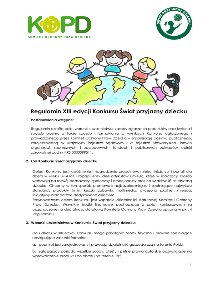 Regulamin XIII edycji Konkursu Świat przyjazny dziecku 1. Postanowienia wstępne: Regulamin określa cele, warunki uczestnictwa, zasady zgłaszania produktów oraz kryteria i sposób oceny, a także sposób informowania o wynikach Konkursu ogłoszonego i prowadzonego przez Komitet Ochrony Praw Dziecka – organizację pożytku publicznego, zarejestrowaną w Krajowym Rejestrze Sądowym w rejestrze stowarzyszeń, innych organizacji społecznych i zawodowych, fundacji i publicznych zakładów opieki zdrowotnej pod nr KRS 0000099511. 2. Cel Konkursu Świat przyjazny dziecku: Celem Konkursu jest wyróżnienie i nagrodzenie produktów, miejsc, inicjatyw i portali dla dzieci w wieku 0-14 lat. Propagujemy idee artykułów i miejsc, które w znaczący sposób wpływają na rozwój poznawczy, społeczny i emocjonalny oraz na wrażliwość estetyczną dziecka. Chcemy w ten sposób promować najbezpieczniejsze i spełniające najwyższe standardy produkty (m.in. książki, zabawki, multimedia, akcesoria szkolne), miejsca, inicjatywy oraz portale dedykowane dzieciom. Równoważnym celem konkursu jest wsparcie działalności statutowej Komitetu Ochrony Praw Dziecka. Wszystkie środki finansowe pochodzące z opłat konkursowych są przeznaczane na działalność statutową Komitetu Ochrony Praw Dziecka opisaną w pkt. 4 Regulaminu. 3. Warunki uczestnictwa w Konkursie Świat przyjazny dziecku: Do udziału w XIII edycji Konkursu mogą przystąpić osoby fizyczne i prawne spełniające następujące warunki formalne: a. podmiot jest zarejestrowany i prowadzi działalność gospodarczą na terenie Polski; b. zgłaszający posiada wszelkie zgody, atesty i pełne prawa autorskie pozwalające na wprowadzenie produktu do obrotu na terenie RP; 1 c. zgłaszane produkty są dostępne na rynku i/lub są zawarte w ofercie Zgłaszającego; d. firma spełnia wymagania określone prawem polskim oraz podlega nadzorowi polskich instytucji (PIH, Sanepid itd.); e. przesłanie ankiety rejestracyjnej wraz z dowodem opłaty konkursowej wg. Cennika. Kategoria Kultura (książki, audiobooki, płyty z muzyką dla dzieci, pisma dla dzieci, gry komputerowe, filmy, kasety audio, programy edukacyjne, inne multimedia) Pierwszy Kolejny produkt/ produkt miejsce Seria 500,00 100,00 700,00 Inicjatywy i wydarzenia dla dzieci 600, 00 300,00 - Zabawa (zabawki, akcesoria sportowe, gry edukacyjne) 1 000,00 500,00 1600,00 Bezpieczeństwo dziecka (foteliki, odblaski, wózki, smoczki, butelki, pieluchy) 1 000,00 500,00 1600,00 Miejsca przyjazne dzieciom (place zabaw, kluby, księgarnie, miejsca eventowe, sieci handlowe, restauracje, kawiarnie) 1 500,00 1 000,00 - Zdrowie (kliniki, szpitale, uzdrowiska, poradnie, kosmetyki dziecięce) 1 500,00 1 000,00 - 1 000,00 500,00 1600,00 Dom (meble, pościel, naczynia, wanienki, lampki, dywany, wyposażenie pokoju dziecka) 2 Dziecko w szkole (pomoce szkolne, piórniki, lunch boxy) Dziecko i Internet (portale, sklepy) Ekologia w życiu dziecka Rehabilitacja dziecka 1 000,00 500,00 1600,00 1000 500,00 - 500 100 - 1000 500 - Pod słowem „seria” rozumie się – szereg odrębnych produktów (wydawnictw, zabawek oraz innych przedmiotów), które ostatecznie składają się w jedną całość, gdyż połączone są jednakowym znakiem, tematem, bądź innym wyróżnikiem zespalającym produkty w jedną całość. W przypadku wątpliwości, prawo do rozstrzygnięcia, które ze zgłoszonych produktów stanowią serię, pozostaje w gestii KOPD. Zgłaszający ma obowiązek podania dokładnej nazwy Firmy oraz opisu, nazwy i kategorii zgłaszanego produktu/miejsca. Nadesłane nazwy będą zamieszczane na materiałach dotyczących Konkursu bez możliwości ich zmiany. f. Opłaty Konkursowe należy dokonywać na konto KOPD: Raiffeisen Bank Polska S.A nr konta: 56 1750 0009 0000 0000 0094 6389. 4. Zasady zgłaszania produktów w Konkursie Świat przyjazny dziecku. Produkty do Konkursu Świat przyjazny dziecku można zgłaszać do 3 listopada 2014r. Zgłoszenie do Konkursu może zostać utajnione na życzenie uczestnika Konkursu. Aby przystąpić do XIII edycji Konkursu należy: 1. przesłać na adres e-mail [email protected] wypełnioną ankietę rejestracyjną (dla każdego produktu i miejsca/ inicjatywy/portalu osobną). Ankiety są dostępne do pobrania na stronie internetowej www.kopd.pl w zakładce zatytułowanej Konkurs Świat przyjazny dziecku. Ankiety można również otrzymać mailowo po wcześniejszym zgłoszeniu zapotrzebowania na adres: [email protected] 3 Informacja o przyjęciu produktu do Konkursu Świat przyjazny dziecku zostanie przekazana Zgłaszającemu mailowo w ciągu 7 dni od daty otrzymania ankiety rejestracyjnej. Po potwierdzeniu ze strony KOPD przyjęcia zgłoszenia do Konkursu należy przesłać zgłoszony produkt/produkty, a w przypadku miejsc/inicjatyw/portali opisy oraz linki do stron www. 2. przesłać na adres e-mail: [email protected] dwa zdjęcia produktów – w opakowaniu i bez opakowania. W przypadku miejsc 2 zdjęcia wybrane przez Zgłaszającego. Przyjmujemy zdjęcia w formacie jpg., o wielkości nieprzekraczającej 1 MG. Zdjęcia będą zamieszczane na wszystkich materiałach dotyczących Konkursu, bez możliwości ich zamiany, dlatego prosimy o rozmyślne decyzje i przesyłanie najbardziej reprezentacyjnych zdjęć zgłaszanych produktów i miejsc. Bardzo prosimy o dokładne opisanie zdjęć wg. wzoru: NAZWA PRODUKTU_NAZWA FIRMY. UWAGA!: Z powodów organizacyjnych, nie będzie możliwości dosyłania kolejnych zdjęć. Udział w Konkursie Świat przyjazny dziecku jest jednoznaczny ze wsparciem działalności charytatywnej KOPD poprzez dokonanie opłaty konkursowej. Środki finansowe przeznaczane są na działania statutowe KOPD, czyli: bezpłatną pomoc prawną i psychologiczną; diagnozę dzieci wykorzystywanych seksualnie; mediacje rodzinne; terapię psychologiczną dziecka i rodziny; porady prawne porady psychologiczno – pedagogiczne. Opłatę konkursową w formie darowiz