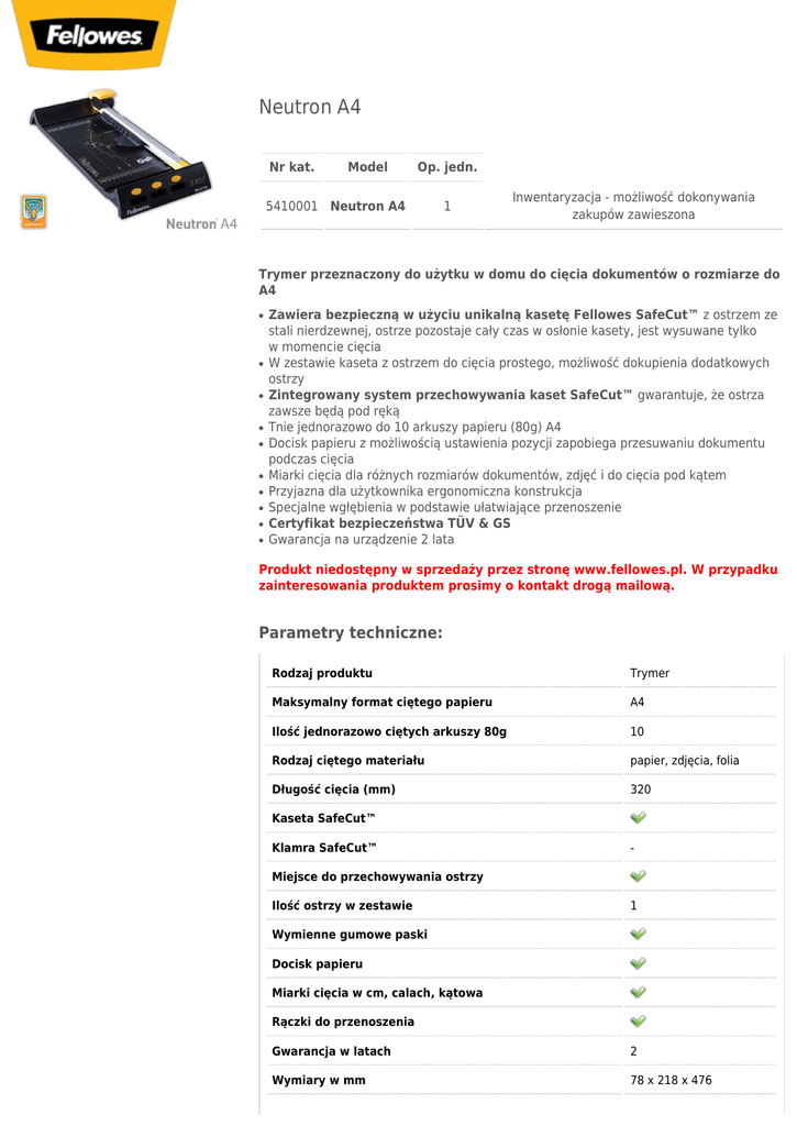 Neutron A4 Nr kat. Model Op. jedn. 5410001 Neutron A4 1 Inwentaryzacja - możliwość dokonywania zakupów zawieszona Trymer przeznaczony do użytku w domu do cięcia dokumentów o rozmiarze do A4 ● ● ● ● ● ● ● ● ● ● Zawiera bezpieczną w użyciu unikalną kasetę Fellowes SafeCut™ z ostrzem ze stali nierdzewnej, ostrze pozostaje cały czas w osłonie kasety, jest wysuwane tylko w momencie cięcia W zestawie kaseta z ostrzem do cięcia prostego, możliwość dokupienia dodatkowych ostrzy Zintegrowany system przechowywania kaset SafeCut™ gwarantuje, że ostrza zawsze będą pod ręką Tnie jednorazowo do 10 arkuszy papieru (80g) A4 Docisk papieru z możliwością ustawienia pozycji zapobiega przesuwaniu dokumentu podczas cięcia Miarki cięcia dla różnych rozmiarów dokumentów, zdjęć i do cięcia pod kątem Przyjazna dla użytkownika ergonomiczna konstrukcja Specjalne wgłębienia w podstawie ułatwiające przenoszenie Certyfikat bezpieczeństwa TÜV & GS Gwarancja na urządzenie 2 lata Produkt niedostępny w sprzedaży przez stronę www.fellowes.pl. W przypadku zainteresowania produktem prosimy o kontakt drogą mailową. Parametry techniczne: Rodzaj produktu Trymer Maksymalny format ciętego papieru A4 Ilość jednorazowo ciętych arkuszy 80g 10 Rodzaj ciętego materiału papier, zdjęcia, folia Długość cięcia (mm) 320 Kaseta SafeCut™ Klamra SafeCut™ - Miejsce do przechowywania ostrzy Ilość ostrzy w zestawie 1 Wymienne gumowe paski Docisk papieru Miarki cięcia w cm, calach, kątowa Rączki do przenoszenia Gwarancja w latach 2 Wymiary w mm 78 x 218 x 476 Waga w kg 0,82 Nr katalogowy 5410001