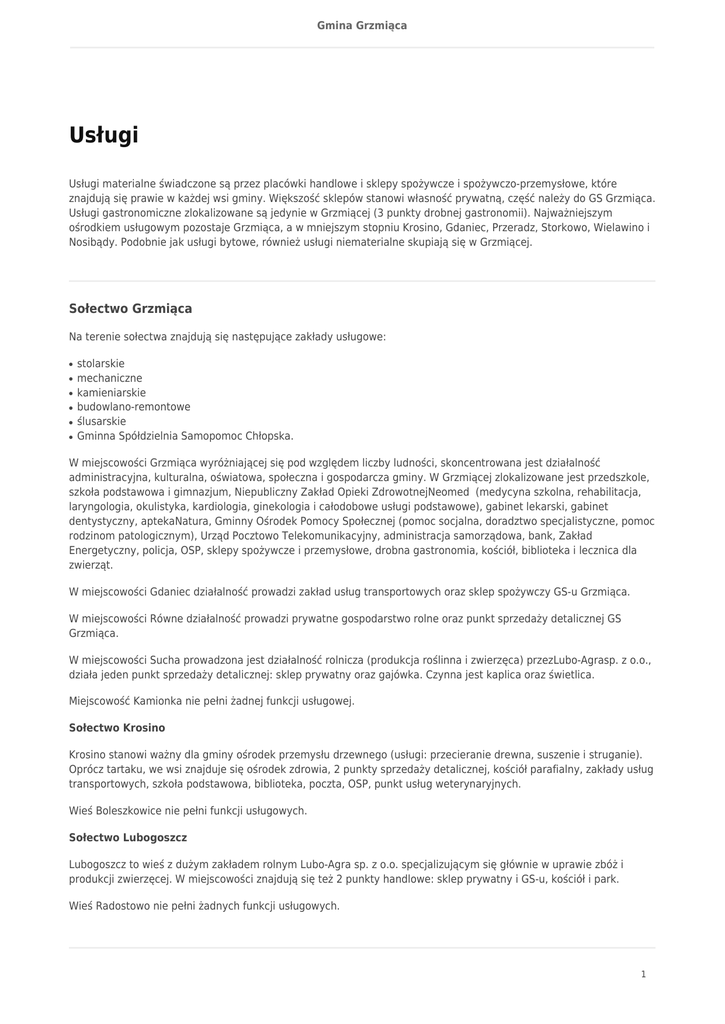 Gmina Grzmiąca Usługi Usługi materialne świadczone są przez placówki handlowe i sklepy spożywcze i spożywczo-przemysłowe, które znajdują się prawie w każdej wsi gminy. Większość sklepów stanowi własność prywatną, część należy do GS Grzmiąca. Usługi gastronomiczne zlokalizowane są jedynie w Grzmiącej (3 punkty drobnej gastronomii). Najważniejszym ośrodkiem usługowym pozostaje Grzmiąca, a w mniejszym stopniu Krosino, Gdaniec, Przeradz, Storkowo, Wielawino i Nosibądy. Podobnie jak usługi bytowe, również usługi niematerialne skupiają się w Grzmiącej. Sołectwo Grzmiąca Na terenie sołectwa znajdują się następujące zakłady usługowe: ● ● ● ● ● ● stolarskie mechaniczne kamieniarskie budowlano-remontowe ślusarskie Gminna Spółdzielnia Samopomoc Chłopska. W miejscowości Grzmiąca wyróżniającej się pod względem liczby ludności, skoncentrowana jest działalność administracyjna, kulturalna, oświatowa, społeczna i gospodarcza gminy. W Grzmiącej zlokalizowane jest przedszkole, szkoła podstawowa i gimnazjum, Niepubliczny Zakład Opieki ZdrowotnejNeomed (medycyna szkolna, rehabilitacja, laryngologia, okulistyka, kardiologia, ginekologia i całodobowe usługi podstawowe), gabinet lekarski, gabinet dentystyczny, aptekaNatura, Gminny Ośrodek Pomocy Społecznej (pomoc socjalna, doradztwo specjalistyczne, pomoc rodzinom patologicznym), Urząd Pocztowo Telekomunikacyjny, administracja samorządowa, bank, Zakład Energetyczny, policja, OSP, sklepy spożywcze i przemysłowe, drobna gastronomia, kościół, biblioteka i lecznica dla zwierząt. W miejscowości Gdaniec działalność prowadzi zakład usług transportowych oraz sklep spożywczy GS-u Grzmiąca. W miejscowości Równe działalność prowadzi prywatne gospodarstwo rolne oraz punkt sprzedaży detalicznej GS Grzmiąca. W miejscowości Sucha prowadzona jest działalność rolnicza (produkcja roślinna i zwierzęca) przezLubo-Agrasp. z o.o., działa jeden punkt sprzedaży detalicznej: sklep prywatny oraz gajówka. Czynna jest kaplica oraz świetlica. Miejscowość Kamionka nie pełni żadnej funkcji usługowej. Sołectwo Krosino Krosino stanowi ważny dla gminy ośrodek przemysłu drzewnego (usługi: przecieranie drewna, suszenie i struganie). Oprócz tartaku, we wsi znajduje się ośrodek zdrowia, 2 punkty sprzedaży detalicznej, kościół parafialny, zakłady usług transportowych, szkoła podstawowa, biblioteka, poczta, OSP, punkt usług weterynaryjnych. Wieś Boleszkowice nie pełni funkcji usługowych. Sołectwo Lubogoszcz Lubogoszcz to wieś z dużym zakładem rolnym Lubo-Agra sp. z o.o. specjalizującym się głównie w uprawie zbóż i produkcji zwierzęcej. W miejscowości znajdują się też 2 punkty handlowe: sklep prywatny i GS-u, kościół i park. Wieś Radostowo nie pełni żadnych funkcji usługowych. 1 Gmina Grzmiąca Sołectwo Nosibądy We wsi Nosibądy zlokalizowane są dwa punkty handlowe, dom kultury z biblioteką. Sołectwo Czechy Wieś Czechy posiada 2 sklepy prywatne, bibliotekę i świetlicę w budynku byłej szkoły oraz kościół filialny. Sołectwo Mieszałki We wsi Mieszałki znajduje się Rolnicza Spółdzielnia Produkcyjna (w likwidacji), szkoła podstawowa, sklepy: prywatny i GS-u Grzmiąca, kościół parafialny, zakład usługowy robót kamieniarskich, zakład usług leśnych. W skład sołectwa wchodzi również miejscowość Ubocze gdzie zlokalizowany jest zakładu usług leśnych. Sołectwo Przerad Wieś Przeradz leży przy ważnej linii kolejowej Kołobrzeg-Poznań (przystanek kolejowy), posiada 2 sklepy - prywatny i GS-u Grzmiąca, salę wiejską, prywatny zakład usług transportowych, kościół filialny i agencję pocztową. W skład sołectwa wchodzi osada Owczary bez znaczenia usługowego. Sołectwo lwin Miejscowość Iwin położona jest przy szlaku kolejowym Kołobrzeg-Poznań. We wsi znajdują się 2 sklepy: prywatny i GS-u Grzmiąca, stacja kolejowa, szkoła podstawowa, leśnictwo i Zakład Usług Leśnych. Sołectwo Wielawino W Wielawinie znajdują się dwa sklepy: prywatny i GS-u, kościół, Dom Kultury, biblioteka oraz zakład wyrobów z drewna. W Żarnowie działa prywatny ośrodek hodowli ryb - głównie pstrąga. Sołectwo Przystawy We wsi Przystawy znajduje się sklep prywatny i leśnictwo. W Sławnie funkcjonuje prywatny sklep. Sołectwo Godzisław W Godzisławiu czynny jest sklep spożywczo-przemysłowy GS Grzmiąca. Sołectwo Storkowo Wieś Storkowo posiada 2 sklepy GS-u Grzmiaca i sklep prywatny, OSP, zakład stolarski, zakład remontowo-budowlany. Sołectwo ma na swym terenie dawny młyn gospodarczy nad Parsętą z 1909 r., obecnie zamieniony na placówkę naukowo-badawczą Stację Geoekologiczną Uniwersytetu im. Adama Mickiewicza, w której również funkcjonuje mała elektrownia wodna. Sołectwo Radomyśl We wsi Radomyśl znajduje się sklep prywatny spożywczo-przemysłowy. W koloni Pustkowie nad rzeką Parsętą działa prywatna elektrownia wodna. 2 Gmina Grzmiąca Sołectwo Wielanowo W Wielanowie znajduje się przywatny sklep sopżywczo - przemysłowy i działa Zakład Produkcji Torfowej . Sołectwo Radusz Wieś Radusz nie pełni żadnych funkcji usługowych. 3