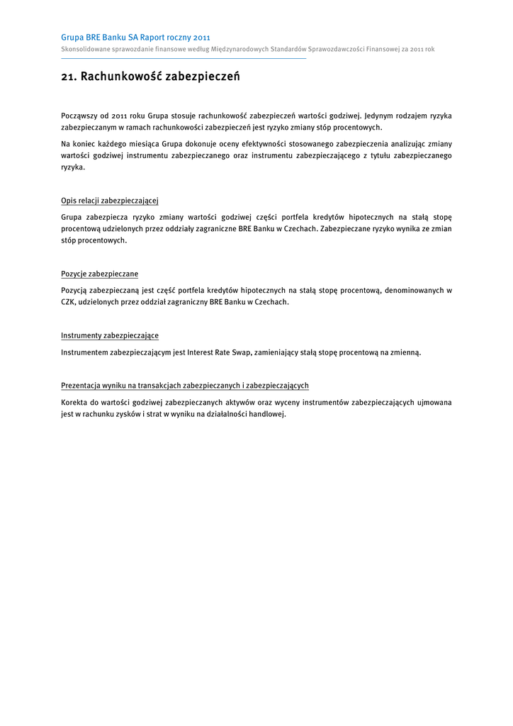 Grupa BRE Banku SA Raport roczny 2011 Skonsolidowane sprawozdanie finansowe według Międzynarodowych Standardów Sprawozdawczości Finansowej za 2011 rok 21. Rachunkowość zabezpieczeń Począwszy od 2011 roku Grupa stosuje rachunkowość zabezpieczeń wartości godziwej. Jedynym rodzajem ryzyka zabezpieczanym w ramach rachunkowości zabezpieczeń jest ryzyko zmiany stóp procentowych. Na koniec każdego miesiąca Grupa dokonuje oceny efektywności stosowanego zabezpieczenia analizując zmiany wartości godziwej instrumentu zabezpieczanego oraz instrumentu zabezpieczającego z tytułu zabezpieczanego ryzyka. Opis relacji zabezpieczającej Grupa zabezpiecza ryzyko zmiany wartości godziwej części portfela kredytów hipotecznych na stałą stopę procentową udzielonych przez oddziały zagraniczne BRE Banku w Czechach. Zabezpieczane ryzyko wynika ze zmian stóp procentowych. Pozycje zabezpieczane Pozycją zabezpieczaną jest część portfela kredytów hipotecznych na stałą stopę procentową, denominowanych w CZK, udzielonych przez oddział zagraniczny BRE Banku w Czechach. Instrumenty zabezpieczające Instrumentem zabezpieczającym jest Interest Rate Swap, zamieniający stałą stopę procentową na zmienną. Prezentacja wyniku na transakcjach zabezpieczanych i zabezpieczających Korekta do wartości godziwej zabezpieczanych aktywów oraz wyceny instrumentów zabezpieczających ujmowana jest w rachunku zysków i strat w wyniku na działalności handlowej.