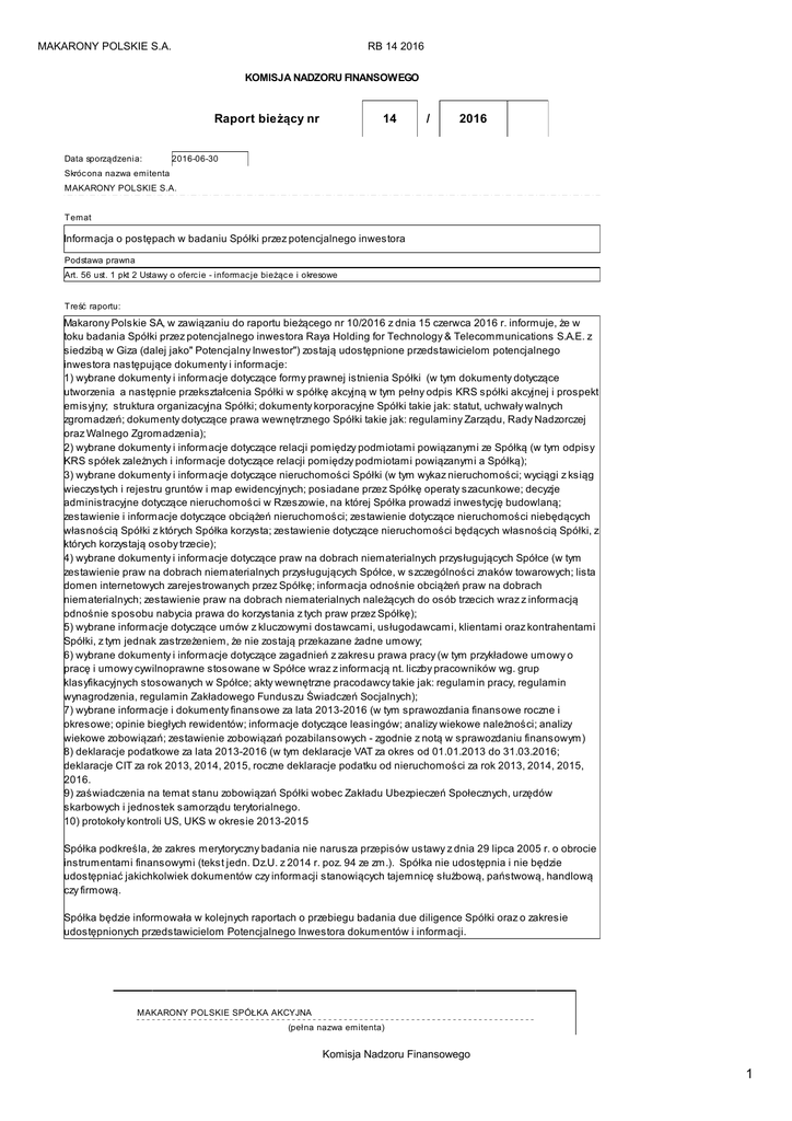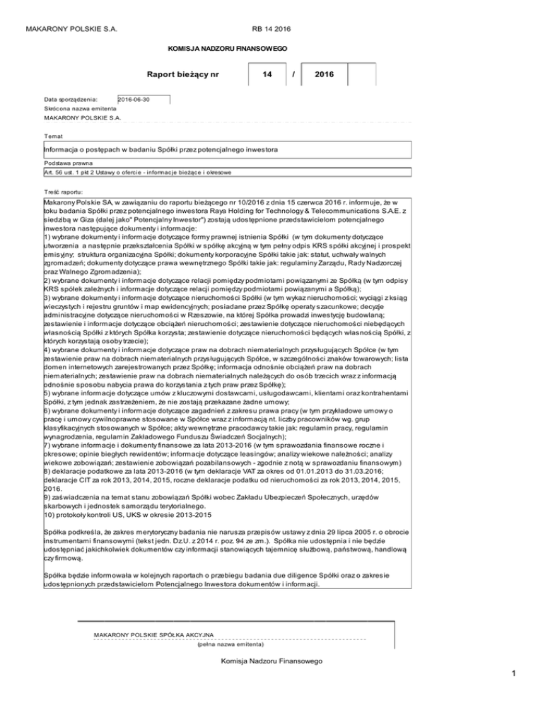 MAKARONY POLSKIE S.A. RB 14 2016 KOMISJA NADZORU FINANSOWEGO Raport bieżący nr Data sporządzenia: 14 / 2016 2016-06-30 Skróc ona nazwa emitenta MAKARONY POLSKIE S.A. Temat Informacja o postępach w badaniu Spółki przez potencjalnego inwestora Podstawa prawna Art. 56 ust. 1 pkt 2 Ustawy o oferc ie - informac je bieżąc e i okresowe Treść raportu: Makarony Polskie SA, w zawiązaniu do raportu bieżącego nr 10/2016 z dnia 15 czerwca 2016 r. informuje, że w toku badania Spółki przez potencjalnego inwestora Raya Holding for Technology & Telecommunications S.A.E. z siedzibą w Giza (dalej jako" Potencjalny Inwestor") zostają udostępnione przedstawicielom potencjalnego inwestora następujące dokumenty i informacje: 1) wybrane dokumenty i informacje dotyczące formy prawnej istnienia Spółki (w tym dokumenty dotyczące utworzenia a następnie przekształcenia Spółki w spółkę akcyjną w tym pełny odpis KRS spółki akcyjnej i prospekt emisyjny; struktura organizacyjna Spółki; dokumenty korporacyjne Spółki takie jak: statut, uchwały walnych zgromadzeń; dokumenty dotyczące prawa wewnętrznego Spółki takie jak: regulaminy Zarządu, Rady Nadzorczej oraz Walnego Zgromadzenia); 2) wybrane dokumenty i informacje dotyczące relacji pomiędzy podmiotami powiązanymi ze Spółką (w tym odpisy KRS spółek zależnych i informacje dotyczące relacji pomiędzy podmiotami powiązanymi a Spółką); 3) wybrane dokumenty i informacje dotyczące nieruchomości Spółki (w tym wykaz nieruchomości; wyciągi z ksiąg wieczystych i rejestru gruntów i map ewidencyjnych; posiadane przez Spółkę operaty szacunkowe; decyzje administracyjne dotyczące nieruchomości w Rzeszowie, na której Spółka prowadzi inwestycję budowlaną; zestawienie i informacje dotyczące obciążeń nieruchomości; zestawienie dotyczące nieruchomości niebędących własnością Spółki z których Spółka korzysta; zestawienie dotyczące nieruchomości będących własnością Spółki, z których korzystają osoby trzecie); 4) wybrane dokumenty i informacje dotyczące praw na dobrach niematerialnych przysługujących Spółce (w tym zestawienie praw na dobrach niematerialnych przysługujących Spółce, w szczególności znaków towarowych; lista domen internetowych zarejestrowanych przez Spółkę; informacja odnośnie obciążeń praw na dobrach niematerialnych; zestawienie praw na dobrach niematerialnych należących do osób trzecich wraz z informacją odnośnie sposobu nabycia prawa do korzystania z tych praw przez Spółkę); 5) wybrane informacje dotyczące umów z kluczowymi dostawcami, usługodawcami, klientami oraz kontrahentami Spółki, z tym jednak zastrzeżeniem, że nie zostają przekazane żadne umowy; 6) wybrane dokumenty i informacje dotyczące zagadnień z zakresu prawa pracy (w tym przykładowe umowy o pracę i umowy cywilnoprawne stosowane w Spółce wraz z informacją nt. liczby pracowników wg. grup klasyfikacyjnych stosowanych w Spółce; akty wewnętrzne pracodawcy takie jak: regulamin pracy, regulamin wynagrodzenia, regulamin Zakładowego Funduszu Świadczeń Socjalnych); 7) wybrane informacje i dokumenty finansowe za lata 2013-2016 (w tym sprawozdania finansowe roczne i okresowe; opinie biegłych rewidentów; informacje dotyczące leasingów; analizy wiekowe należności; analizy wiekowe zobowiązań; zestawienie zobowiązań pozabilansowych - zgodnie z notą w sprawozdaniu finansowym) 8) deklaracje podatkowe za lata 2013-2016 (w tym deklaracje VAT za okres od 01.01.2013 do 31.03.2016; deklaracje CIT za rok 2013, 2014, 2015, roczne deklaracje podatku od nieruchomości za rok 2013, 2014, 2015, 2016. 9) zaświadczenia na temat stanu zobowiązań Spółki wobec Zakładu Ubezpieczeń Społecznych, urzędów skarbowych i jednostek samorządu terytorialnego. 10) protokoły kontroli US, UKS w okresie 2013-2015 Spółka podkreśla, że zakres merytoryczny badania nie narusza przepisów ustawy z dnia 29 lipca 2005 r. o obrocie instrumentami finansowymi (tekst jedn. Dz.U. z 2014 r. poz. 94 ze zm.). Spółka nie udostępnia i nie będzie udostępniać jakichkolwiek dokumentów czy informacji stanowiących tajemnicę służbową, państwową, handlową czy firmową. Spółka będzie informowała w kolejnych raportach o przebiegu badania due diligence Spółki oraz o zakresie udostępnionych przedstawicielom Potencjalnego Inwestora dokumentów i informacji. MAKARONY POLSKIE SPÓŁKA AKCYJNA (pełna nazwa emitenta) Komisja Nadzoru Finansowego 1 MAKARONY POLSKIE S.A. RB 14 2016 MAKARONY POLSKIE S.A. Spożywc zy (spo) (skróc ona nazwa emitenta) 35-082 (sektor wg. klasyfikac ji GPW w W-wie) Rzeszów (kod poc ztowy) (miejscowość) Podkarpac ka 15a (ulica) (numer) 017 8753010 017 8753020 (telefon) (fax) [email protected] www.makarony.pl (e-mail) (www) 8133278856 691674708 (NIP) (REGON) PODPISY OSÓB REPREZENTUJĄCYCH SPÓŁKĘ Data Imię i Nazwisko Stanowisko/Funkc ja 2016-06-30 Beata Majewska-Karp Prokurent 2016-06-30 Piotr Wyszecki Prokurent Podpis Komisja Nadzoru Finansowego 2