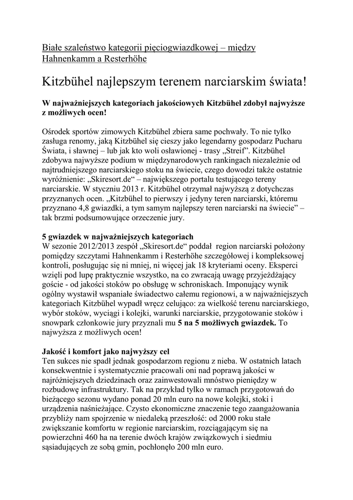 Białe szaleństwo kategorii pięciogwiazdkowej – między Hahnenkamm a Resterhöhe Kitzbühel najlepszym terenem narciarskim świata! W najważniejszych kategoriach jakościowych Kitzbühel zdobył najwyższe z możliwych ocen! Ośrodek sportów zimowych Kitzbühel zbiera same pochwały. To nie tylko zasługa renomy, jaką Kitzbühel się cieszy jako legendarny gospodarz Pucharu Świata, i sławnej – lub jak kto woli osławionej - trasy „Streif”. Kitzbühel zdobywa najwyższe podium w międzynarodowych rankingach niezależnie od najtrudniejszego narciarskiego stoku na świecie, czego dowodzi także ostatnie wyróżnienie: „Skiresort.de“ – największego portalu testującego tereny narciarskie. W styczniu 2013 r. Kitzbühel otrzymał najwyższą z dotychczas przyznanych ocen. „Kitzbühel to pierwszy i jedyny teren narciarski, któremu przyznano 4,8 gwiazdki, a tym samym najlepszy teren narciarski na świecie” – tak brzmi podsumowujące orzeczenie jury. 5 gwiazdek w najważniejszych kategoriach W sezonie 2012/2013 zespół „Skiresort.de“ poddał region narciarski położony pomiędzy szczytami Hahnenkamm i Resterhöhe szczegółowej i kompleksowej kontroli, posługując się ni mniej, ni więcej jak 18 kryteriami oceny. Eksperci wzięli pod lupę praktycznie wszystko, na co zwracają uwagę przyjeżdżający goście - od jakości stoków po obsługę w schroniskach. Imponujący wynik ogólny wystawił wspaniałe świadectwo całemu regionowi, a w najważniejszych kategoriach Kitzbühel wypadł wręcz celująco: za wielkość terenu narciarskiego, wybór stoków, wyciągi i kolejki, warunki narciarskie, przygotowanie stoków i snowpark członkowie jury przyznali mu 5 na 5 możliwych gwiazdek. To najwyższa z możliwych ocen! Jakość i komfort jako najwyższy cel Ten sukces nie spadł jednak gospodarzom regionu z nieba. W ostatnich latach konsekwentnie i systematycznie pracowali oni nad poprawą jakości w najróżniejszych dziedzinach oraz zainwestowali mnóstwo pieniędzy w rozbudowę infrastruktury. Tak na przykład tylko w ramach przygotowań do bieżącego sezonu wydano ponad 20 mln euro na nowe kolejki, stoki i urządzenia naśnieżające. Czysto ekonomiczne znaczenie tego zaangażowania przybliży nam spojrzenie w niedaleką przeszłość: od 2000 roku stałe zwiększanie komfortu w regionie narciarskim, rozciągającym się na powierzchni 460 ha na terenie dwóch krajów związkowych i siedmiu sąsiadujących ze sobą gmin, pochłonęło 200 mln euro. „Bergbahnen Kitzbühel są oczywiście dumne z tego prestiżowego wyróżnienia” – z radością przyznaje prezes zarządu kolei górskich Bergbahnen Kitzbühel dr Josef Burger – „Stanowi ono efekt naszych konsekwentnych starań, zmierzających w kierunku stałego zwiększania komfortu i poprawy jakości obsługi naszych gości.” INFORMACJA Pomiędzy szczytami Hahnenkamm i Resterhöhe leży jeden z najnowocześniejszych terenów narciarskich w regionie alpejskim. Koleje górskie Bergbahn AG Kitzbühel dysponują 52 supernowoczesnymi kolejkami linowymi i wyciągami, które umożliwiają dostęp do 170 km stoków. Część z nich cieszy się światową sławą - np. legendarny "Streif" czy słynny "Ganslernhang”. Dzięki korzystnemu północno-zachodniemu położeniu terenu, sprzyjającemu opadom orograficznym, oraz rozległym obszarom hal, doskonała pokrywa śniegowa kusi narciarzy przez 150 (!) dni w roku, od listopada aż do początku maja. O tym, że gastronomiczna oferta schronisk i après ski w „mieście kozic” (Kitzbühel) również wyróżniają się jakością, co roku przyciągając sławy z całego świata, przekonacie się sami na miejscu.