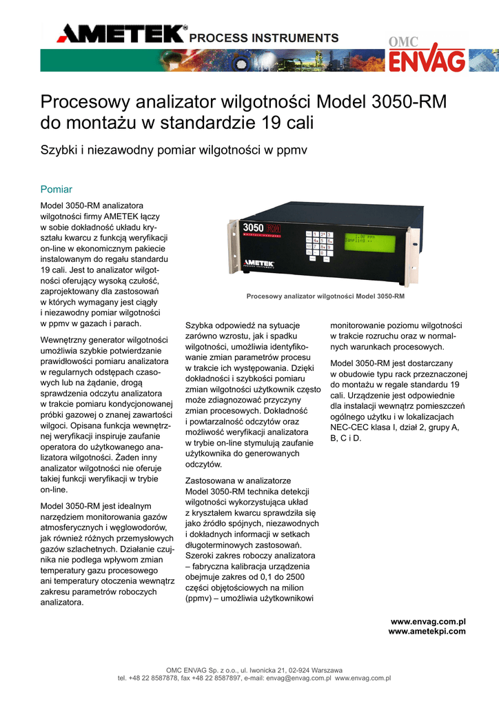 Procesowy analizator wilgotności Model 3050-RM do montażu w standardzie 19 cali Szybki i niezawodny pomiar wilgotności w ppmv Pomiar Model 3050-RM analizatora wilgotności firmy AMETEK łączy w sobie dokładność układu kryształu kwarcu z funkcją weryfikacji on-line w ekonomicznym pakiecie instalowanym do regału standardu 19 cali. Jest to analizator wilgotności oferujący wysoką czułość, zaprojektowany dla zastosowań w których wymagany jest ciągły i niezawodny pomiar wilgotności w ppmv w gazach i parach. Wewnętrzny generator wilgotności umożliwia szybkie potwierdzanie prawidłowości pomiaru analizatora w regularnych odstępach czasowych lub na żądanie, drogą sprawdzenia odczytu analizatora w trakcie pomiaru kondycjonowanej próbki gazowej o znanej zawartości wilgoci. Opisana funkcja wewnętrznej weryfikacji inspiruje zaufanie operatora do użytkowanego analizatora wilgotności. Żaden inny analizator wilgotności nie oferuje takiej funkcji weryfikacji w trybie on-line. Model 3050-RM jest idealnym narzędziem monitorowania gazów atmosferycznych i węglowodorów, jak również różnych przemysłowych gazów szlachetnych. Działanie czujnika nie podlega wpływom zmian temperatury gazu procesowego ani temperatury otoczenia wewnątrz zakresu parametrów roboczych analizatora. Procesowy analizator wilgotności Model 3050-RM Szybka odpowiedź na sytuacje zarówno wzrostu, jak i spadku wilgotności, umożliwia identyfikowanie zmian parametrów procesu w trakcie ich występowania. Dzięki dokładności i szybkości pomiaru zmian wilgotności użytkownik często może zdiagnozować przyczyny zmian procesowych. Dokładność i powtarzalność odczytów oraz możliwość weryfikacji analizatora w trybie on-line stymulują zaufanie użytkownika do generowanych odczytów. monitorowanie poziomu wilgotności w trakcie rozruchu oraz w normalnych warunkach procesowych. Model 3050-RM jest dostarczany w obudowie typu rack przeznaczonej do montażu w regale standardu 19 cali. Urządzenie jest odpowiednie dla instalacji wewnątrz pomieszczeń ogólnego użytku i w lokalizacjach NEC-CEC klasa I, dział 2, grupy A, B, C i D. Zastosowana w analizatorze Model 3050-RM technika detekcji wilgotności wykorzystująca układ z kryształem kwarcu sprawdziła się jako źródło spójnych, niezawodnych i dokładnych informacji w setkach długoterminowych zastosowań. Szeroki zakres roboczy analizatora ‒ fabryczna kalibracja urządzenia obejmuje zakres od 0,1 do 2500 części objętościowych na milion (ppmv) ‒ umożliwia użytkownikowi www.envag.com.pl www.ametekpi.com OMC ENVAG Sp. z o.o., ul. Iwonicka 21, 02-924 Warszawa tel. +48 22 8587878, fax +48 22 8587897, e-mail: [email protected] www.envag.com.pl Procesowy analizator wilgotności Model 3050-RM, rack 19” Dane techniczne Technika pomiaru: Mikrorównowaga kryształu kwarcowego Zakres: Kalibracja od 0,1 do 2500 części objętościowych na milion (ppmv). Możliwość odczytu w ppmw, lb/mmscf, mg/Nm3, oraz jako punkt rosy w °C lub °F (wymagane wejście ciśnienia procesowego) Gaz referencyjny: Ciągłe wytwarzanie na bazie rzeczywistej próbki gazowej Weryfikacja on-line: Wewnętrzne źródło wilgotności z kalibracją identyfikowalną w systemie NIST umożliwia weryfikację dokładności i odpowiedzi analizatora na żądanie bez potrzeby odinstalowania przyrządu Dokładność: ± 0,1 ppmv lub 10 % odczytu od 1 do 2500 ppmv z kalibracją standardową; zakresy z kalibracją specjalną nie są wymagane Powtarzalność: ± 5,0 % odczytu od 1 do 2500 ppmv Limit detekcji: 0,1 ppmv Rozdzielczość konwersji a/c: 16 bitów (0,0015 %) Czas odpowiedzi układu kryształu kwarcu (QCM): Zbliżony do czasu rzeczywistego. Uzyskanie szybkiej odpowiedzi w sytuacjach znacznych wzrostów i spadków wilgotności nie wymaga komputerowej obróbki sygnału, mogącej prowadzić do błędów. Czułość: 0,1 ppmv lub 1 % odczytu, większa z tych wartości Ciśnienie wlotu próbki: Wymagane: 138 do 345 kPa (20 do 50 psig); ciśnienie procesu nie wpływa na pracę analizatora Ciśnienie wylotu: 0 do 103 kPa (0 do 15 psig) Temperatura próbki gazowej: 0 do 100 °C (32 do 212 °F); zmiany temperatury próbki gazowej nie mają wpływu na pracę analizatora Wymagany przepływ próbki: Około 150 Nml/min (150 sccm). Przepływ bocznikowy około 1,0 Nl/min dla skrócenia czasu odpowiedzi Zakres temperatur otoczenia: 5 do 50 °C (41 do 122 °F) Prezentacja wyników, sygnały wyjścia: Wyświetlacz LCD 4 wiersze po 20 znaków; izolowany sygnał analogowy 4 - 20 mA, rozdzielczość 12 bitów (0,025 %), szeregowe porty komunikacyjne RS232 oraz RS485 Alarmy: Trzy styki sygnałowe: alarm systemowy, ważność danych i alarm stężenia Wymagane zasilanie: 85 do 265 V, 47 do 63 Hz, 185 W Zamontowanie: Instalacja rack 19 cali lub na stole roboczym Wymiary: (szer. x wys. x głęb.) 48,3 x 13,3 x 41,9 cm (19 x 5,25 x 16,5 in) Ciężar netto: 11,4 kg (25 lb) Aprobaty, certyfikacja: CE Certyfikaty zgodności: Ogólne wymagania bezpieczeństwa UL/CSA NEC/CEC klasa I, dział 2, grupy A, B, C, D T4 Dodatkowe komponenty systemu transportu próbki Dla pełnego wykorzystania zalet analizatora Model 3050-RM konieczne jest zapewnienie prawidłowo zaprojektowanego systemu transportu próbki. Firma AMETEK może dostarczyć kompletny system transportu próbki obejmujący następujące komponenty: Filtry: Filtry liniowe lub bocznikowe dla usuwania cząstek pyłowych ze strumieni gazowych lub ciekłych, oraz filtry usuwające niewielkie ilości olejów lub innych substancji kondensujących ze strumieni gazów. Reduktor ciśnienia: Wymagany jeżeli źródło próbki pozostaje pod ciśnieniem wyższym niż 3,3 bar (50 psi). Maksymalne ciśnienie wlotowe wynosi 200 bar (3000 psi). Grzany reduktor ciśnienia: Zaprojektowany dla uniknięcia kondensacji gazów w trakcie redukcji ciśnienia lub dla zapewnienia odparowywania strumieni skroplonego gazu o punkcie wrzenia nieprzekraczającym 40 