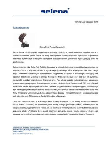 Wrocław, 22 listopada 2010 Informacja prasowa Selena Perłą Polskiej Gospodarki Grupa Selena – holding spółek prowadzących produkcję i dystrybucję chemii budowlanej na całym świecie – została uhonorowana tytułem Perły w VIII edycji Rankingu Pereł Polskiej Gospodarki. WyróŜnienie, przyznawane najbardziej dynamicznym i efektywnie działającym przedsiębiorstwom, potwierdziło wysoką pozycję spółki na polskim rynku. Selena otrzymała tytuł DuŜej Perły Polskiej Gospodarki w kategorii obejmującej przedsiębiorstwa osiągające co najmniej 100 mln zł przychodu rocznie. W tegorocznej edycji Rankingu udział wzięło ponad 1000 firm z całego kraju. Zestawienie wyróŜnionych przedsiębiorstw przygotowano w oparciu o metodologię oceniającą całe spektrum działalności. O pozycji w rankingu decyduje nie tylko poziom przychodów, lecz takŜe ich dynamika, rentowność sprzedaŜy oraz płynność finansowa firmy. Przy uŜyciu narzędzi matematycznych i wskaźników powszechnie uŜywanych przez firmy audytorskie, eksperci z Instytutu Nauk Ekonomicznych PAN zidentyfikowali spółki, które najbardziej efektywnie zarządzają kapitałem, majątkiem trwałym i wydajnością pracy. Rankingi tego typu wskazują najskuteczniejsze sposoby operowania na rynku i promują wzorce warte naśladowania przez inne firmy. WyróŜnienie w imieniu Grupy Selena odebrał Prezes Zarządu – Krzysztof Domarecki – podczas uroczystej gali, która odbyła się 19 listopada na Zamku Królewskim w Warszawie. „Jest nam niezmiernie miło, Ŝe w Rankingu Pereł Polskiej Gospodarki po raz kolejny doceniono działalność Grupy Selena. To dowód, Ŝe realizowana przez Spółkę strategia globalnego rozwoju, skoncentrowana na osiągnięciu silnej pozycji zarówno w Polsce, jak i na światowych rynkach produktów chemii budowlanej, przynosi pozytywne efekty. WyróŜnienie to w sposób obiektywny potwierdza jakość i model biznesowy Seleny oraz motywuje nas do dalszej, konsekwentnej realizacji planów rozwoju Spółki” – powiedział Krzysztof Domarecki. Dodatkowych informacji udzielą Państwu: Eliza Misiecka, Katarzyna Szafader, Aneta Rudaś GENESIS PR (22) 327 1690, (601) 697-477 Tytułem DuŜej Perły Polskiej Gospodarki Selena uhonorowana została juŜ drugi rok z rzędu, natomiast produkty i dynamiczny rozwój Grupy doceniane są takŜe na arenie międzynarodowej. Selena dołączyła równieŜ do przedsiębiorstw oferujących najwyŜszej jakości towary i usługi w Kazachstanie, gdzie produkty Spółki zostały wyróŜnione Narodowym Znakiem Jakości ‘Godny Zaufania’. Grupa Selena osiągnęła narastająco po 3 kwartałach 2010 roku najwyŜsze w swojej historii przychody ze sprzedaŜy w wysokości 652,1 mln zł, co oznacza wzrost o 36% w stosunku do analogicznego okresu roku ubiegłego. Zysk netto wyniósł 27,8 mln zł przy rentowności 4,3%, zaś zysk operacyjny ukształtował się na poziomie 34,5 mln zł. Dobre rezultaty finansowe Seleny osiągnięte zostały pomimo niedoborów na rynkach surowców i dalszego wzrostu ich cen oraz umocnienia się złotówki. Dodatkowych informacji udzielą Państwu: Eliza Misiecka, Katarzyna Szafader, Aneta Rudaś GENESIS PR (22) 327 1690, (601) 697-477