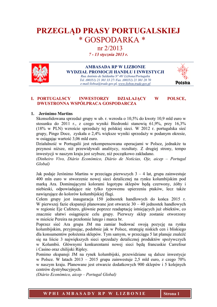 PRZEGLĄD PRASY PORTUGALSKIEJ * GOSPODARKA * nr 2/2013 7 - 13 stycznia 2013 r. AMBASADA RP W LIZBONIE WYDZIAŁ PROMOCJI HANDLU I INWESTYCJI Rua António de Saldanha Nº 48/ Lizbona/Portugalia Tel. (00351) 21 301 33 27/ Fax. (00351) 21 301 28 70 e-mail:[email protected], www.lisbon.trade.gov.pl I. PORTUGALSCY INWESTORZY DZIAŁAJĄCY DWUSTRONNA WSPÓŁPRACA GOSPODARCZA 1. W POLSCE, Jerónimo Martins Skonsolidowana sprzedaż grupy w ub. r. wzrosła o 10,5% do kwoty 10,9 mld euro w stosunku do 2011 r., z czego wyniki Biedronki stanowią 61,9%, przy 16,3% (18% w PLN) wzroście sprzedaży tej polskiej sieci. W 2012 r. portugalska sieć grupy, Pingo Doce, zyskała o 2,4% większe wyniki sprzedaży w podanym okresie, w osiągając wartość 3,06 mld euro. Działalność w Portugalii jest rekompensowana operacjami w Polsce, jednakże ta przynosi niższe, niż przewidywali analitycy, rezultaty. Z drugiej strony, tempo inwestycji w naszym kraju jest szybsze, niż początkowo zakładano. (Dinheiro Vivo, Diário Económico, Diário de Notícias, Oje, aicep – Portugal Global) Jak podaje Jerónimo Martins w przeciągu pierwszych 3 – 4 lat, grupa zainwestuje 400 mln euro w stworzenie nowej sieci detalicznej na rynku kolumbijskim pod marką Ara. Dominującymi kolorami logotypu sklepów będą czerwony, żółty i niebieski, odpowiadające nie tylko typowemu upierzeniu ptaków, lecz także nawiązujące do kolorów kolumbijskiej flagi. Celem grupy jest inauguracja 150 jednostek handlowych do końca 2015 r. W pierwszej fazie ekspansji planowane jest otwarcie 30 – 40 jednostek handlowych w regionie Eje Cafetero, głównie poprzez readaptację istniejących już obiektów, co znacznie ułatwi osiągnięcie celu grupy. Pierwszy sklep zostanie otworzony w mieście Pereira na przełomie lutego i marca br. Poprzez sieć Ara grupa JM ma zamiar budować swoją pozycję na rynku kolumbijskim, przyjmując, podobnie jak w Polsce, strategię niskich cen i bliskiego dla konsumentów położenia sklepów. Tym samym, w przeciągu 5 lat planuje znaleźć się na liście 3 największych sieci sprzedaży detalicznej produktów spożywczych w Kolumbii. Głównymi konkurentami nowej sieci będą francuskie Carrefour i Casino oraz chilijski Ripley. Pomimo ekspansji JM na rynek kolumbijski, przewidziane są dalsze inwestycje w Polsce. W latach 2013 – 2015 grupa zainwestuje 2,5 mld euro, z czego 70% w naszym kraju. Planowane jest otwarcie dodatkowych 900 sklepów i 5 kolejnych centrów dystrybucyjnych. (Diário Económico, aicep – Portugal Global) WPHI AMBASADY RP W LIZBONIE Strona 1 PRZEGLĄD PRASY PORTUGALSKIEJ “GOSPODARKA” - nr 2/2013 Dziennik Expresso opublikował wywiad z prezesem Jerónimo Martins, Alexandre Soares dos Santos. Poza komentarzami obejmującymi obecną sytuację w kraju, prezes JM poinformował o prawdopodobnych planach ekspansji grupy na nowe rynki, w tym południowoamerykańskie, afrykańskie czy ukraiński. Ponadto, podkreśla on wielokrotnie znaczenie, jakie miało dla JM rozpoczęcie działalności w Polsce, które było przełomowe dla rozwoju grupy. (Expresso) 2. Mota-Engil Jorge Coelho z przyczyn osobistych zrezygnował z pełnienia funkcji prezesa MotaEngil. Jego stanowisko zajmie Gonçalo Moura Martins, dotychczasowy członek zarządu Mota-Engil ds. finansowych, pracujący w firmie od 23 lat. W pierwszych wywiadach nowy prezes podkreśla, że ma zamiar kontynuować ogłoszony w sierpniu 2012 r. plan Ambição 2.0, który zakłada wzrost wielkości obrotów o 45% do 2015 r., w stosunku do wyników z 2011 r., tj. 2,2 mld euro. Ponadto, chce aby firma przenanalizowała nowe rynki. (Jornal de Negócios, Diário de Notícias, Diário Económico, Oje, Expresso, Dinheiro Vivo, aicep – Portugal Global) W wywiadzie udzielonym dla Dinheiro Vivo, prezes rady nadzorczej Mota-Engil, António Mota, zapewnia, że strategicznym planem grupy jest zmiana modelu zarządzania, tj. zamiast podziału na subholdingi wg dziedzin, bedzie on zależał od regionu, czyli: Portugalia i Hiszpania, Europa Środkowa, Ameryka Łacińska oraz Afryka. W wideo udostępnionym na stronie internetowej dziennika, prezes mówi o tym, iż łatwiejsze jest płacenie podatków w Holandii niż w Portugalii w odniesieniu do działalności Mota-Engil w naszym kraju. (Dinheiro Vivo) 3. Banco Comercial Português BCP W ramach procesu restrukturyzacji, który zakładał zmniejszenie liczby pracowników o 600, BCP ostatecznie zredukuje kadry o co najmniej 150 osób więcej, poprzez ich przejście na wcześniejszą emeryturę. Bank oficjalnie nie komentuje tych doniesień. We wrześniu ub. r. w BCP pracowało ok. 10 tys. osób. (Vida Económica, Jornal de Negócios, Oje) Jak informuje portugalska prasa, największy polski bank pod względem aktywów, PKO Bank Polski, jest zainteresowaniem zakupem Millennium Bank, jednakże BCP nie planuje sprzedaży swych aktywów w Polsce. (Jornal de Negócios) 4. Glintt W najbliższych miesiącach Glintt Energy będzie prowadził negocjacje z sektorem energetycznym w Polsce w celu nawiązania współpracy. Oddział firmy, Glintt Polska Sp. z o.o., działa obecnie głównie w obszarze komercjalizacji rozwiązań robotyki dla klinik i aptek. W planach tego portugalskiego przedsiębiorstwa jest wyszukiwanie dalszych możliwości współpracy i poszerzenie swojej oferty na naszym rozwijającym się rynku. Glintt zamierza także prowadzić dalszą ekspansję, wg schematu zastosowanego w Polsce, na inne rynki Europy Środkowej, po umocnieniu swojej pozycji na naszym rynku. Przedsiębiorstwo już świadczy usługi WPHI AMBASADY RP W LIZBONIE Strona 2 PRZEGLĄD PRASY PORTUGALSKIEJ “GOSPODARKA” - nr 2/2013 technologiczne w Belgii, Holandii, Niemczech, Anglii, Francji i Szwajcarii. Przy okazji Diário Económico podkreśla, że Polska jest jedną z najbardziej obiecujących gospodarek UE, a jej wzrost PKB w br. szacuje się na 1,75%. (Diário Económico, aicep – Portugal Global) 5. Amorim Corticeira Amo
