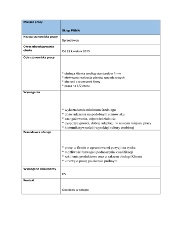 Miejsce pracy Sklep PUMA Nazwa stanowiska pracy Sprzedawca Okres obowiązywania oferty Od 22 kwietnia 2015 Opis stanowiska pracy * obsługa klienta według standardów firmy * efektywna realizacja planów sprzedażowych * dbałość o wizerunek firmy * praca na 1/2 etatu Wymagania * wykształcenia minimum średniego * doświadczenia na podobnym stanowisku * zaangażowania, odpowiedzialności * dyspozycyjności, dobrej adaptacji w nowym miejscu pracy * komunikatywności i wysokiej kultury osobistej Pracodawca oferuje * pracę w firmie o ugruntowanej pozycji na rynku * możliwość rozwoju i podnoszenia kwalifikacji * szkolenia produktowe oraz z zakresu obsługi Klienta * umowę o pracę po okresie próbnym Wymagane dokumenty CV Kontakt Osobiście w sklepie